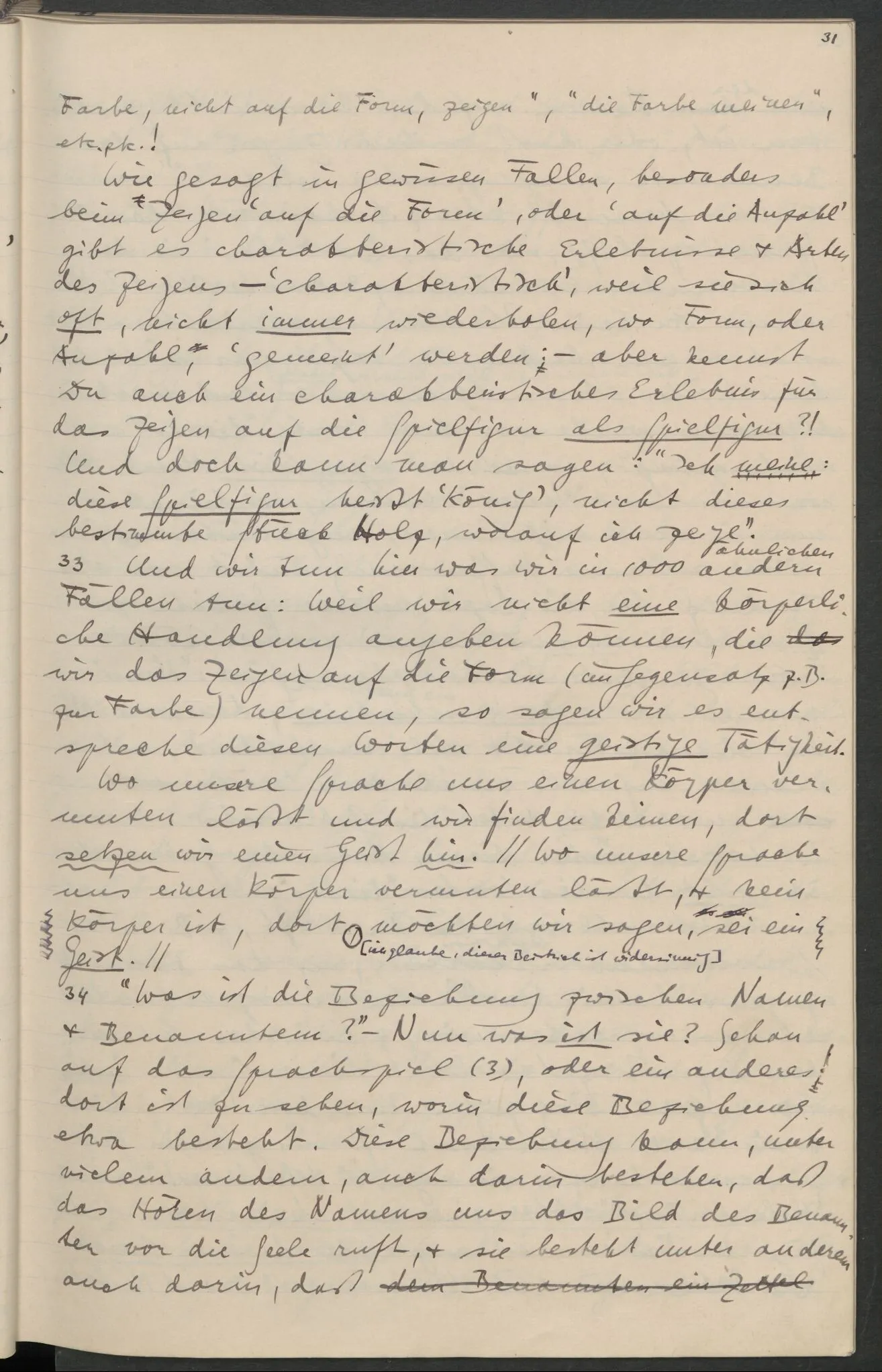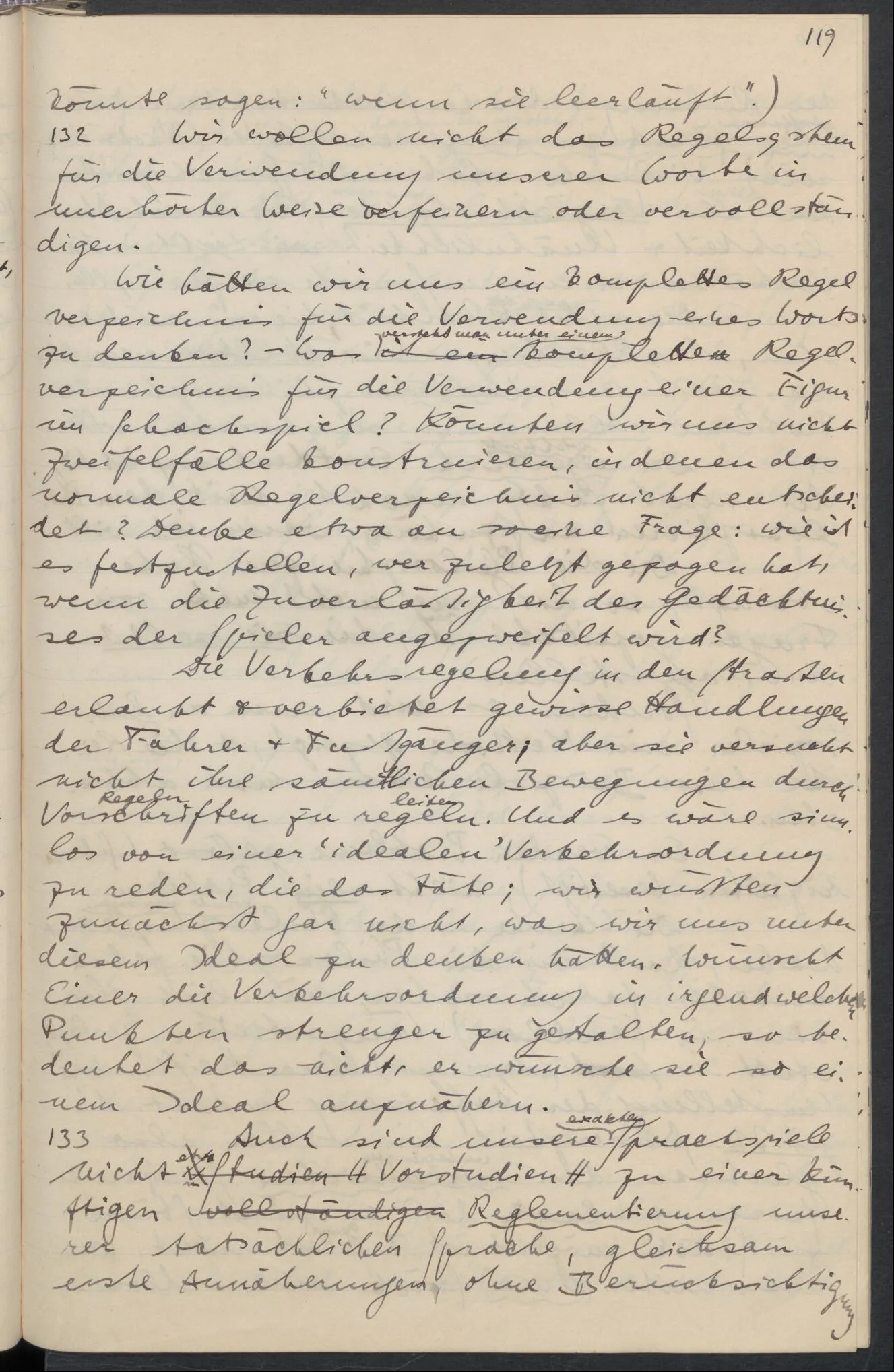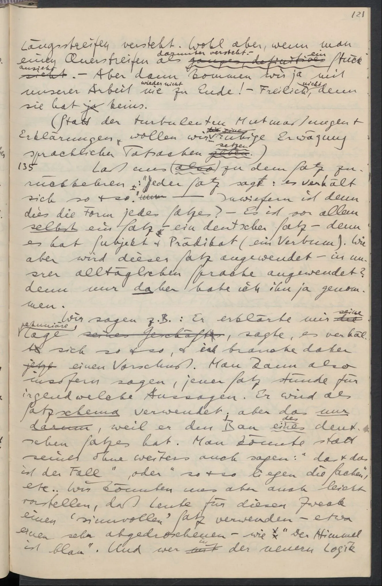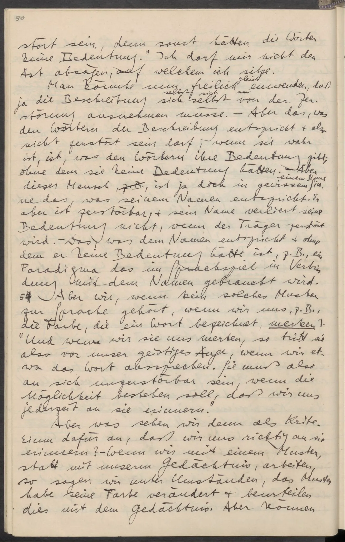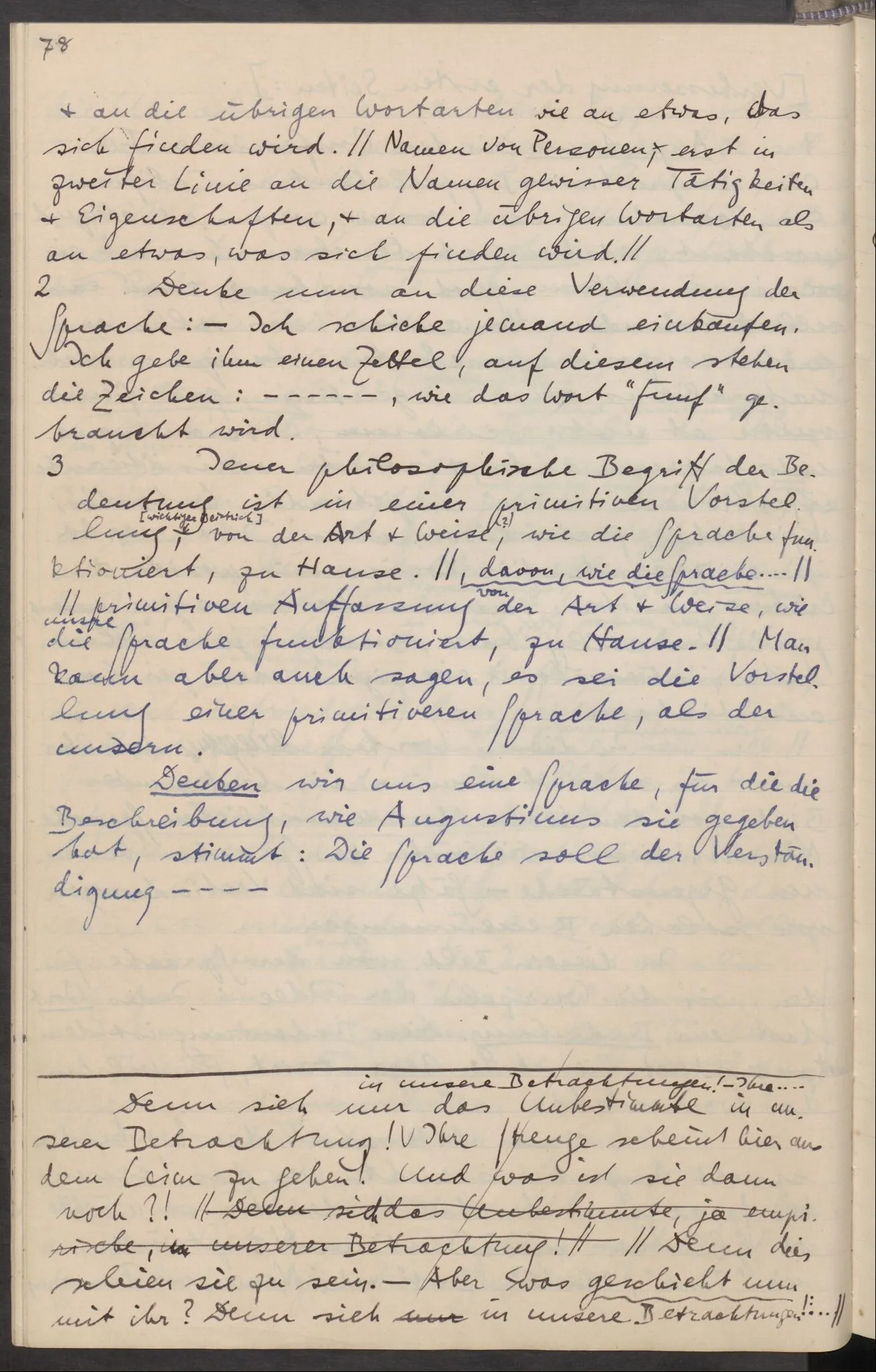 188 Da möchte ich zuerst sagen: Deine Idee sei die gewesen, jenes Meinen des Befehls habe auf seine Weise alle die Übergänge doch schon gemacht: Deine Seele fliegt beim Meinen, gleichsam, voraus & macht alle Übergänge, ehe Du körperlich bei dem oder jenem angelangt bist. Du warst also zu Ausdrücken geneigt, wie: “Die Übergänge sind eigentlich schon gemacht; auch ehe ich sie schriftlich, mündlich, oder auch in Gedanken, mache”. Und es schien, als wären sie in einer einzigartigen Weise vorausbestimmt, antizipiert, wie nur das Meinen die Wirklichkeit antizipieren könne. (Und dieser Täuschung werden wir noch öfters begegnen.)