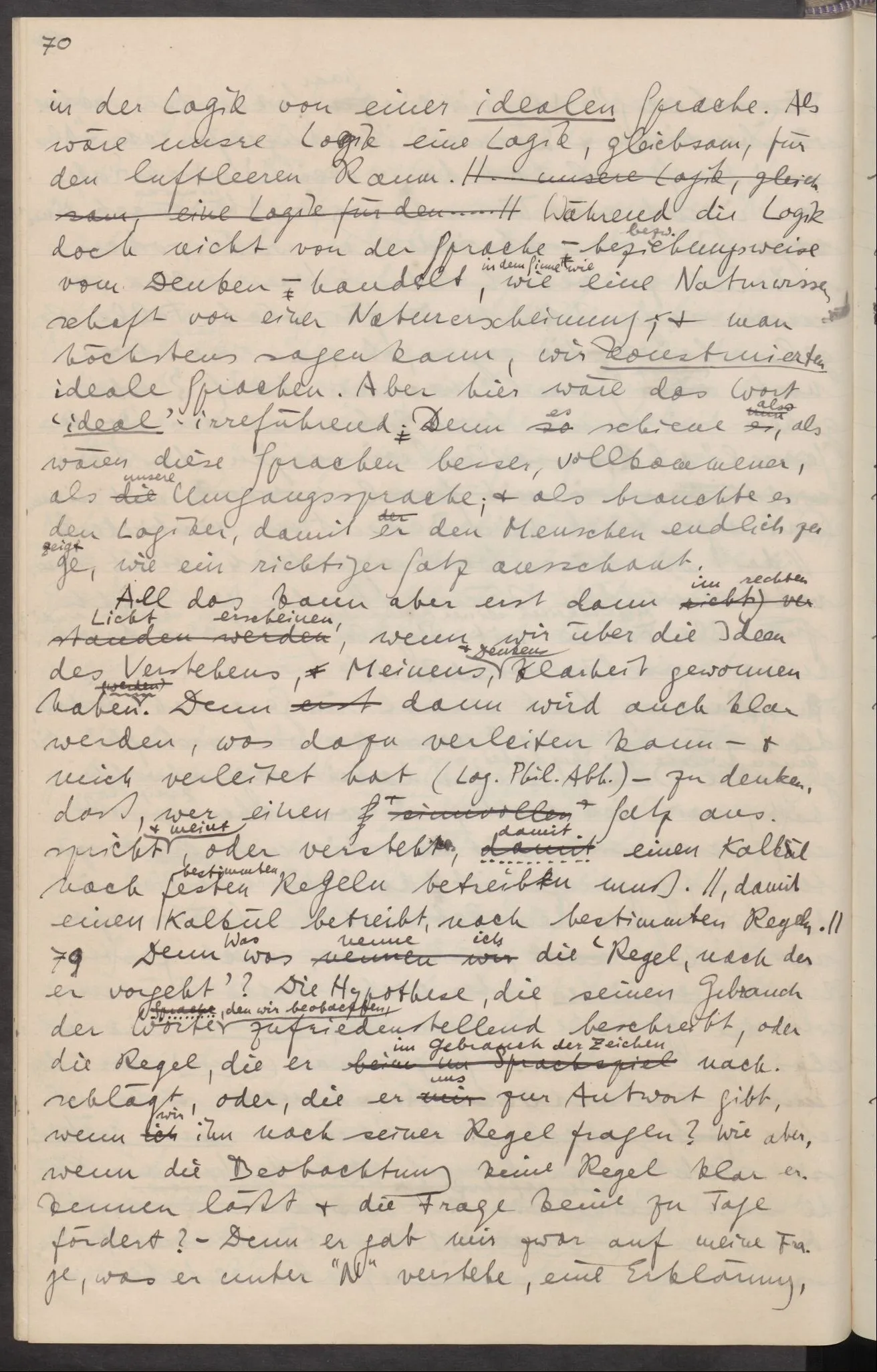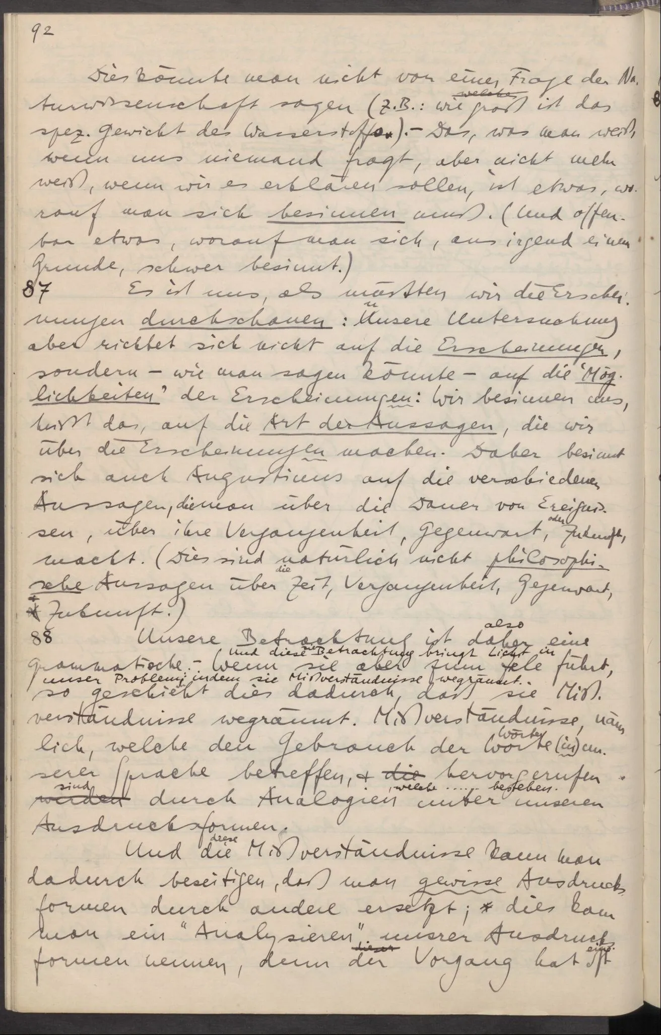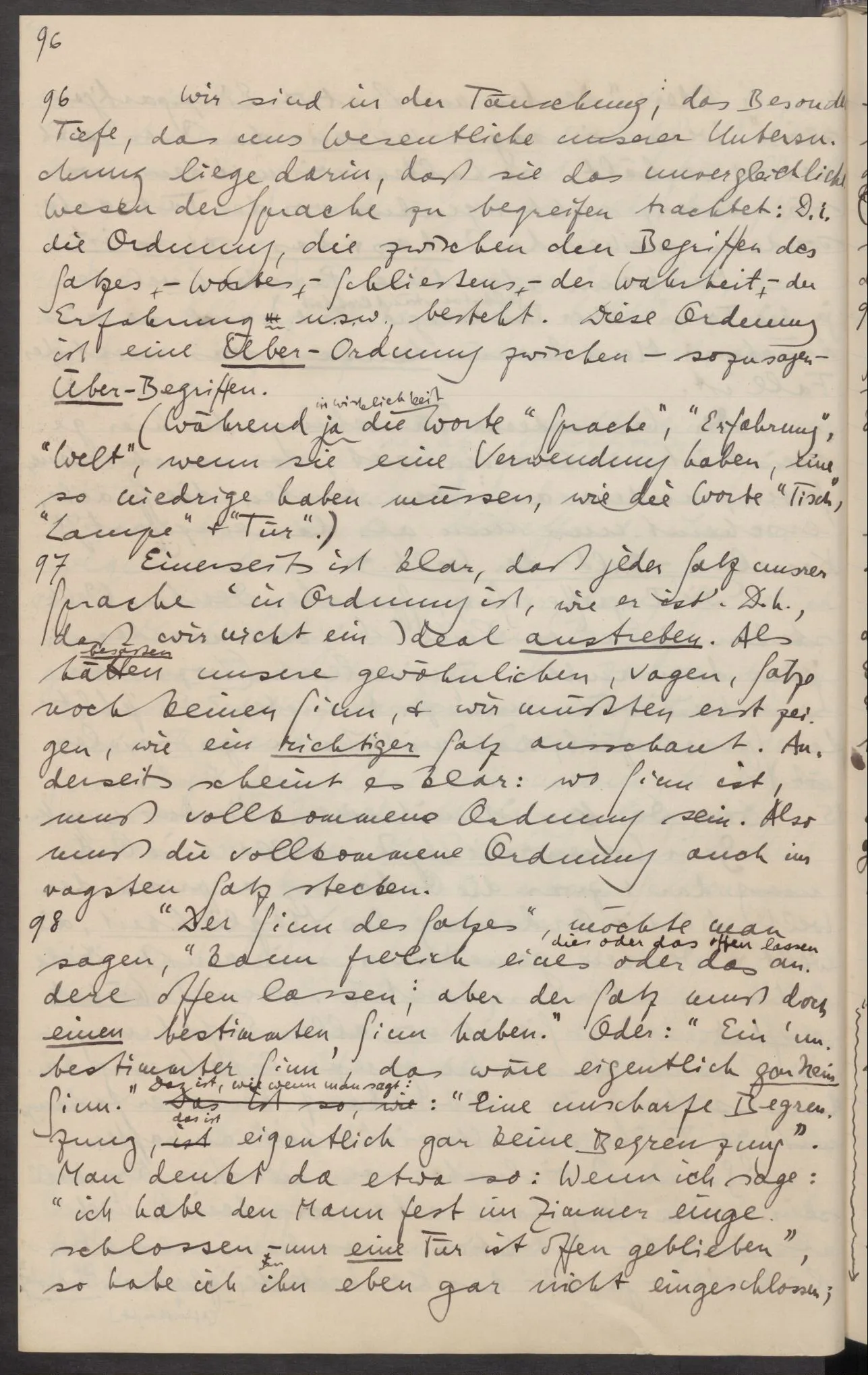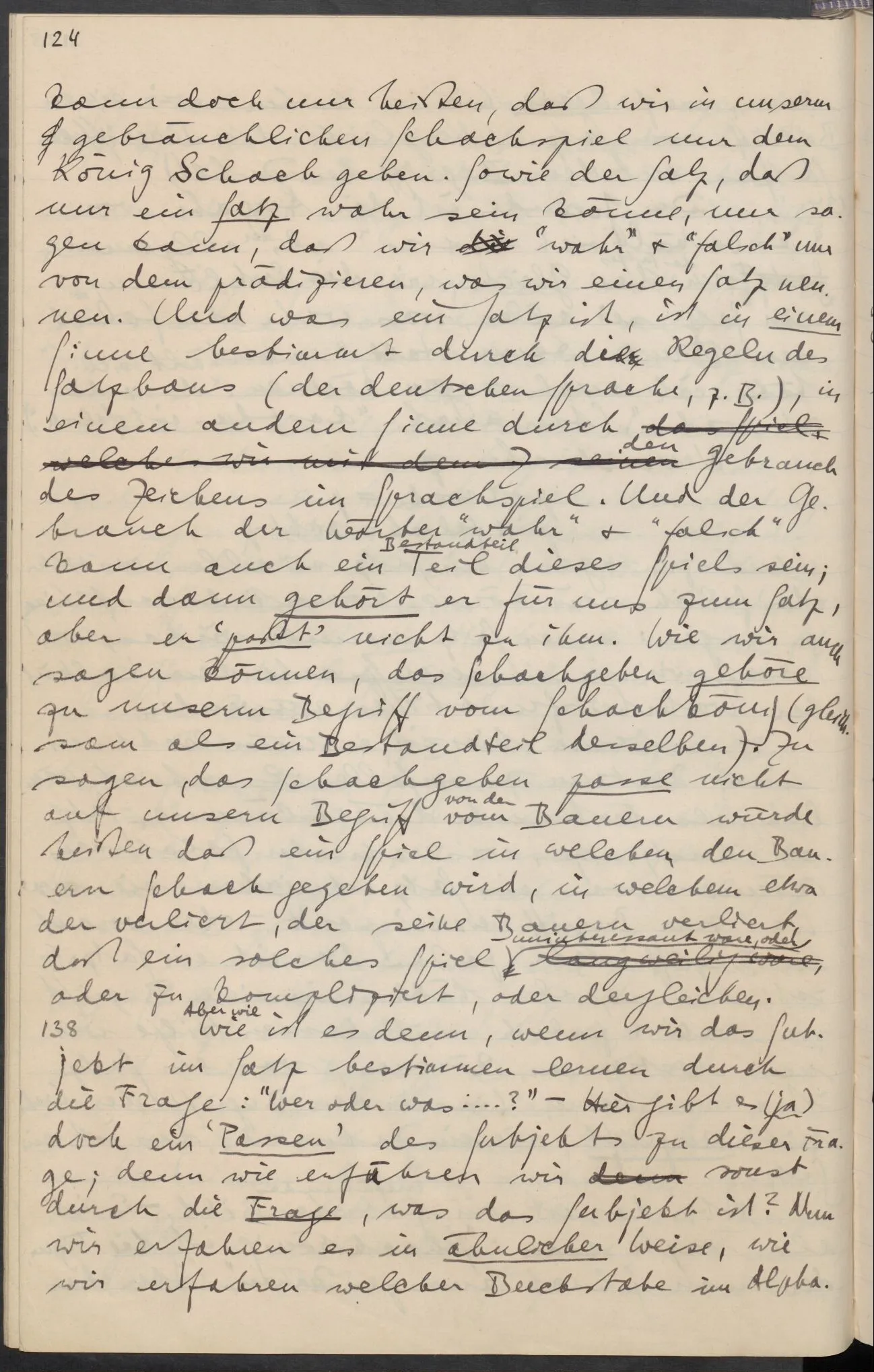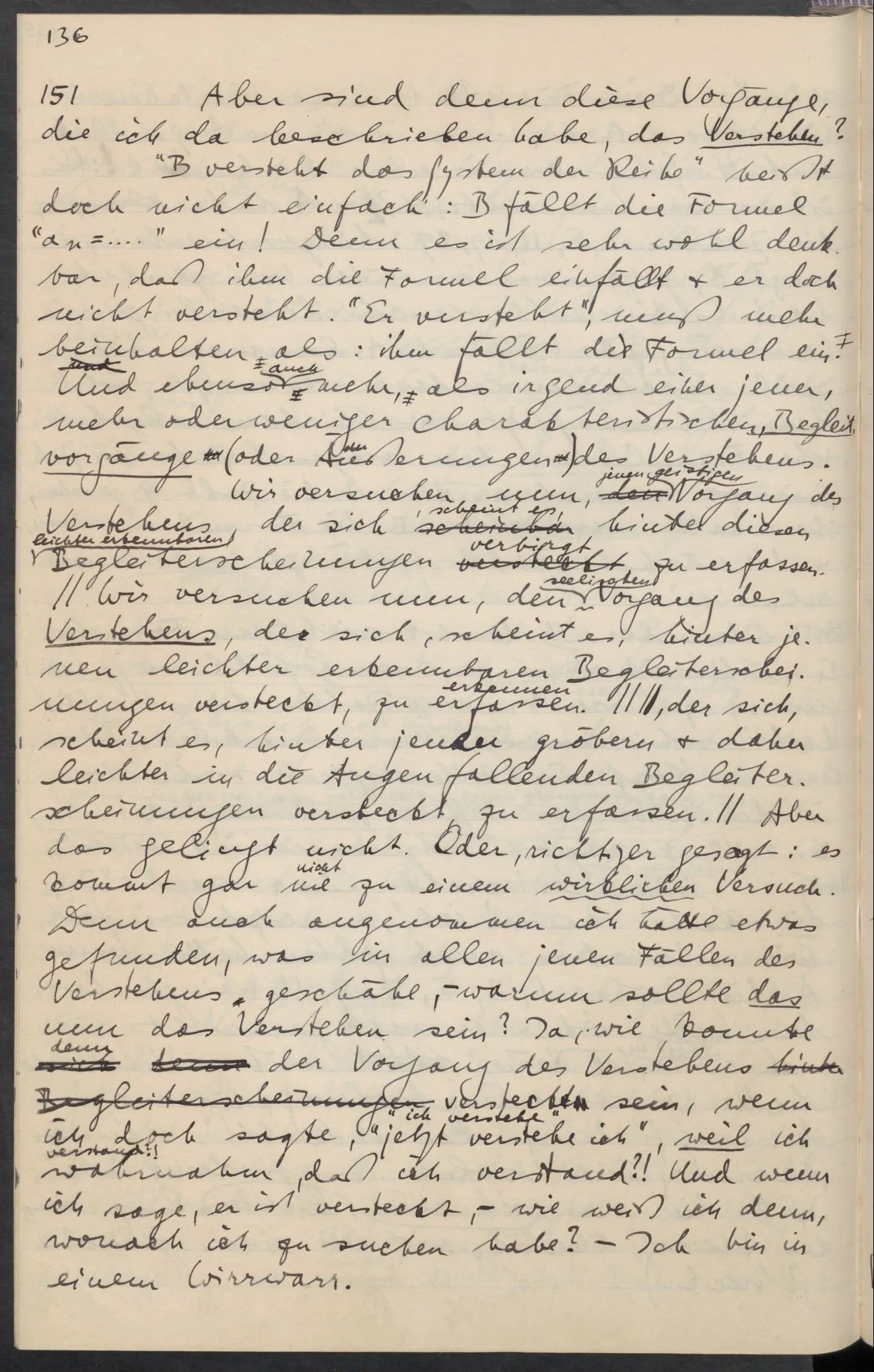 188 Da möchte ich zuerst sagen: Deine Idee sei die gewesen, jenes Meinen des Befehls habe auf seine Weise alle die Übergänge doch schon gemacht: Deine Seele fliegt beim Meinen, gleichsam, voraus & macht alle Übergänge, ehe Du körperlich bei dem oder jenem angelangt bist. Du warst also zu Ausdrücken geneigt, wie: “Die Übergänge sind eigentlich schon gemacht; auch ehe ich sie schriftlich, mündlich, oder auch in Gedanken, mache”. Und es schien, als wären sie in einer einzigartigen Weise vorausbestimmt, antizipiert, wie nur das Meinen die Wirklichkeit antizipieren könne. (Und dieser Täuschung werden wir noch öfters begegnen.)