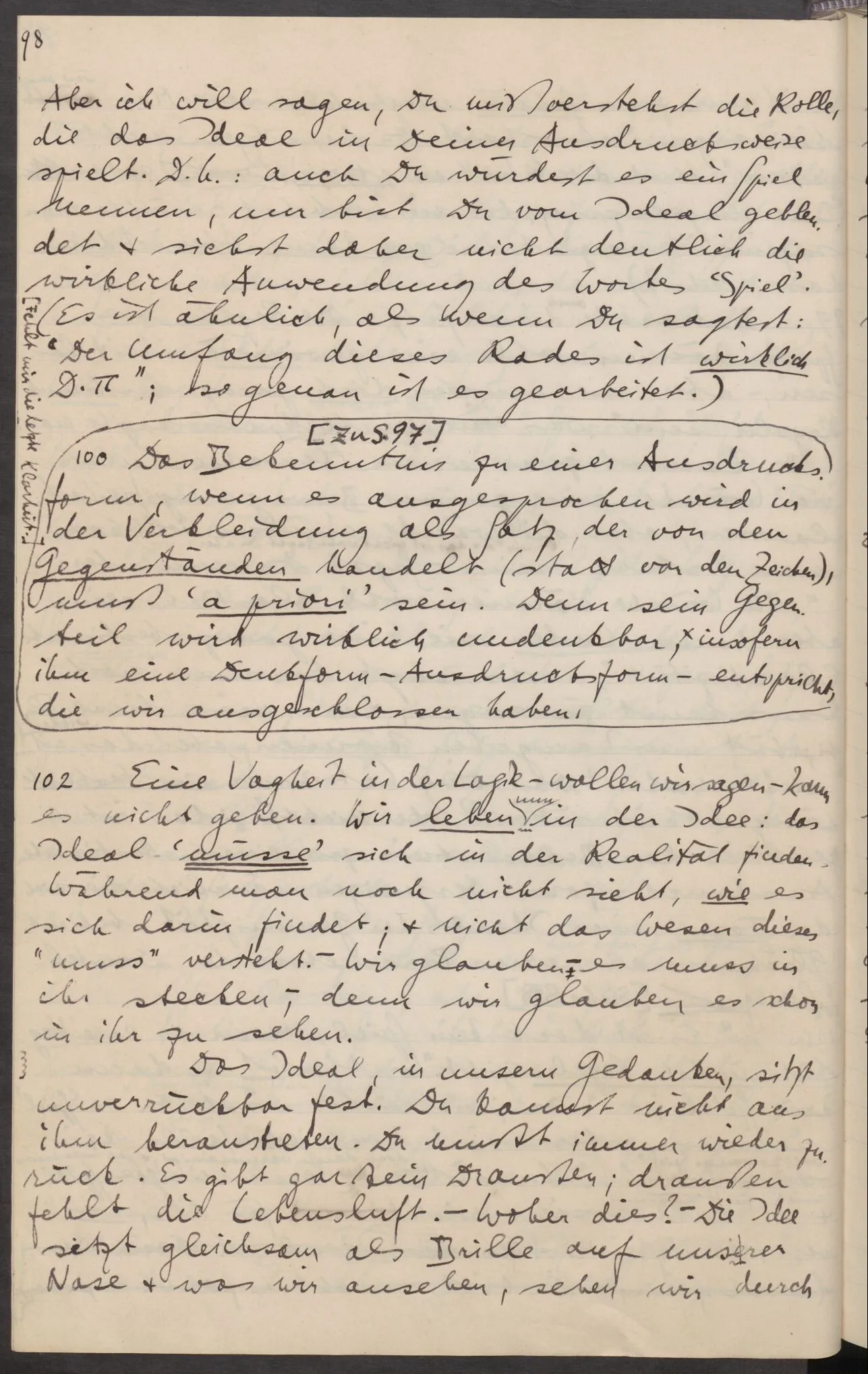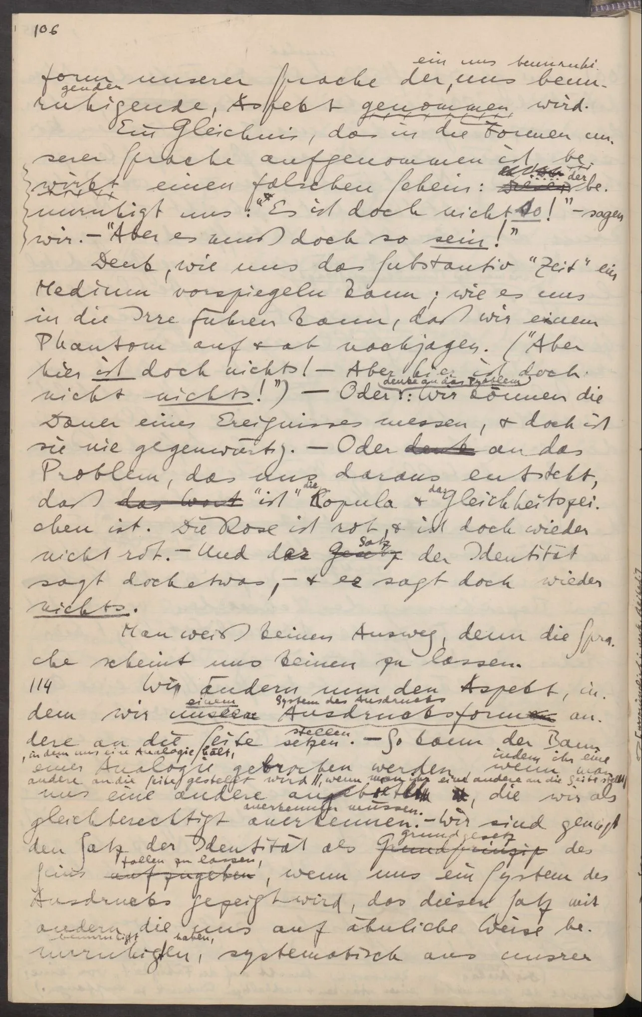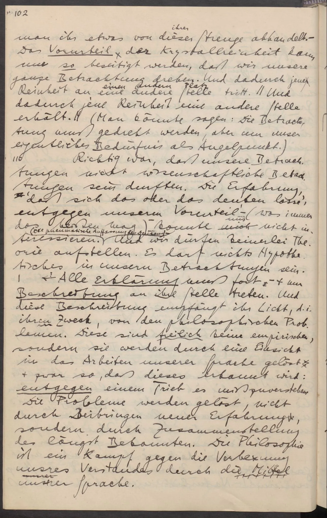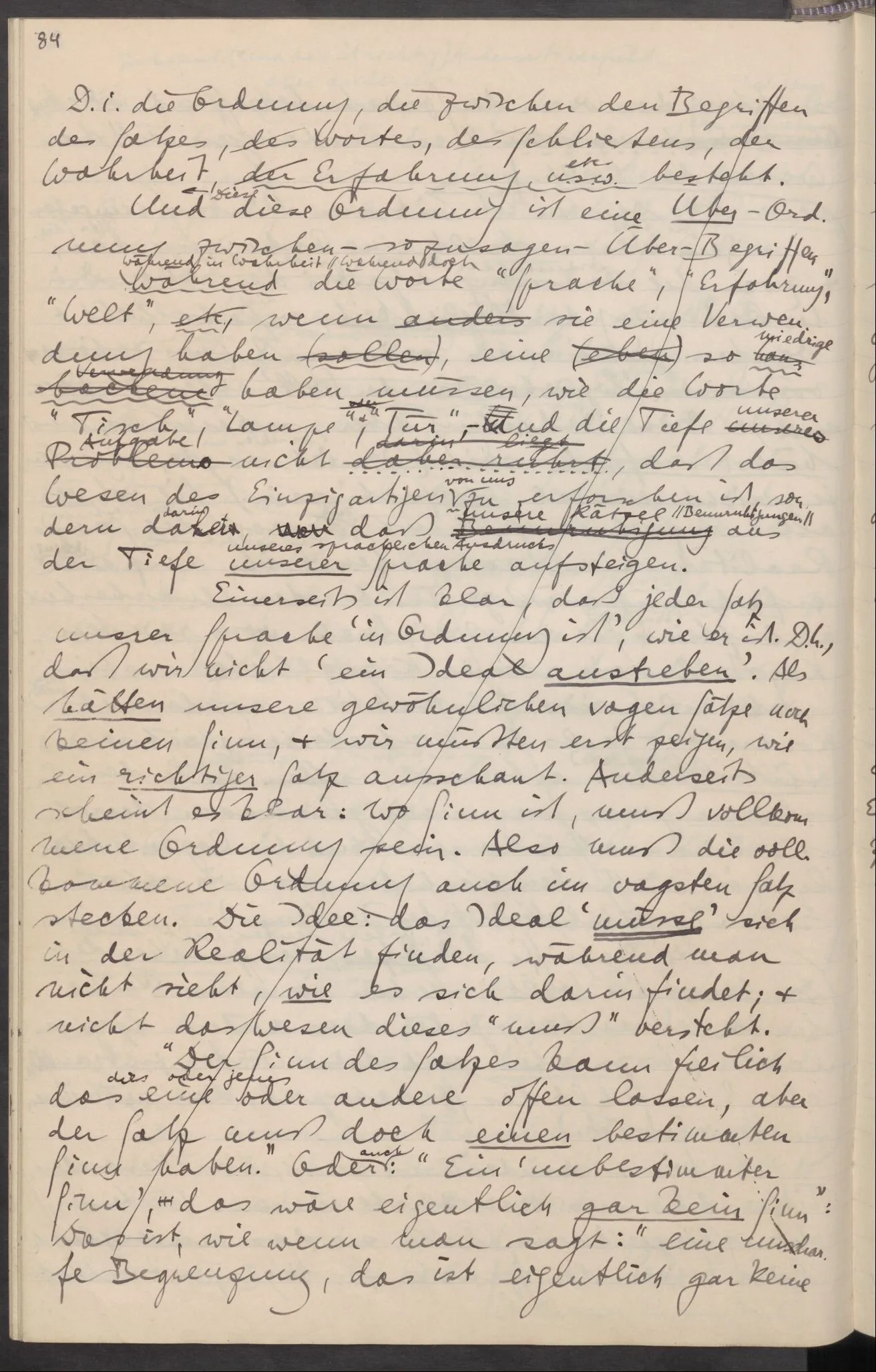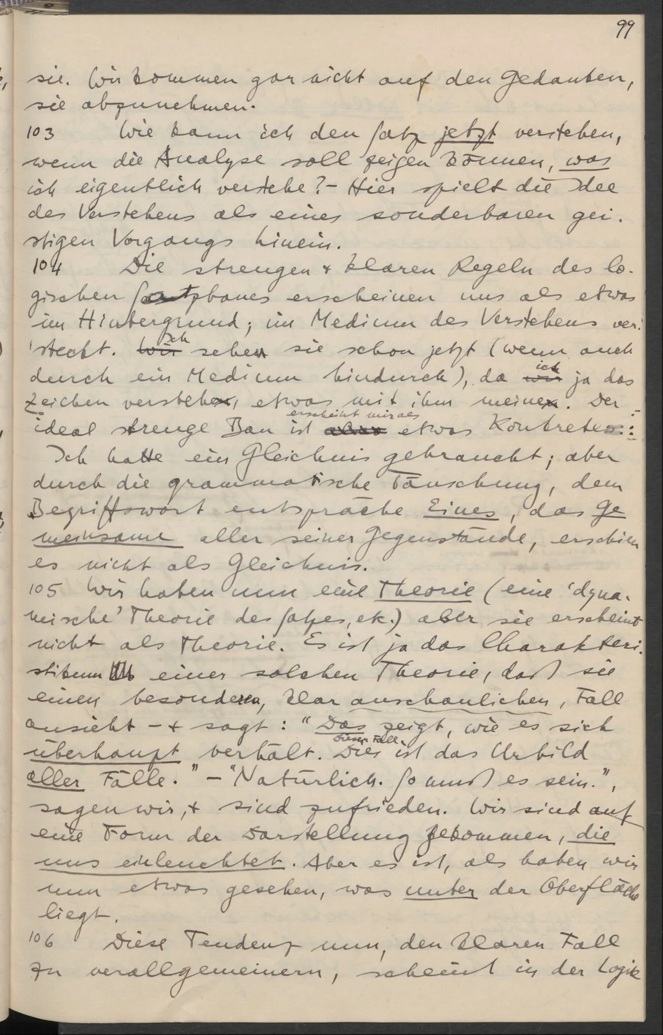 188 Da möchte ich zuerst sagen: Deine Idee sei die gewesen, jenes Meinen des Befehls habe auf seine Weise alle die Übergänge doch schon gemacht: Deine Seele fliegt beim Meinen, gleichsam, voraus & macht alle Übergänge, ehe Du körperlich bei dem oder jenem angelangt bist. Du warst also zu Ausdrücken geneigt, wie: “Die Übergänge sind eigentlich schon gemacht; auch ehe ich sie schriftlich, mündlich, oder auch in Gedanken, mache”. Und es schien, als wären sie in einer einzigartigen Weise vorausbestimmt, antizipiert, wie nur das Meinen die Wirklichkeit antizipieren könne. (Und dieser Täuschung werden wir noch öfters begegnen.)
