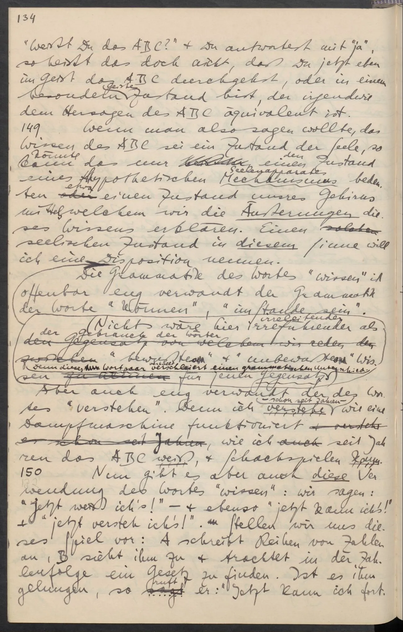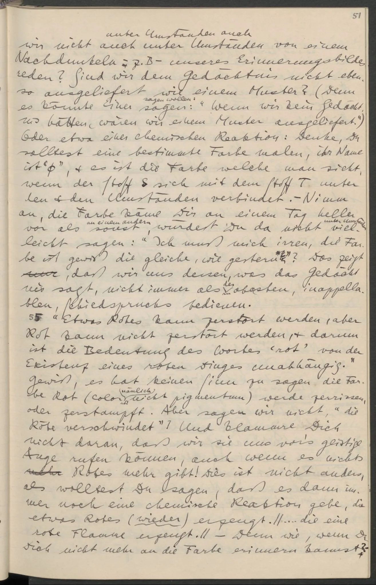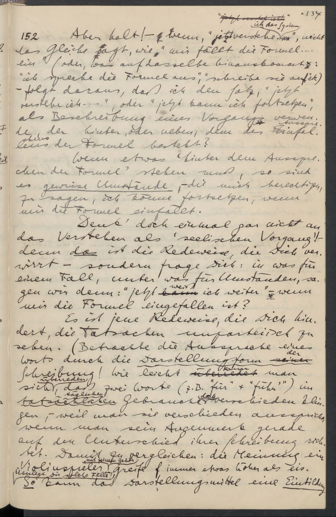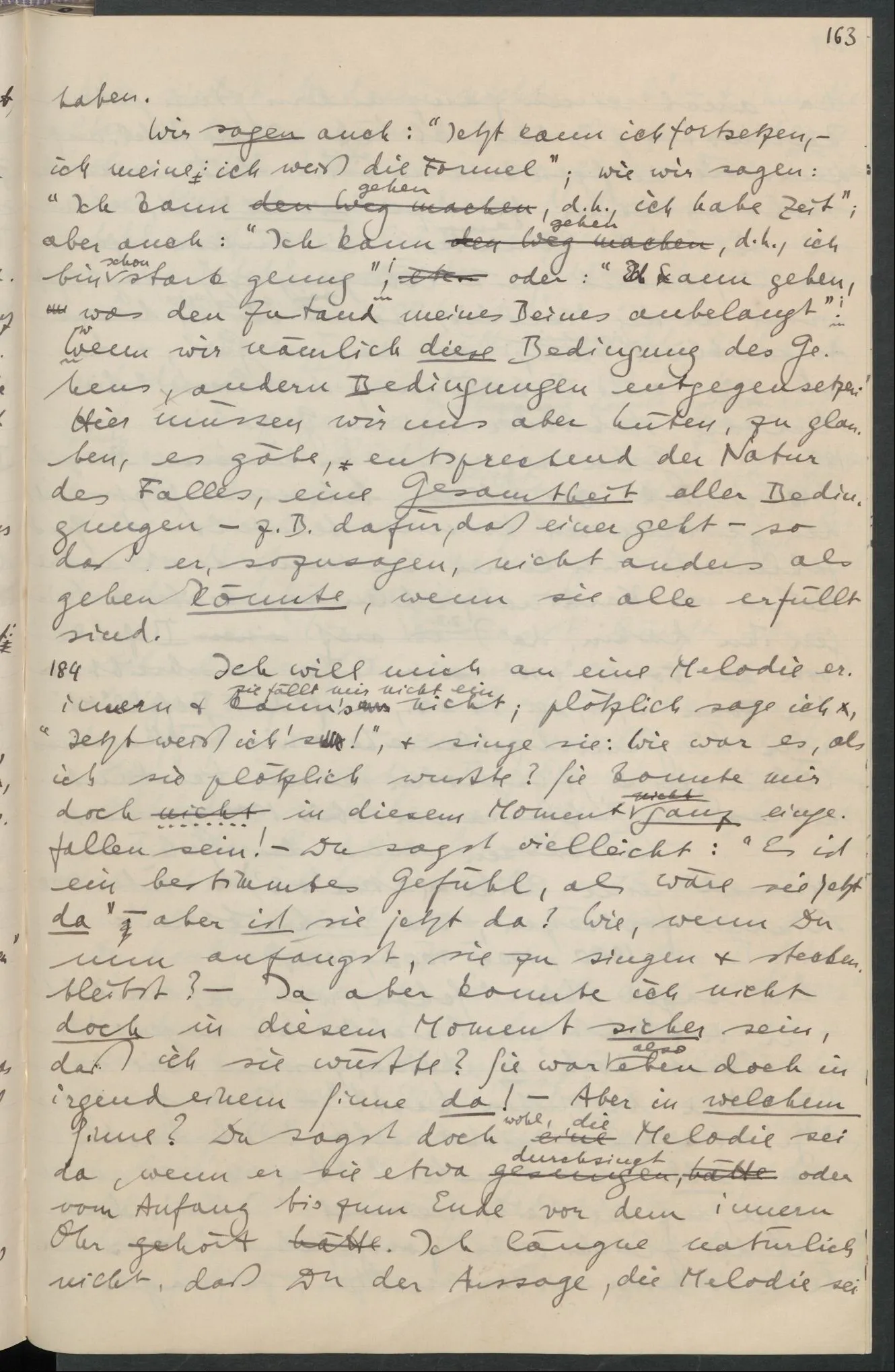 184 Ich will mich an eine Melodie erinnern & kann’s nicht; plötzlich sage ich, “Jetzt weiß ich’s!”, & singe sie: Wie war es, als ich sie plötzlich wußte? Sie konnte mir doch nicht in diesem Moment ganz eingefallen sein! – Du sagst vielleicht: “Es ist ein bestimmtes Gefühl, als wäre sie jetzt da” – aber ist sie jetzt da? Wie, wenn Du nun anfängst, sie zu singen & steckenbleibst? – Ja aber konnte ich nicht doch in diesem Moment sicher sein, daß ich sie wüßte? Sie war also eben doch in irgendeinem Sinne da! – Aber in welchem Sinne? Du sagst doch wohl, die Melodie sei da, wenn er sie etwa durchsingt, oder vom Anfang bis zum Ende vor dem innern Ohr hört. Ich leugne natürlich nicht, daß Du der Aussage, die Melodie sei da, auch einen ganz andern Sinn geben kannst – z.B. den, ich hätte einen Zettel, auf dem sie aufgeschrieben steht. – Und worin besteht es denn, daß er sicher ist, er wisse sie? – Du könntest natürlich sagen: Wenn jemand mit Überzeugung sagt, jetzt wisse er die Melodie, so sei in diesem Augenblick (irgendwie) ganz vor seinem Geist; & das ist hier eine Erklärung der Worte: “die Melodie steht ganz vor seinem Geist”.