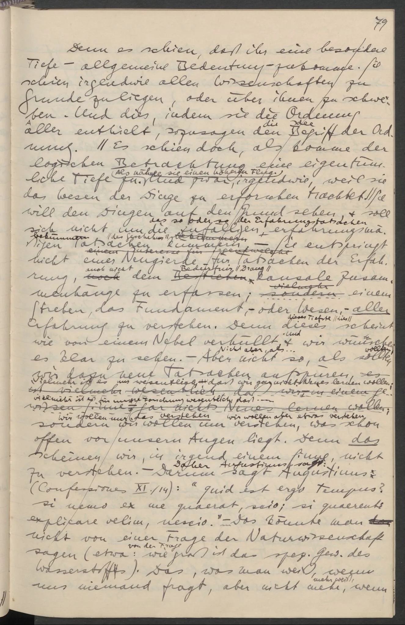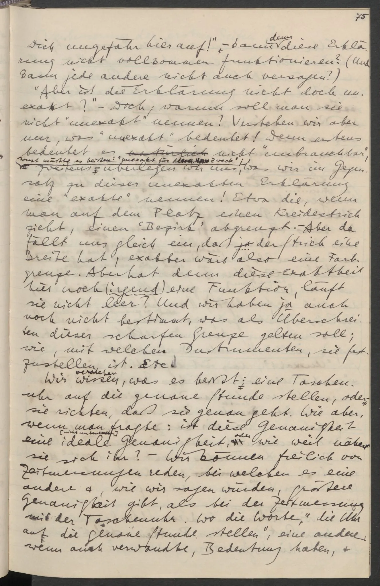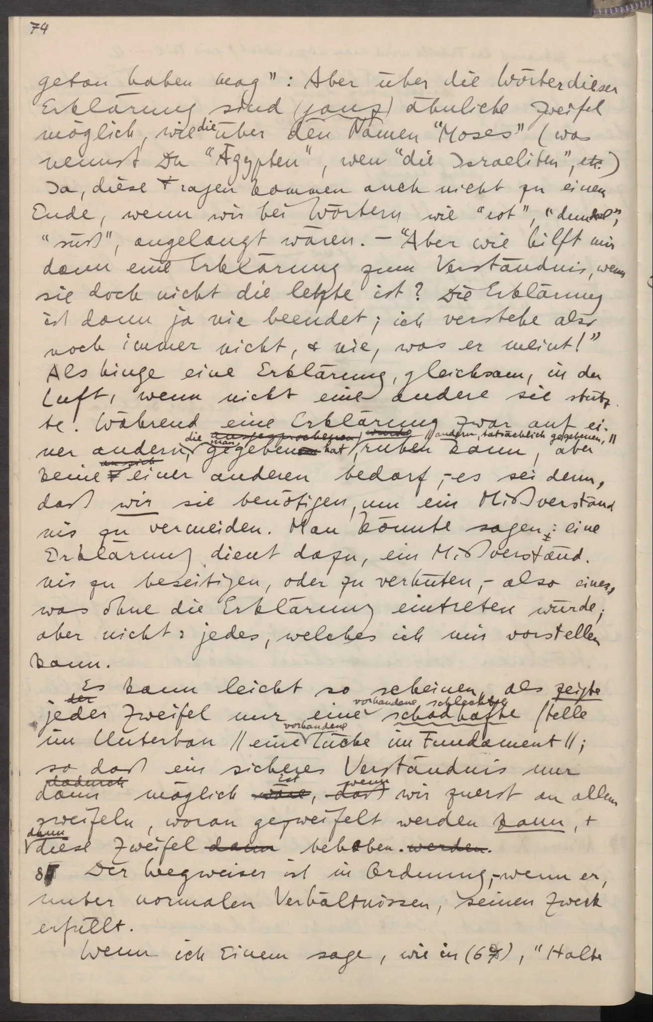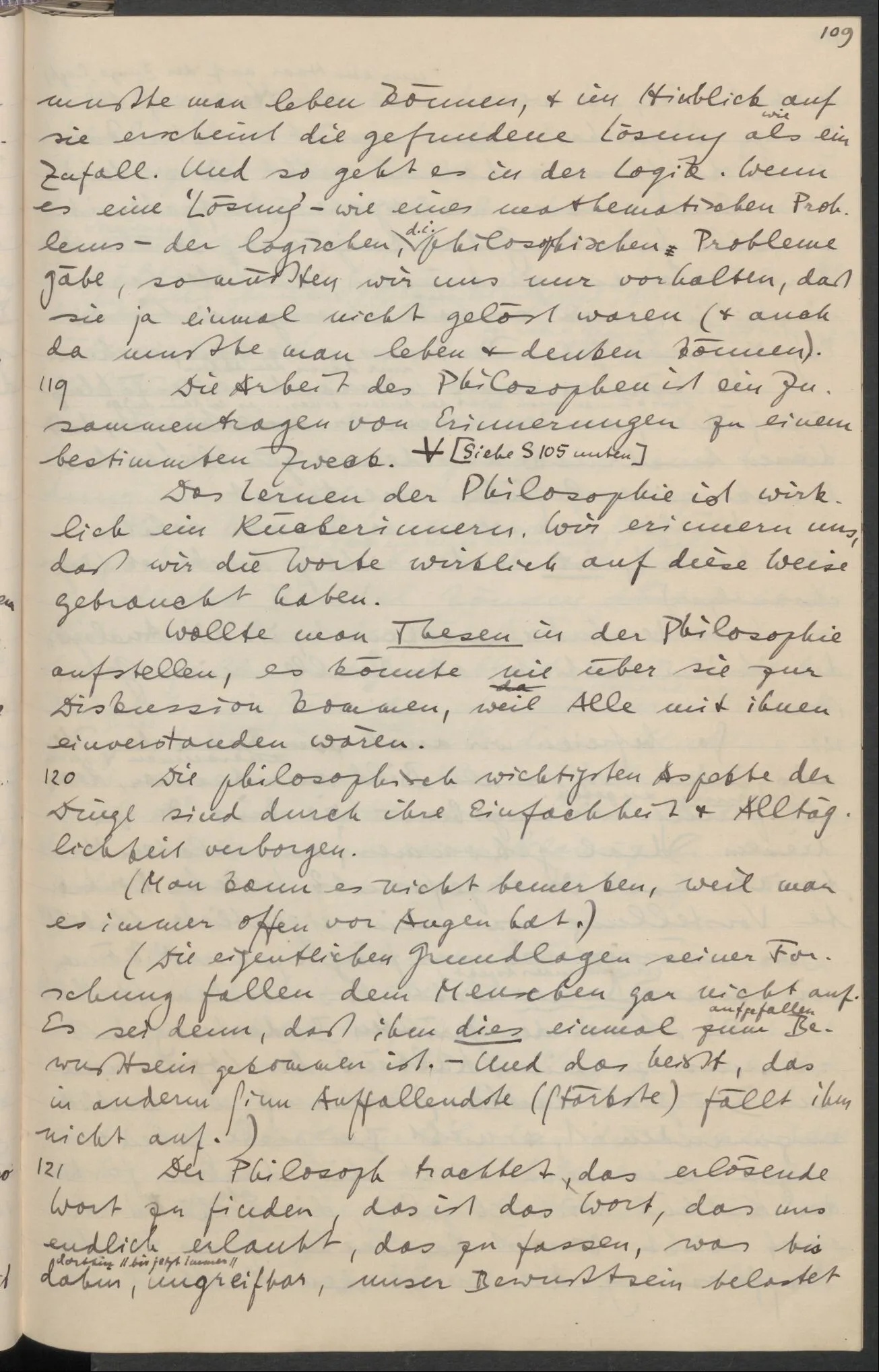 184 Ich will mich an eine Melodie erinnern & kann’s nicht; plötzlich sage ich, “Jetzt weiß ich’s!”, & singe sie: Wie war es, als ich sie plötzlich wußte? Sie konnte mir doch nicht in diesem Moment ganz eingefallen sein! – Du sagst vielleicht: “Es ist ein bestimmtes Gefühl, als wäre sie jetzt da” – aber ist sie jetzt da? Wie, wenn Du nun anfängst, sie zu singen & steckenbleibst? – Ja aber konnte ich nicht doch in diesem Moment sicher sein, daß ich sie wüßte? Sie war also eben doch in irgendeinem Sinne da! – Aber in welchem Sinne? Du sagst doch wohl, die Melodie sei da, wenn er sie etwa durchsingt, oder vom Anfang bis zum Ende vor dem innern Ohr hört. Ich leugne natürlich nicht, daß Du der Aussage, die Melodie sei da, auch einen ganz andern Sinn geben kannst – z.B. den, ich hätte einen Zettel, auf dem sie aufgeschrieben steht. – Und worin besteht es denn, daß er sicher ist, er wisse sie? – Du könntest natürlich sagen: Wenn jemand mit Überzeugung sagt, jetzt wisse er die Melodie, so sei in diesem Augenblick (irgendwie) ganz vor seinem Geist; & das ist hier eine Erklärung der Worte: “die Melodie steht ganz vor seinem Geist”.