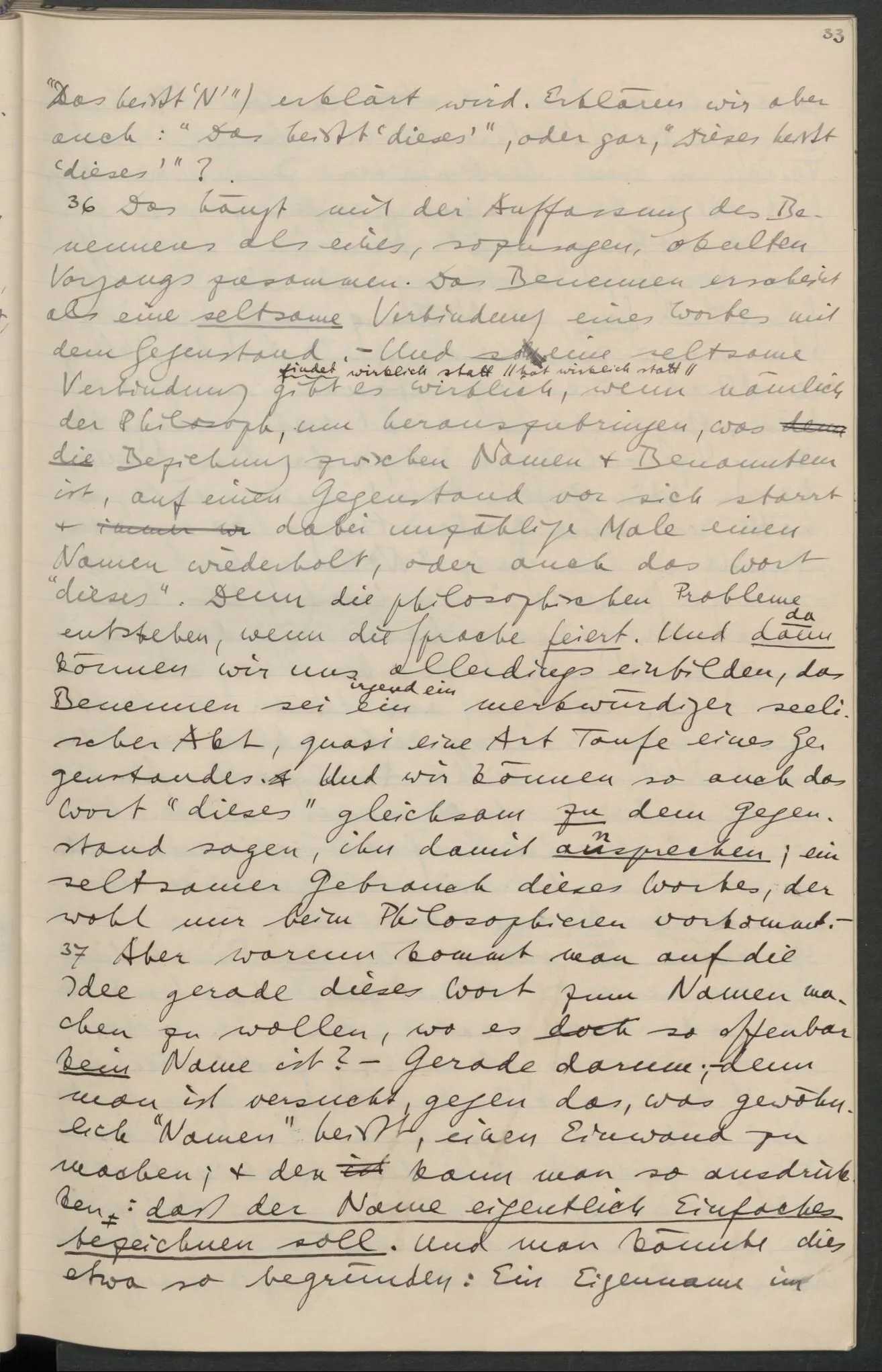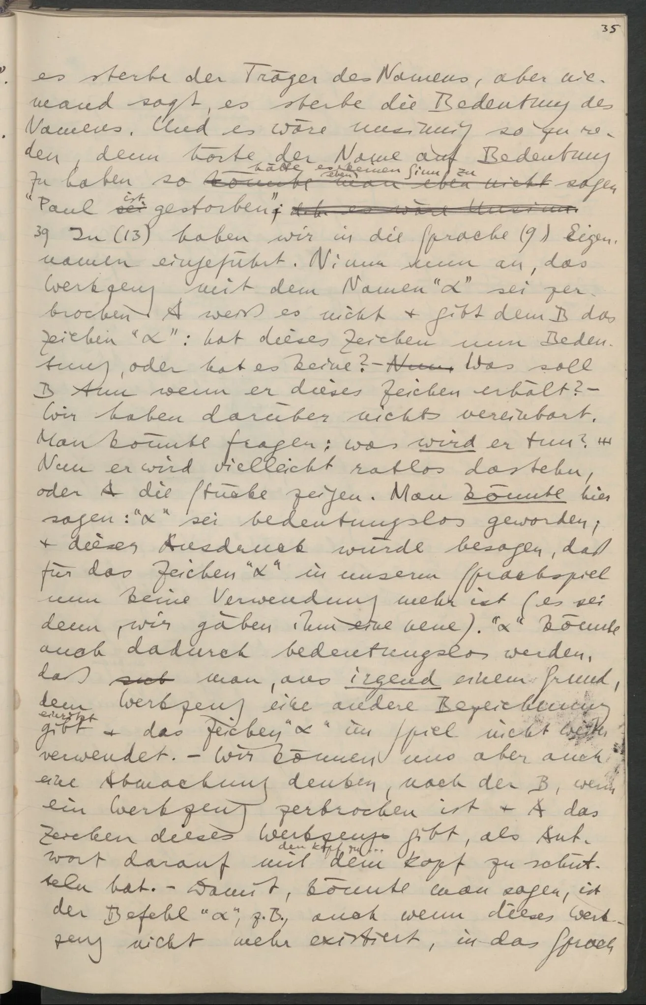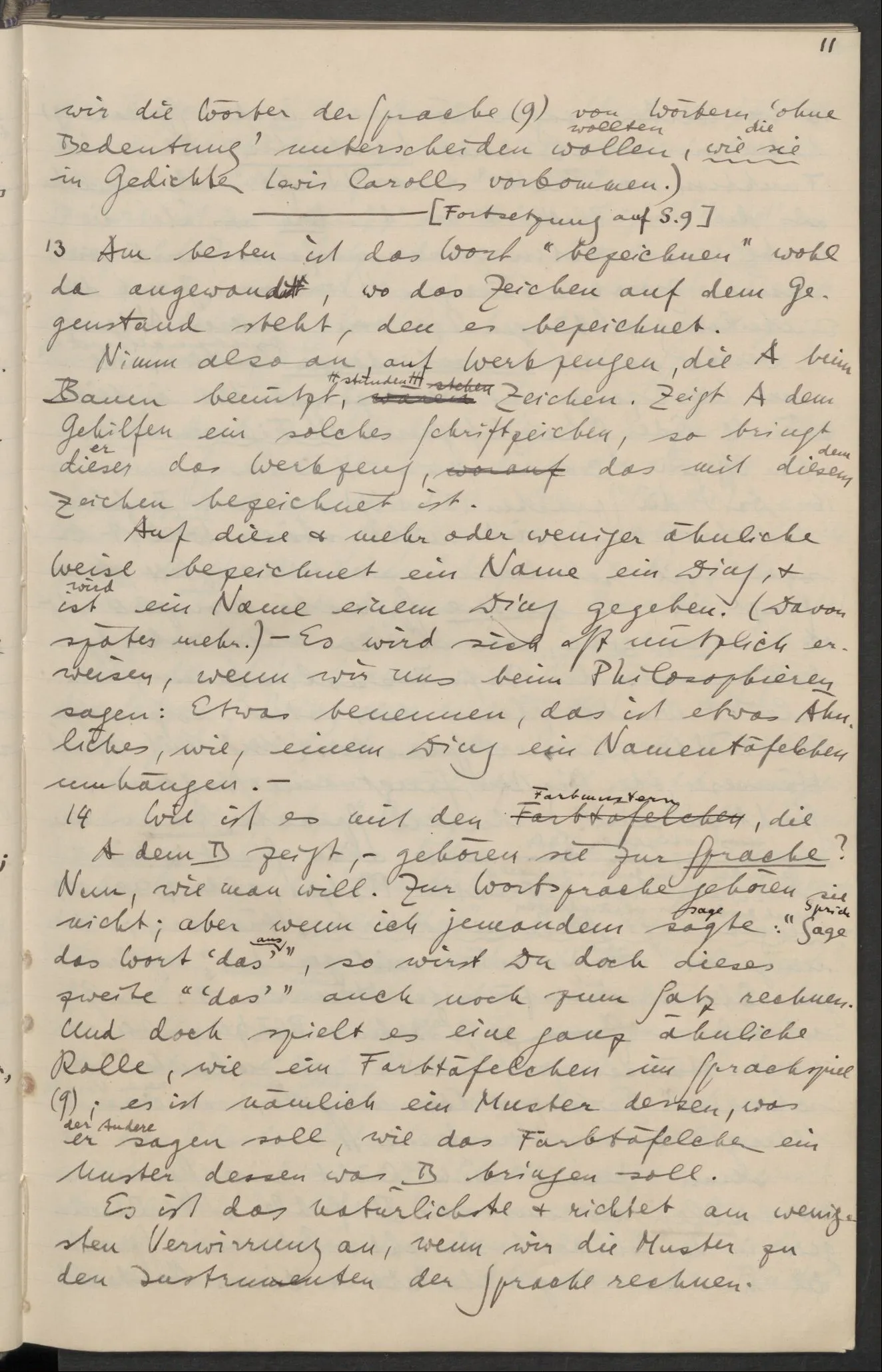 13 Am besten ist das Wort “bezeichnen” wohl da angewandt, wo das Zeichen auf dem Gegenstand steht, den es bezeichnet. Nimm also an, auf Werkzeugen, die A beim Bauen benützt, stünden Zeichen. Zeigt A dem Gehilfen ein solches Schriftzeichen, so bringt dieser das Werkzeug, das mit diesem Zeichen bezeichnet ist. Auf diese & mehr oder weniger ähnliche Weise bezeichnet ein Name ein Ding, & ist ein Name einem Ding gegeben. (Davon später mehr.) – Es wird sich oft nützlich erweisen, wenn wir uns beim Philosophieren sagen: Etwas benennen, das ist etwas Ähnliches, wie, einem Ding ein Namentäfelchen umhängen. –