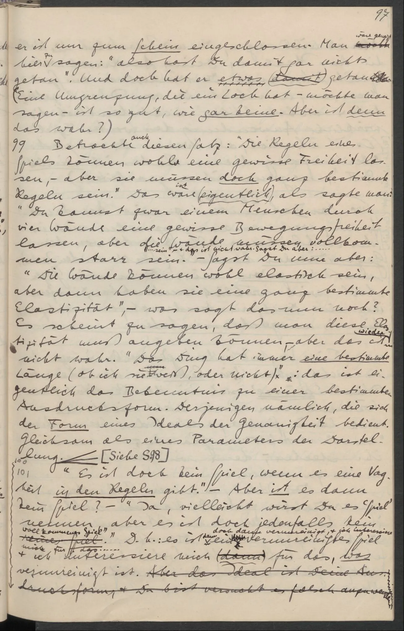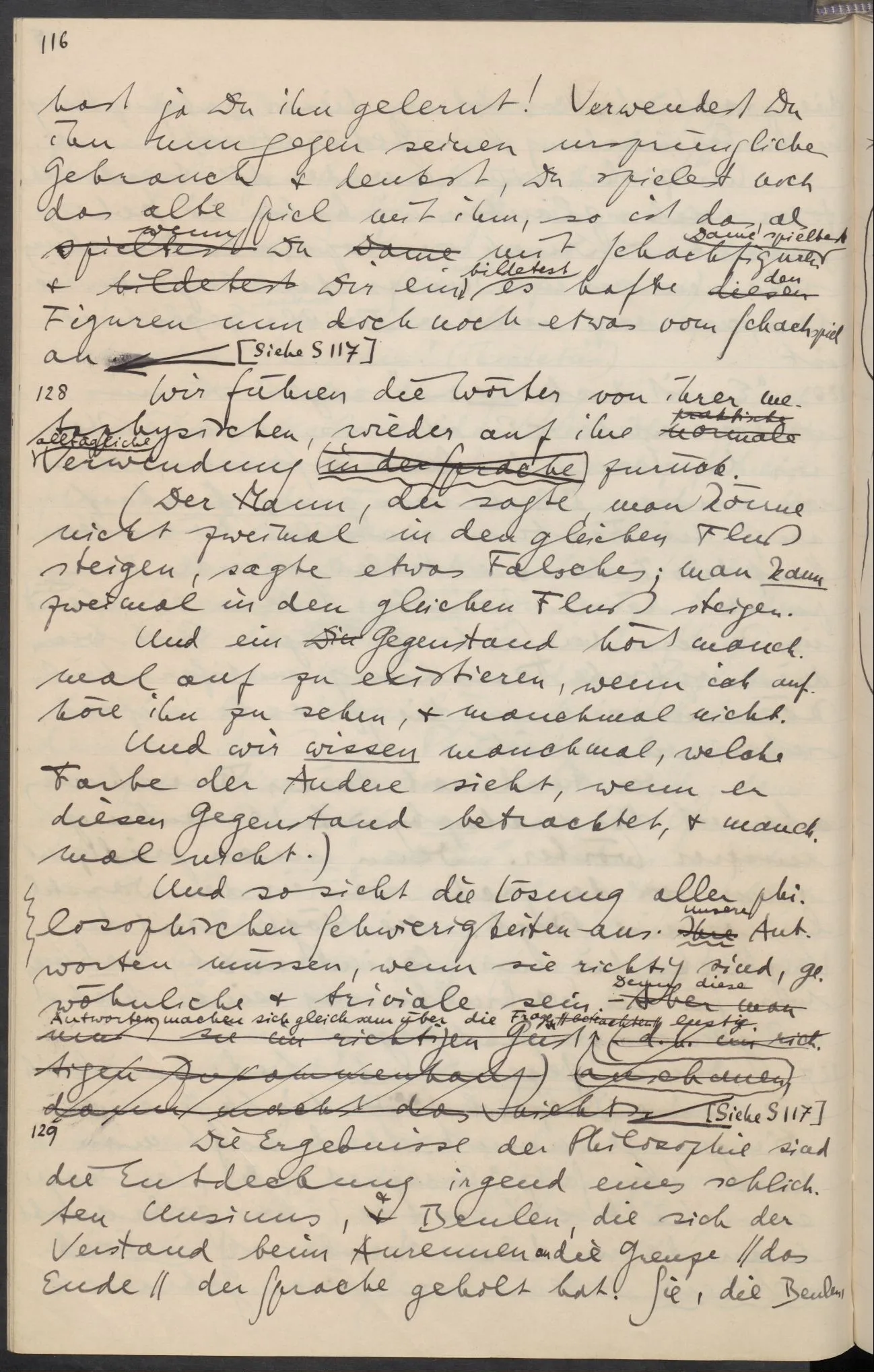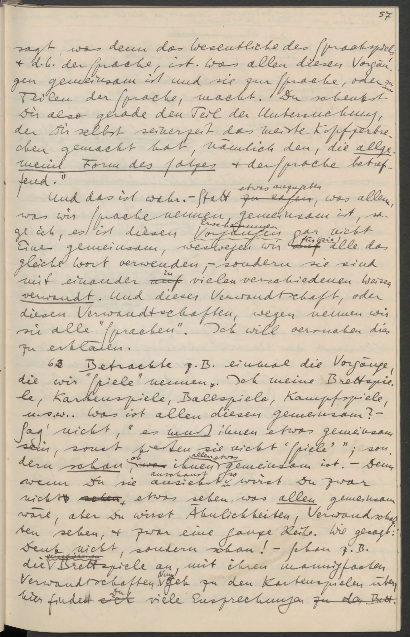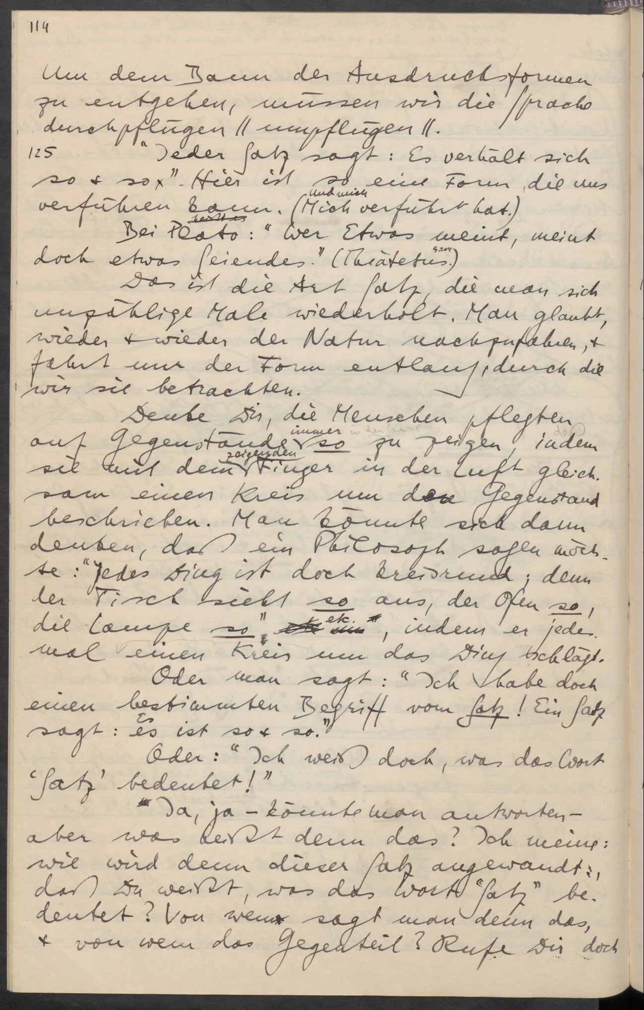 168 Was ist nun an dem Satz, das Lesen sei doch ‘ein ganz bestimmter Vorgang’? Das heißt doch wohl, beim Lesen finde immer ein bestimmter Vorgang statt, den wir wiedererkennen. – Aber wenn ich nun einmal einen deutschen Satz lese & einandermal nach Noten Klavier spiele, – findet hier wirklich der gleiche seelische Vorgang statt? ‒ ‒ Dahingegen ist aber freilich eine Gleichförmigkeit im Erlebnis des Lesens einer Druckseite! Denn der Vorgang ist ja ein gleichförmiger. Und es ist ja leicht verständlich, daß sich dieser Vorgang unterscheidet von dem etwa, sechs Wörter beim Anblick beliebiger Striche einfallen zu lassen. – Denn schon der bloße Anblick einer gedruckten Zeile ist (ja) ungemein charakteristisch, d.h., ein ganz spezielles Bild: Die Buchstaben alle von ungefähr der gleichen Größe, auch der Gestalt nach verwandt, immer wiederkehrend; die Wörter, die zum großen Teil sich ständig wiederholen & uns unendlich wohlvertraut sind, ganz wie wohlvertraute Gesichter. – Denke an das Unbehagen, das wir empfinden, wenn die Rechtschreibung eines Wortes geändert wird (auch an die noch tieferen Gefühle, die Fragen der Schreibung von Wörtern aufgeregt haben). Freilich, nicht jede Zeichenform hat sich uns tief eingeprägt. Ein Zeichen, wie Russells “~” für die Verneinung, kann durch ein beliebiges andere ersetzt werden, ohne daß tiefe Gefühle in uns aufgeregt würden. – Bedenke, daß das gesehene Wortbild uns in ähnlicher Weise vertraut ist, wie das gehörte.
