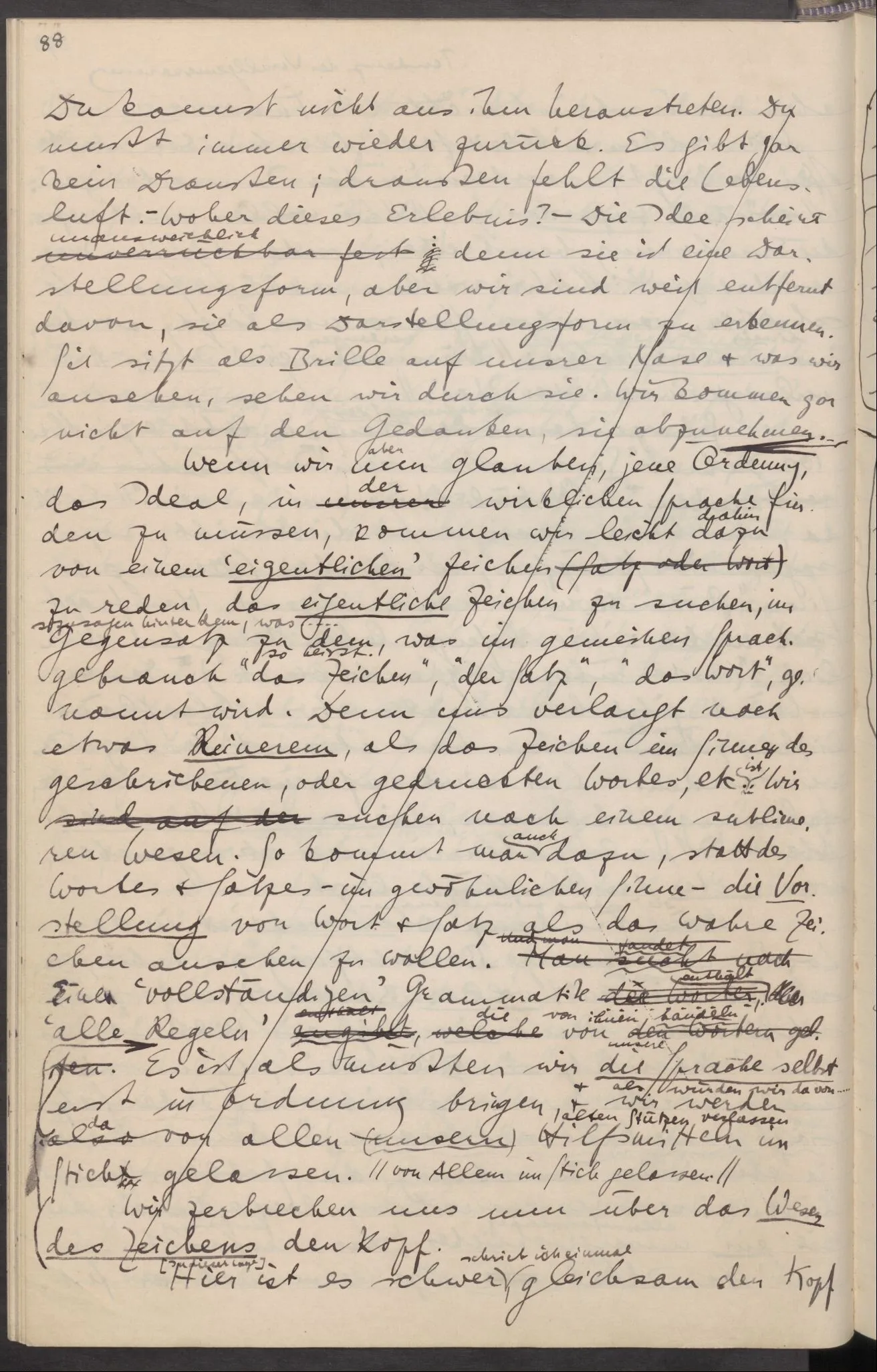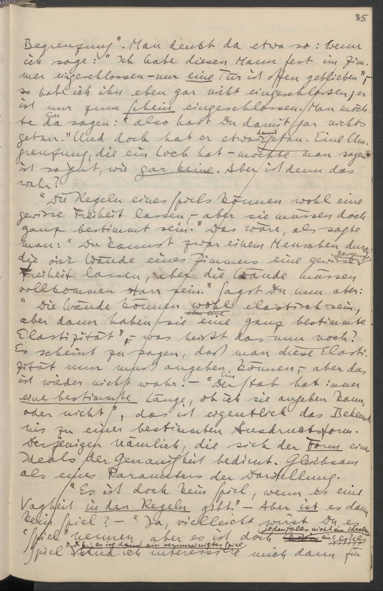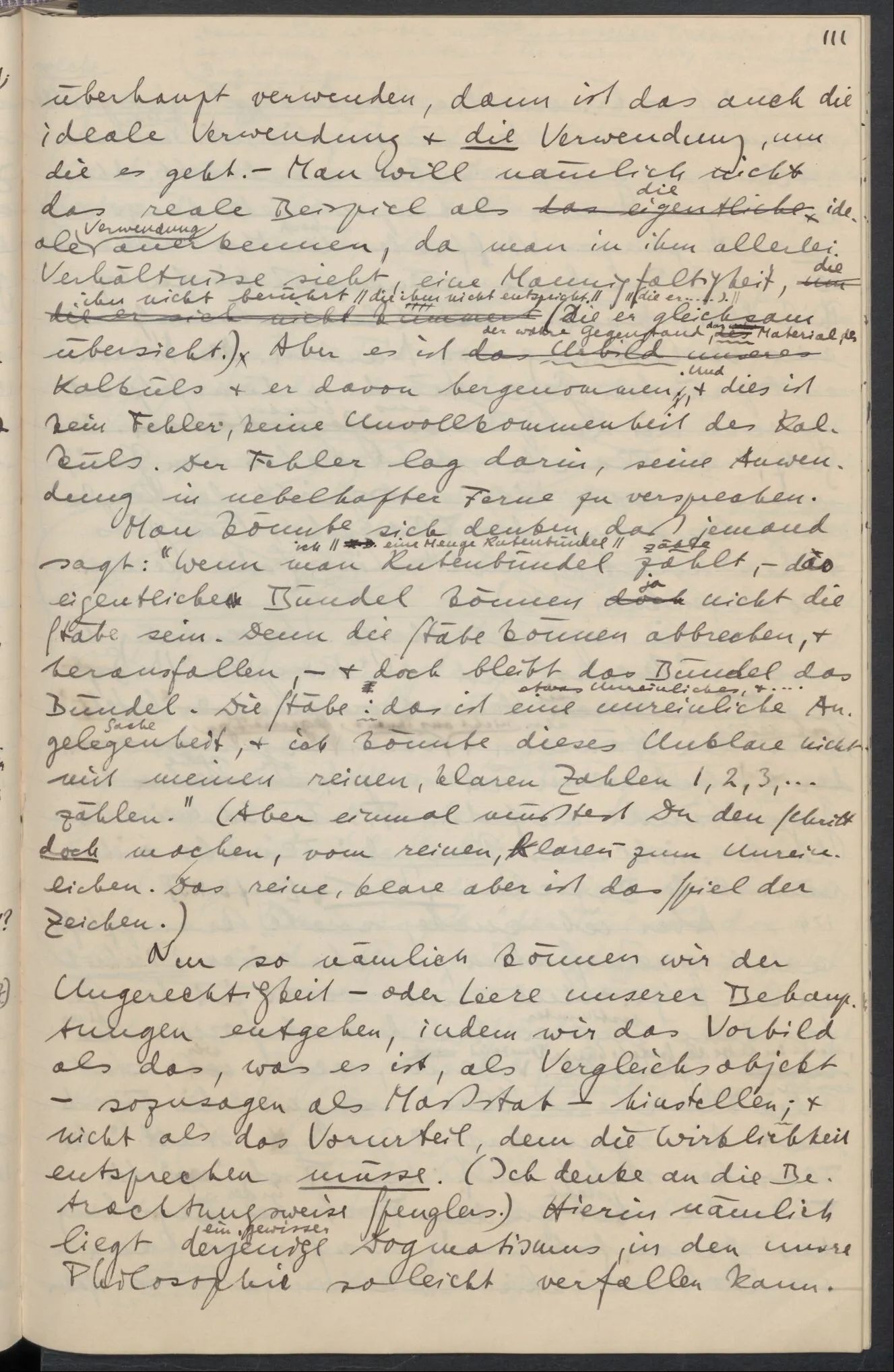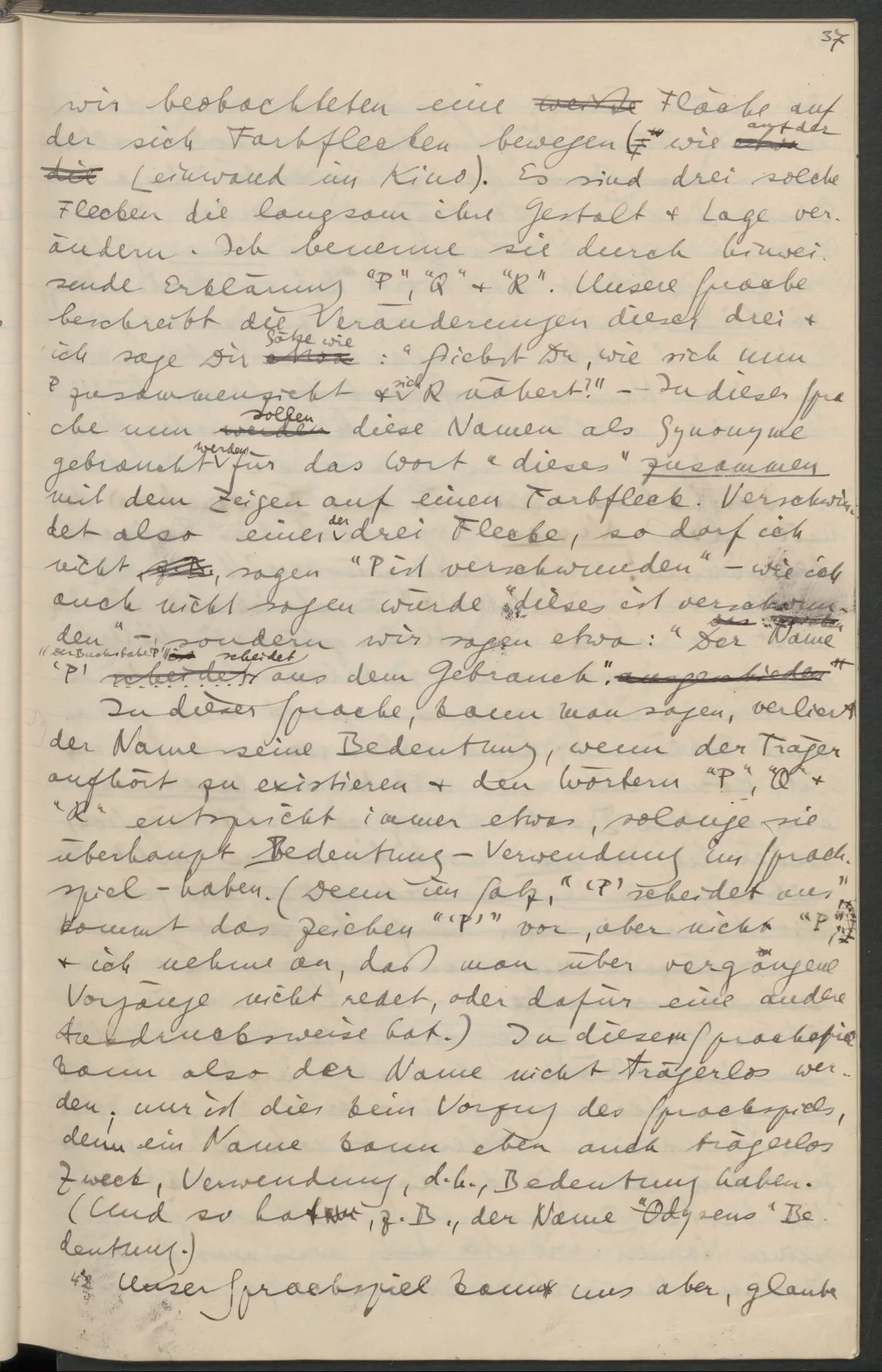 168 Was ist nun an dem Satz, das Lesen sei doch ‘ein ganz bestimmter Vorgang’? Das heißt doch wohl, beim Lesen finde immer ein bestimmter Vorgang statt, den wir wiedererkennen. – Aber wenn ich nun einmal einen deutschen Satz lese & einandermal nach Noten Klavier spiele, – findet hier wirklich der gleiche seelische Vorgang statt? ‒ ‒ Dahingegen ist aber freilich eine Gleichförmigkeit im Erlebnis des Lesens einer Druckseite! Denn der Vorgang ist ja ein gleichförmiger. Und es ist ja leicht verständlich, daß sich dieser Vorgang unterscheidet von dem etwa, sechs Wörter beim Anblick beliebiger Striche einfallen zu lassen. – Denn schon der bloße Anblick einer gedruckten Zeile ist (ja) ungemein charakteristisch, d.h., ein ganz spezielles Bild: Die Buchstaben alle von ungefähr der gleichen Größe, auch der Gestalt nach verwandt, immer wiederkehrend; die Wörter, die zum großen Teil sich ständig wiederholen & uns unendlich wohlvertraut sind, ganz wie wohlvertraute Gesichter. – Denke an das Unbehagen, das wir empfinden, wenn die Rechtschreibung eines Wortes geändert wird (auch an die noch tieferen Gefühle, die Fragen der Schreibung von Wörtern aufgeregt haben). Freilich, nicht jede Zeichenform hat sich uns tief eingeprägt. Ein Zeichen, wie Russells “~” für die Verneinung, kann durch ein beliebiges andere ersetzt werden, ohne daß tiefe Gefühle in uns aufgeregt würden. – Bedenke, daß das gesehene Wortbild uns in ähnlicher Weise vertraut ist, wie das gehörte.