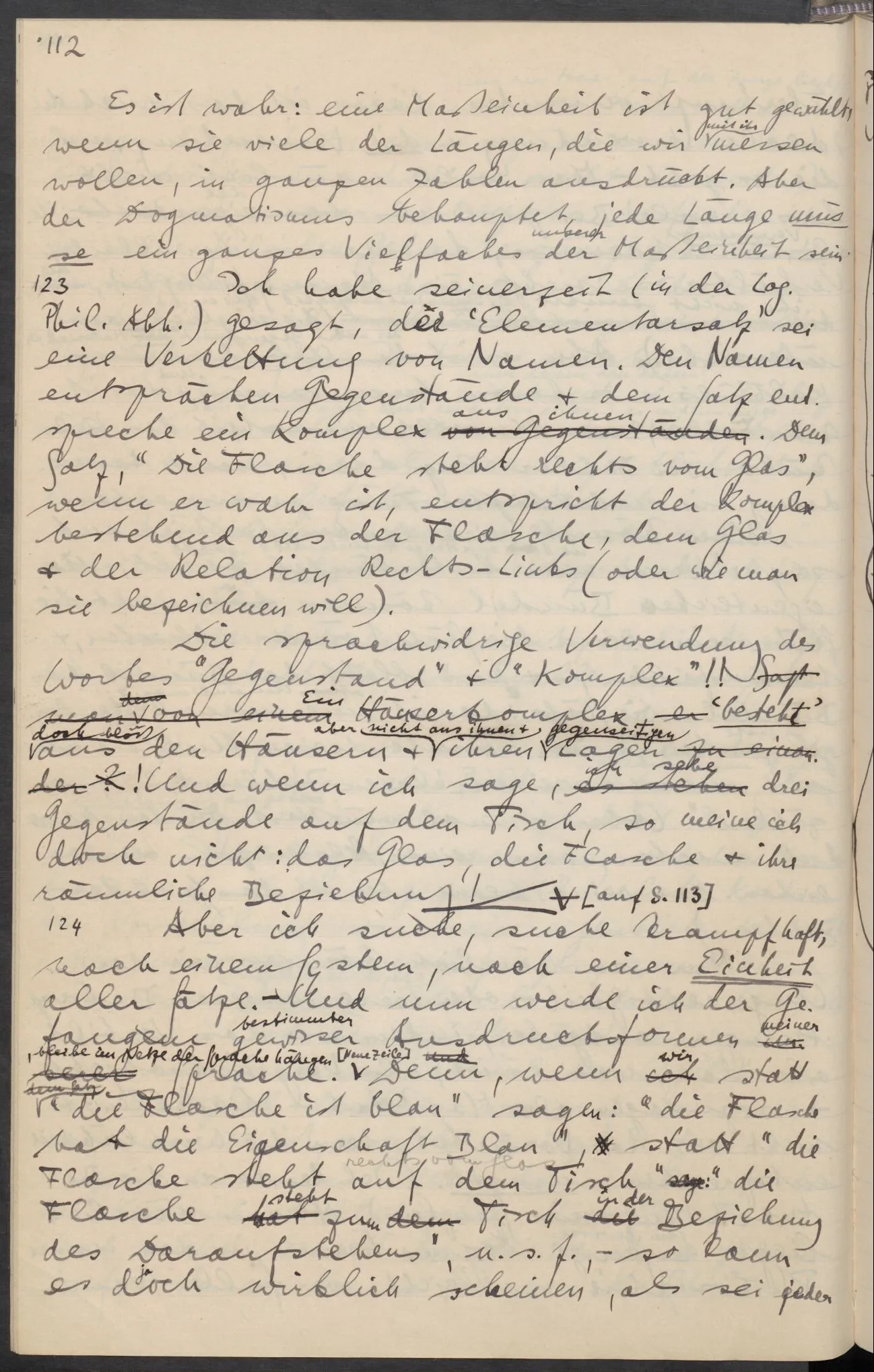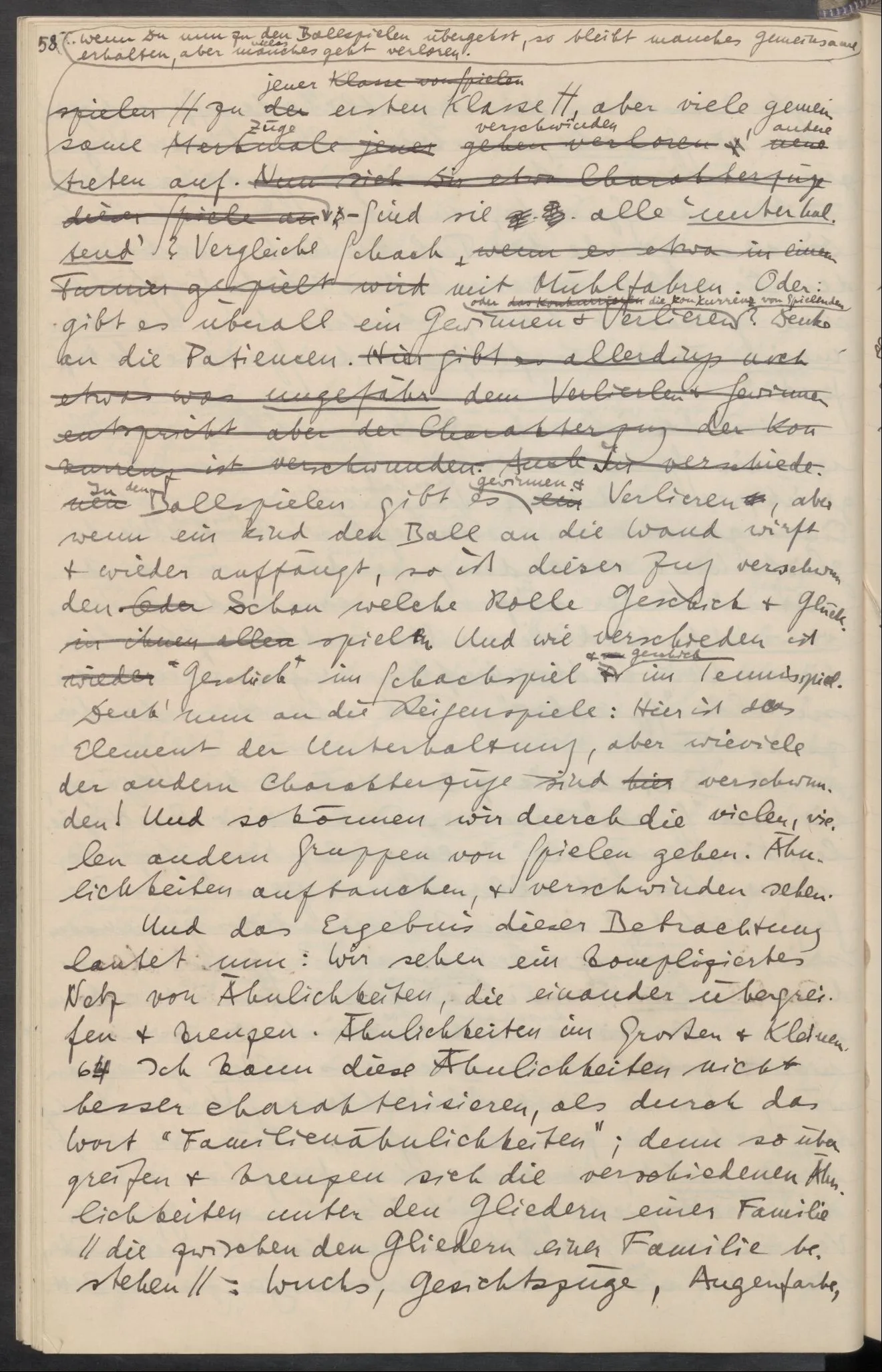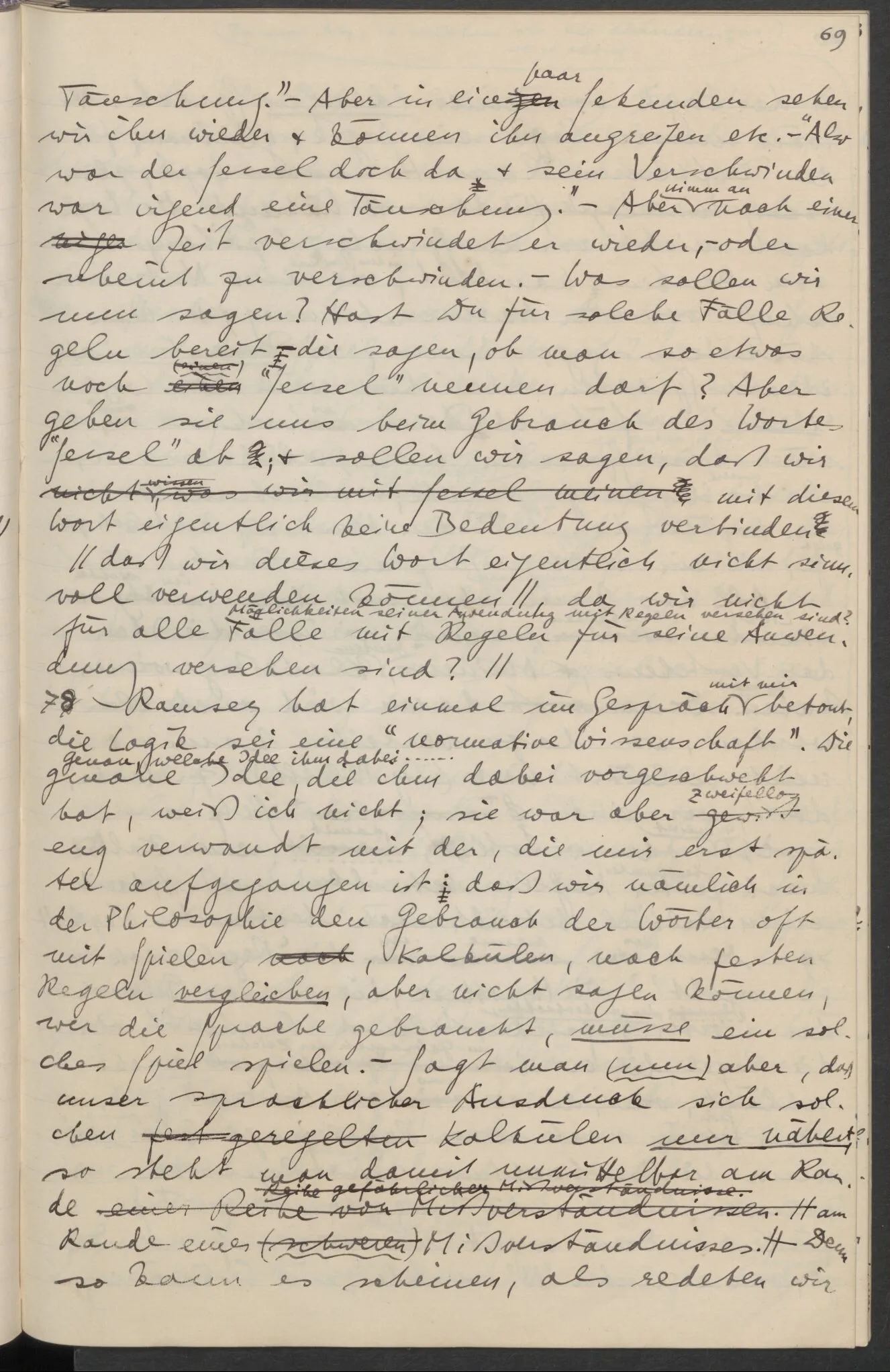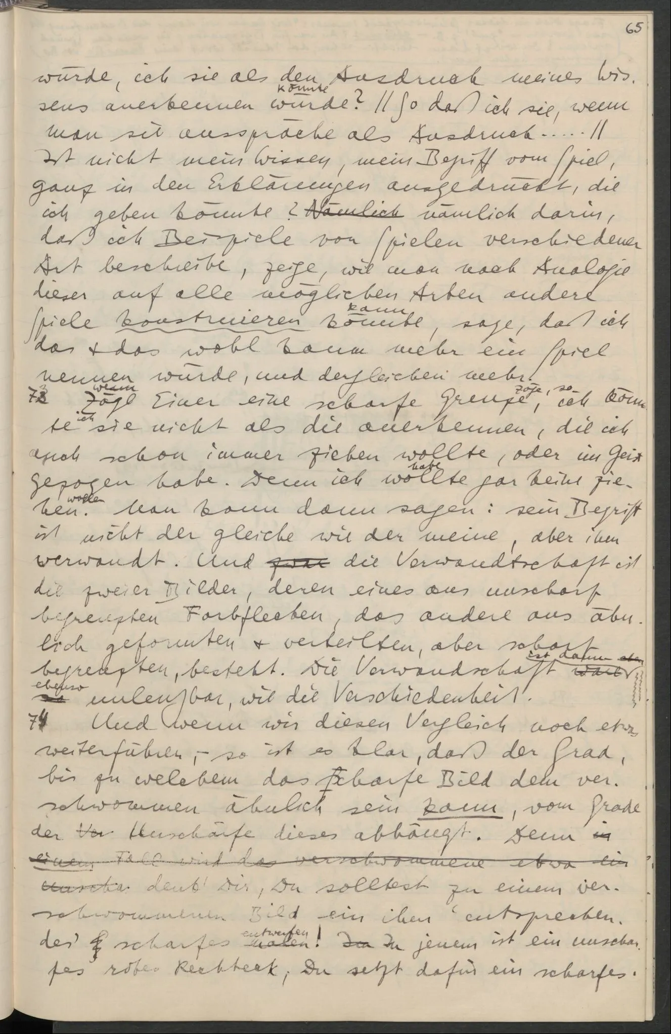 168 Was ist nun an dem Satz, das Lesen sei doch ‘ein ganz bestimmter Vorgang’? Das heißt doch wohl, beim Lesen finde immer ein bestimmter Vorgang statt, den wir wiedererkennen. – Aber wenn ich nun einmal einen deutschen Satz lese & einandermal nach Noten Klavier spiele, – findet hier wirklich der gleiche seelische Vorgang statt? ‒ ‒ Dahingegen ist aber freilich eine Gleichförmigkeit im Erlebnis des Lesens einer Druckseite! Denn der Vorgang ist ja ein gleichförmiger. Und es ist ja leicht verständlich, daß sich dieser Vorgang unterscheidet von dem etwa, sechs Wörter beim Anblick beliebiger Striche einfallen zu lassen. – Denn schon der bloße Anblick einer gedruckten Zeile ist (ja) ungemein charakteristisch, d.h., ein ganz spezielles Bild: Die Buchstaben alle von ungefähr der gleichen Größe, auch der Gestalt nach verwandt, immer wiederkehrend; die Wörter, die zum großen Teil sich ständig wiederholen & uns unendlich wohlvertraut sind, ganz wie wohlvertraute Gesichter. – Denke an das Unbehagen, das wir empfinden, wenn die Rechtschreibung eines Wortes geändert wird (auch an die noch tieferen Gefühle, die Fragen der Schreibung von Wörtern aufgeregt haben). Freilich, nicht jede Zeichenform hat sich uns tief eingeprägt. Ein Zeichen, wie Russells “~” für die Verneinung, kann durch ein beliebiges andere ersetzt werden, ohne daß tiefe Gefühle in uns aufgeregt würden. – Bedenke, daß das gesehene Wortbild uns in ähnlicher Weise vertraut ist, wie das gehörte.