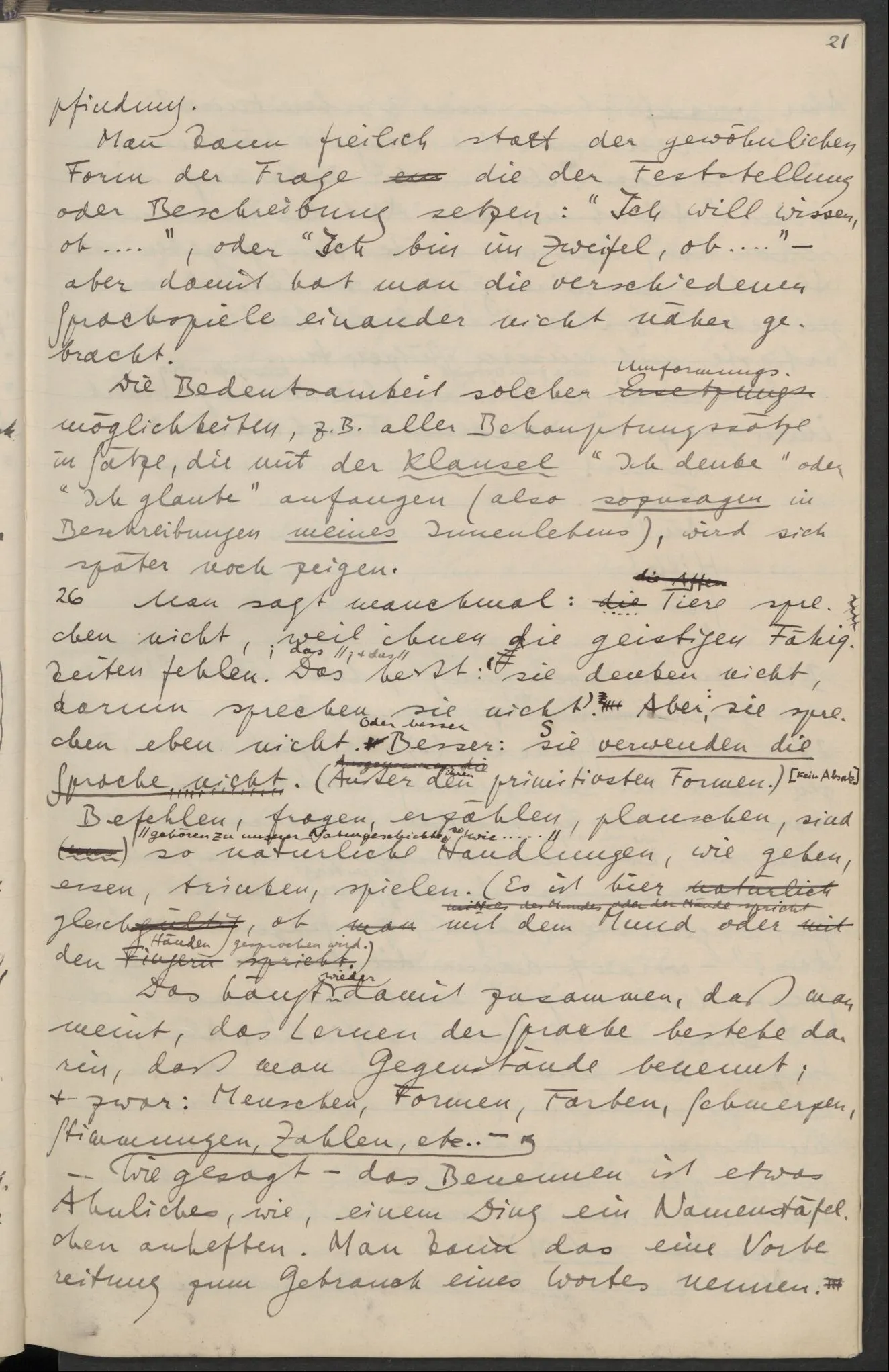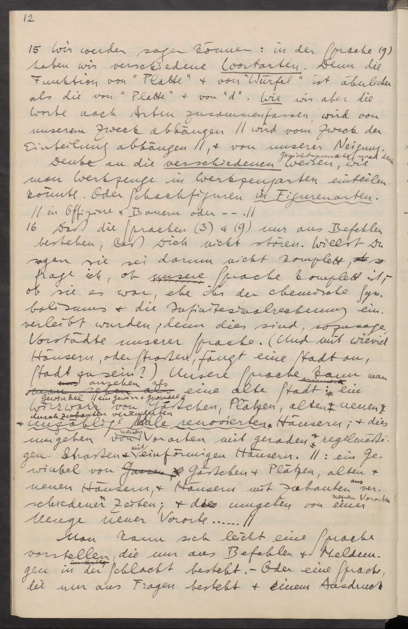 16 Daß die Sprachen (3) & (9) nur aus Befehlen bestehen, laß dich nicht stören. Willst Du sagen sie sei darum nicht komplett, so frage ich, ob unsere Sprache komplett ist, – ob sie es war, ehe ihr der chemische Symbolismus & die Infinitesimalrechnung einverleibt wurden; denn dies sind, sozusagen, Vorstädte unserer Sprache. (Und mit wieviel Häusern, oder Straßen, fängt eine Stadt an, Stadt zu sein?) Unsere Sprache kann man ansehen als eine alte Stadt: ein Wirrwarr von Gäßchen, Plätzen, alten, neuen & unzählige Male renovierten Häusern; & dies umgeben von neuen Vororten mit geraden& regelmäßigen Straßen & mit einförmigen Häusern. Man kann sich leicht eine Sprache vorstellen, die nur aus Befehlen und Meldungen in der Schlacht besteht. – Oder eine Sprache, die nur aus Fragen besteht und einem Ausdruck der Bejahung & der Verneinung. Und unzähliges andre. – Und sich eine Sprache vorstellen heißt, (sich) eine Lebensform vorstellen.
