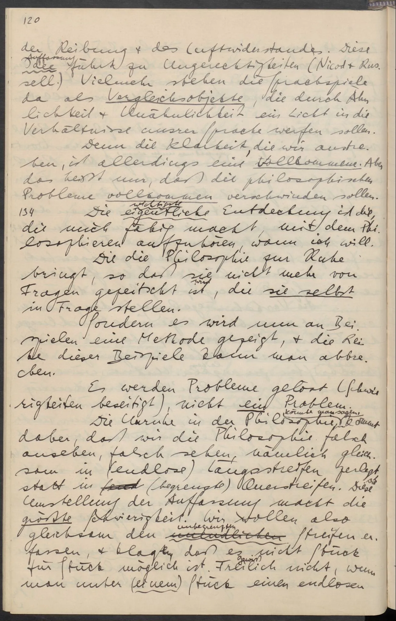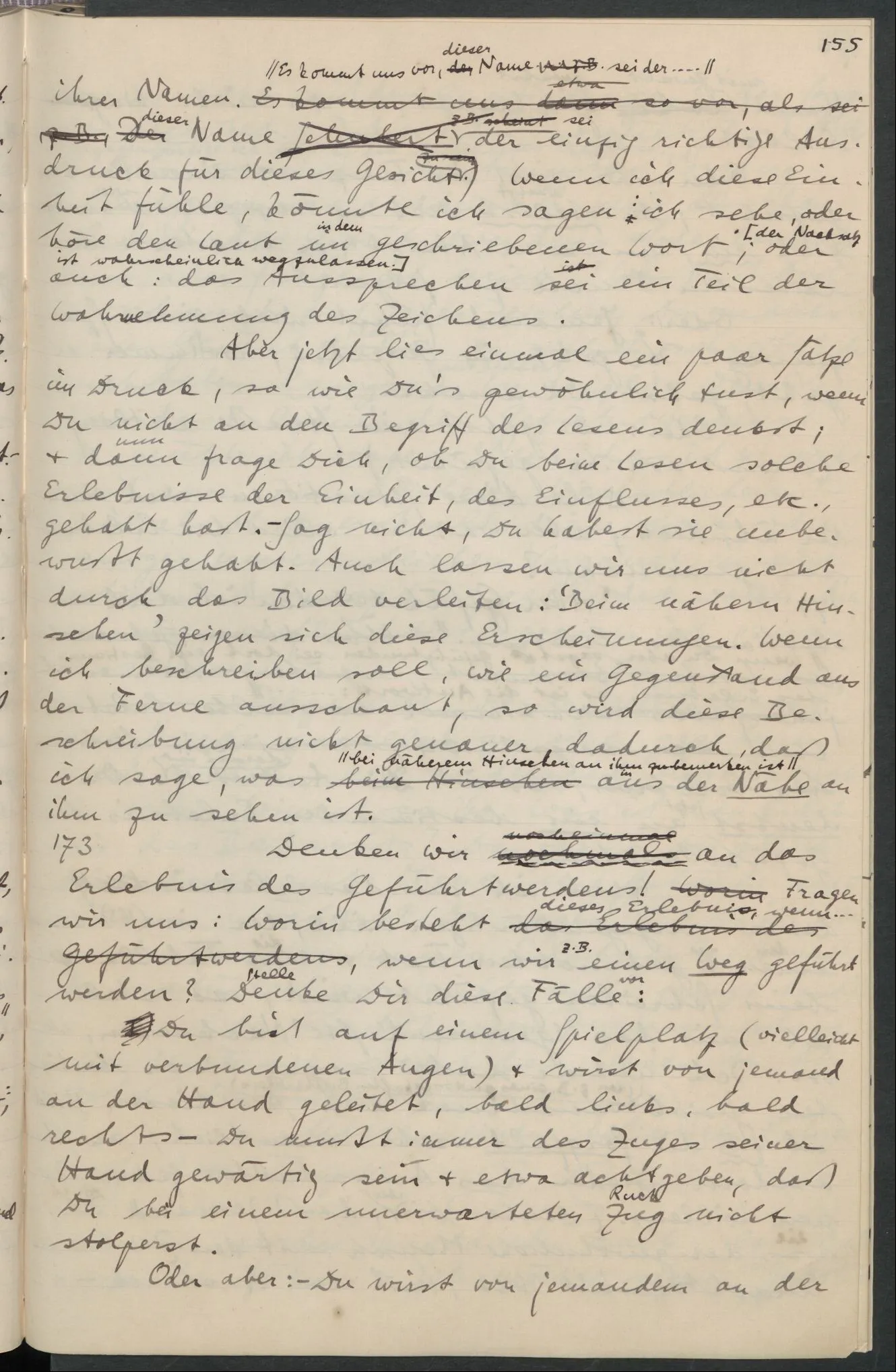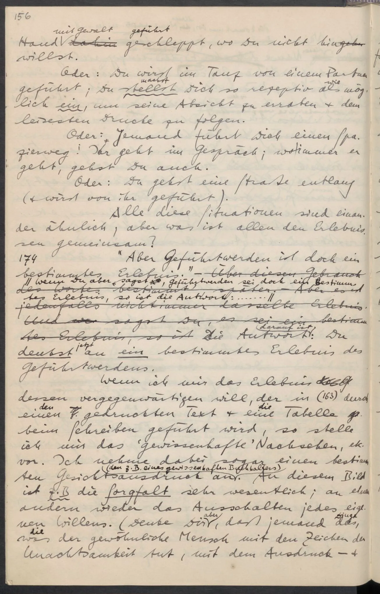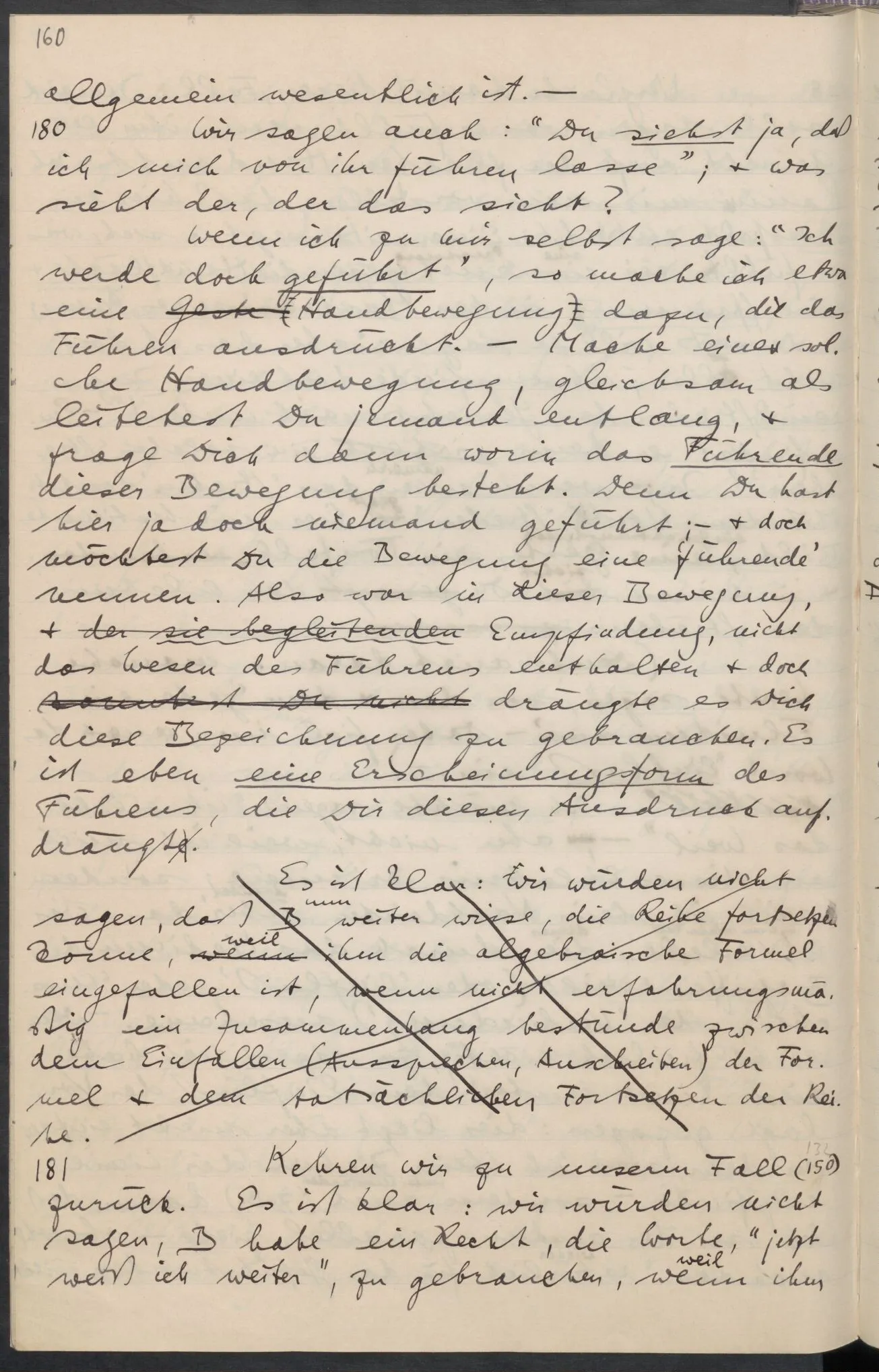 180 Wir sagen auch: “Du siehst ja, daß ich mich von ihr führen lasse”; & was sieht der, der das sieht? Wenn ich zu mir selbst sage: “Ich werde doch geführt”, so mache ich etwa eine Handbewegung dazu, die das Führen ausdrückt. – Mache eine solche Handbewegung, gleichsam als leitetest Du jemand entlang, & frage Dich dann, worin das Führende dieser Bewegung besteht. Denn Du hast hier ja doch niemand geführt; – & doch möchtest Du die Bewegung eine ‘führende’ nennen. Also war in dieser Bewegung, & Empfindung, nicht das Wesen des Führens enthalten & doch drängte es Dich diese Bezeichnung zu gebrauchen. Es ist eben eine Erscheinungsform des Führens, die Dir diesen Ausdruck aufdrängt.