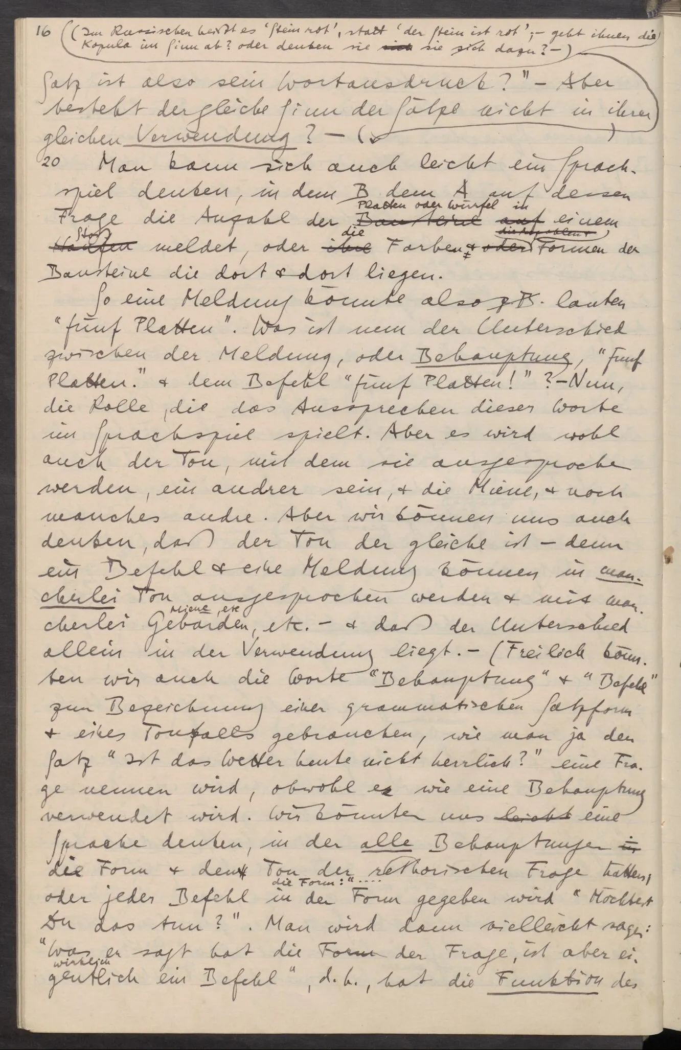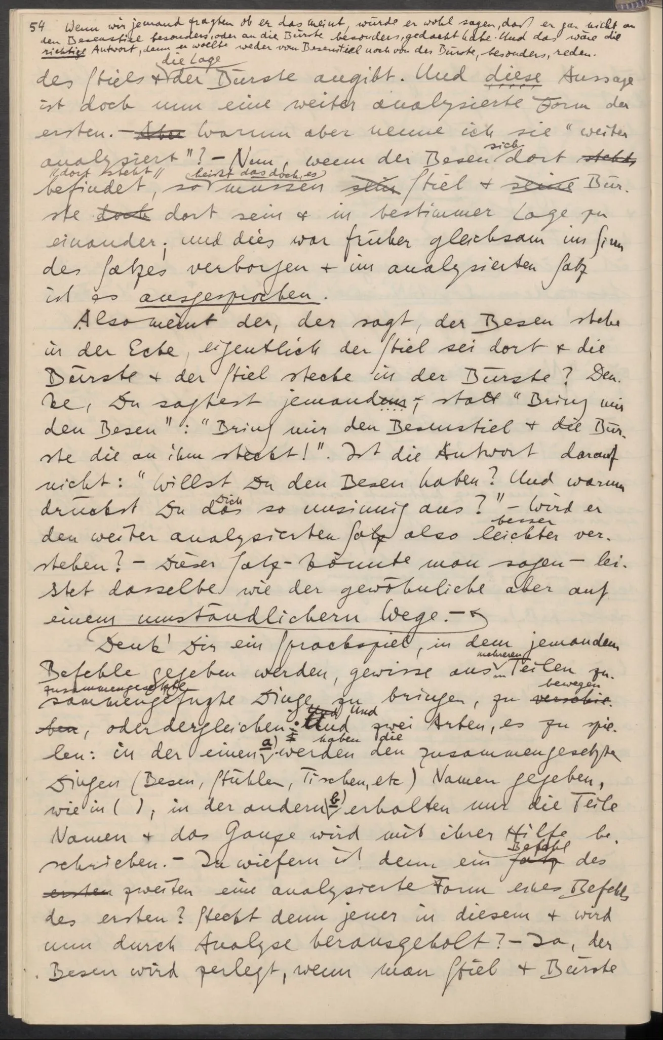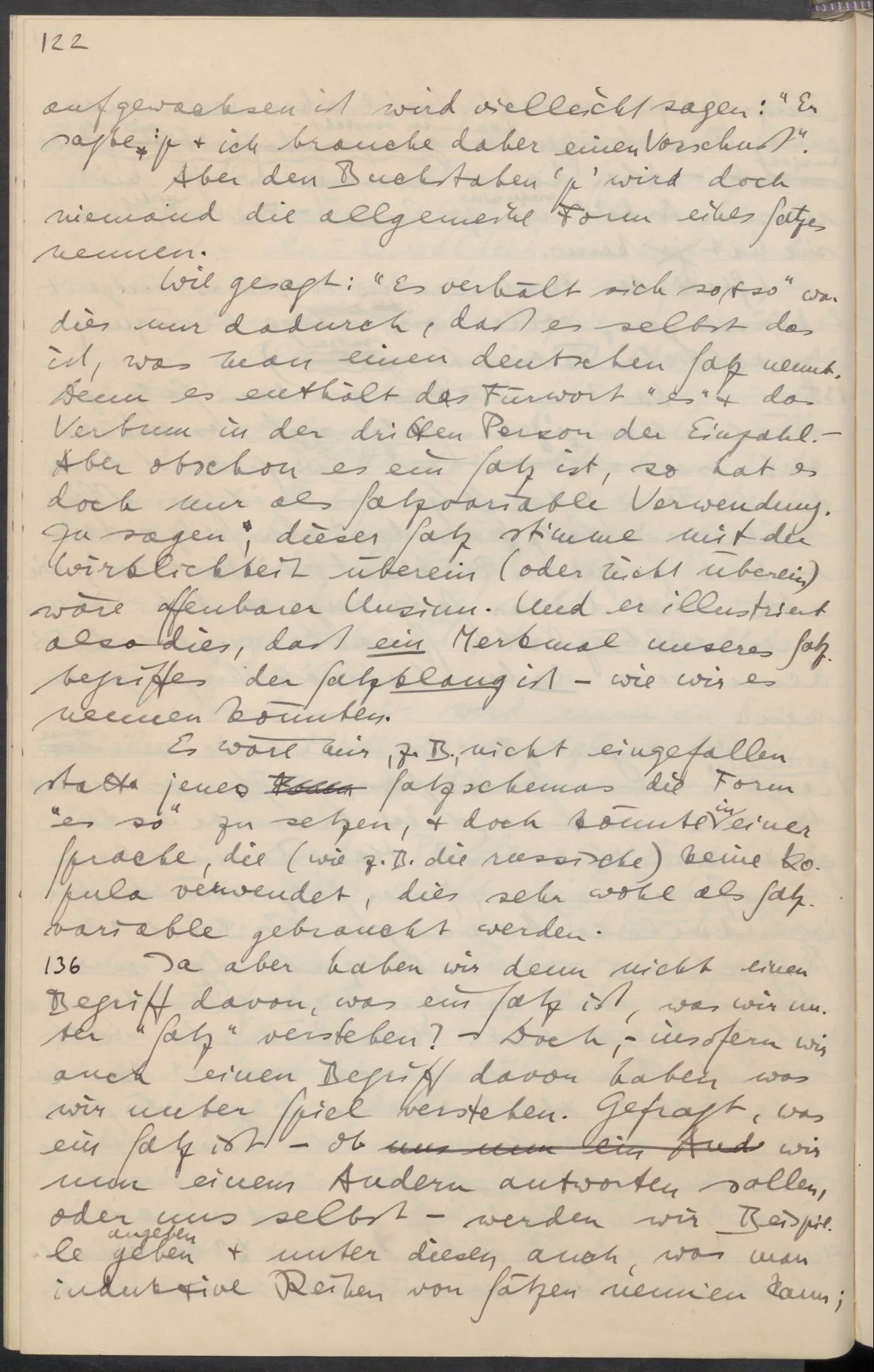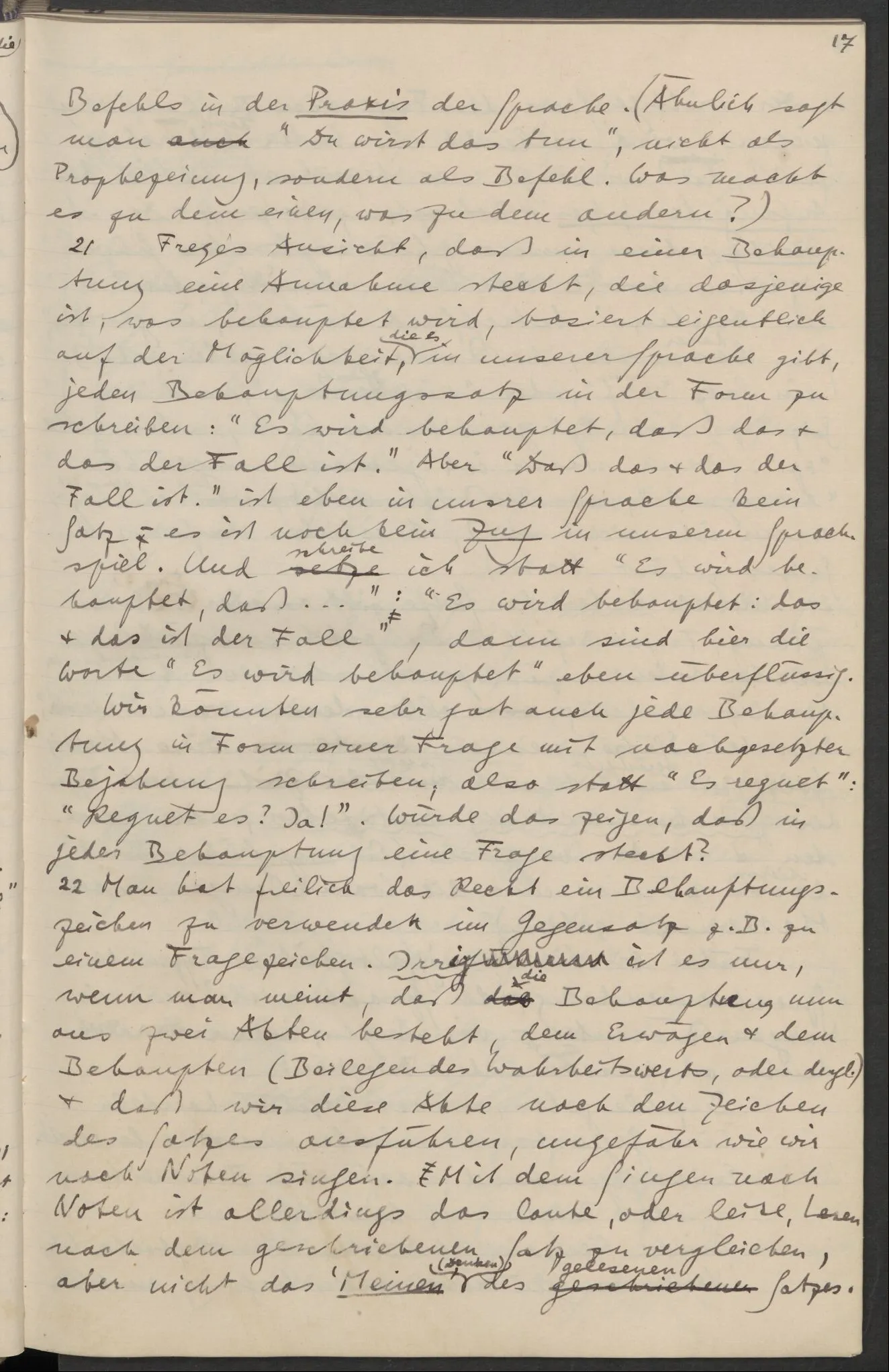 23 Der wichtige Sinn des Fregeschen Behauptungszeichens wird vielleicht am besten dadurch gefaßt, daß wir sagen: es bezeichnet deutlich den Anfang des Satzes. – Das ist wichtig, denn unsere philosophischen Schwierigkeiten das Wesen der ‘Negation’ & des ‘Denkens’ betreffend rühren, in gewissem Sinn daher, daß wir nicht sehen, daß ein Satz “⊢ ~ p”, oder “⊢ ich denke p”, oder”, mit dem Satz ⊢ p” wohl “p” gemeinsam hat, aber nicht “⊢ p”. (Denn wenn ich jemand sagen höre “es regnet”, so weiß ich nicht was er sagt, wenn ich nicht weiß, ob ich den Anfang des Satzes gehört habe.)