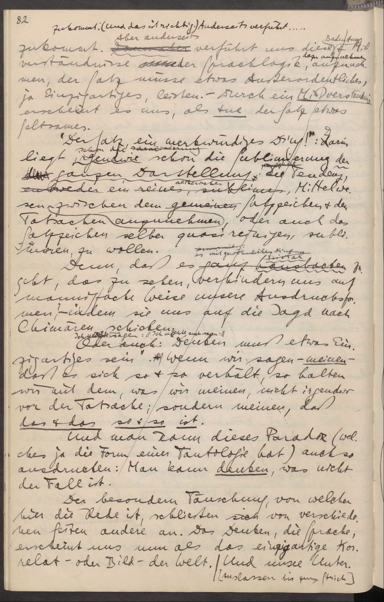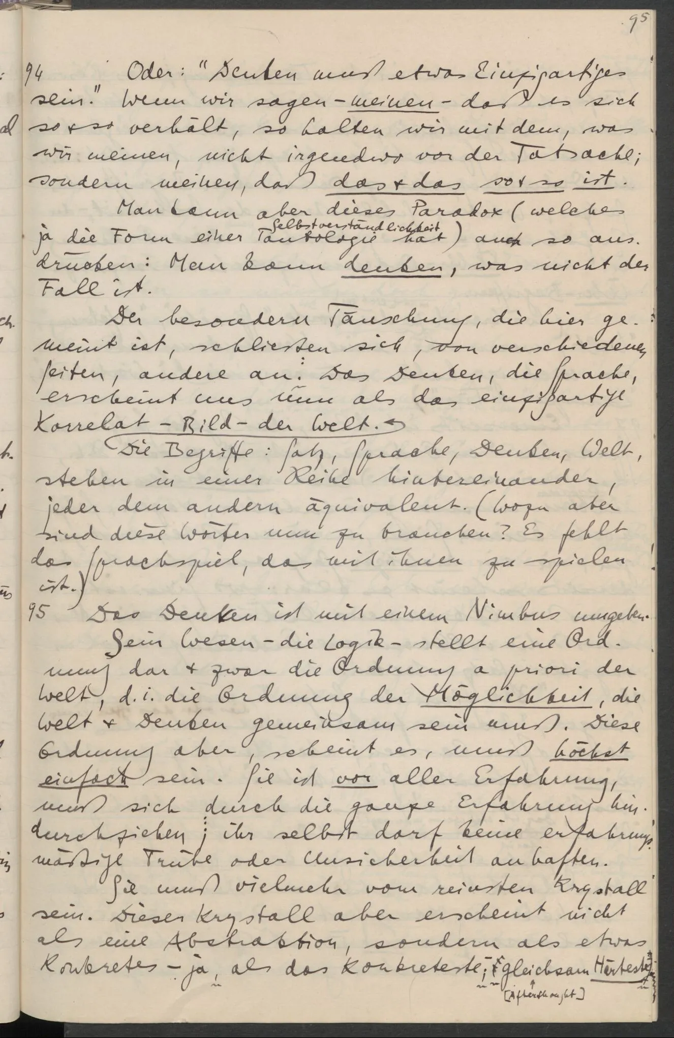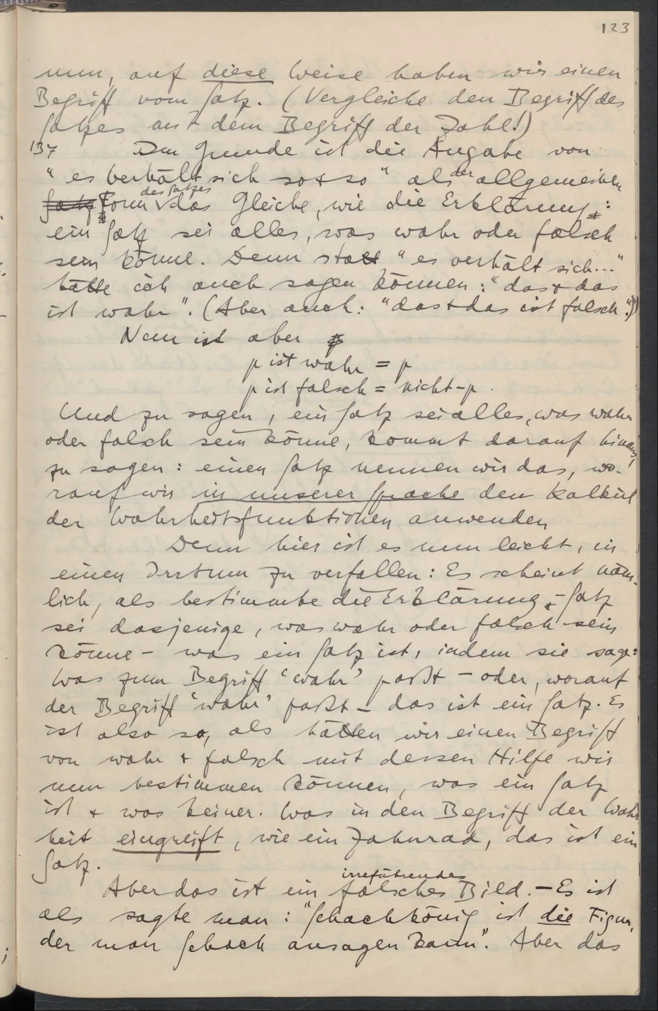 23 Der wichtige Sinn des Fregeschen Behauptungszeichens wird vielleicht am besten dadurch gefaßt, daß wir sagen: es bezeichnet deutlich den Anfang des Satzes. – Das ist wichtig, denn unsere philosophischen Schwierigkeiten das Wesen der ‘Negation’ & des ‘Denkens’ betreffend rühren, in gewissem Sinn daher, daß wir nicht sehen, daß ein Satz “⊢ ~ p”, oder “⊢ ich denke p”, oder”, mit dem Satz ⊢ p” wohl “p” gemeinsam hat, aber nicht “⊢ p”. (Denn wenn ich jemand sagen höre “es regnet”, so weiß ich nicht was er sagt, wenn ich nicht weiß, ob ich den Anfang des Satzes gehört habe.)