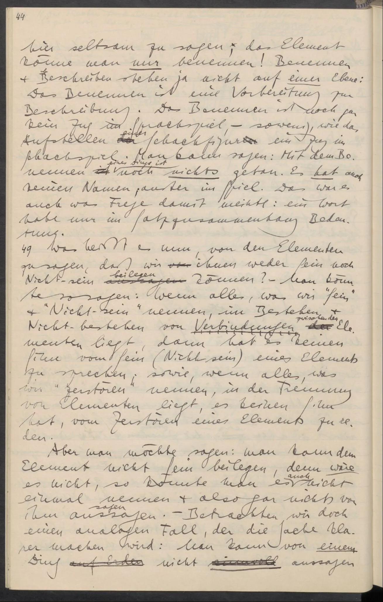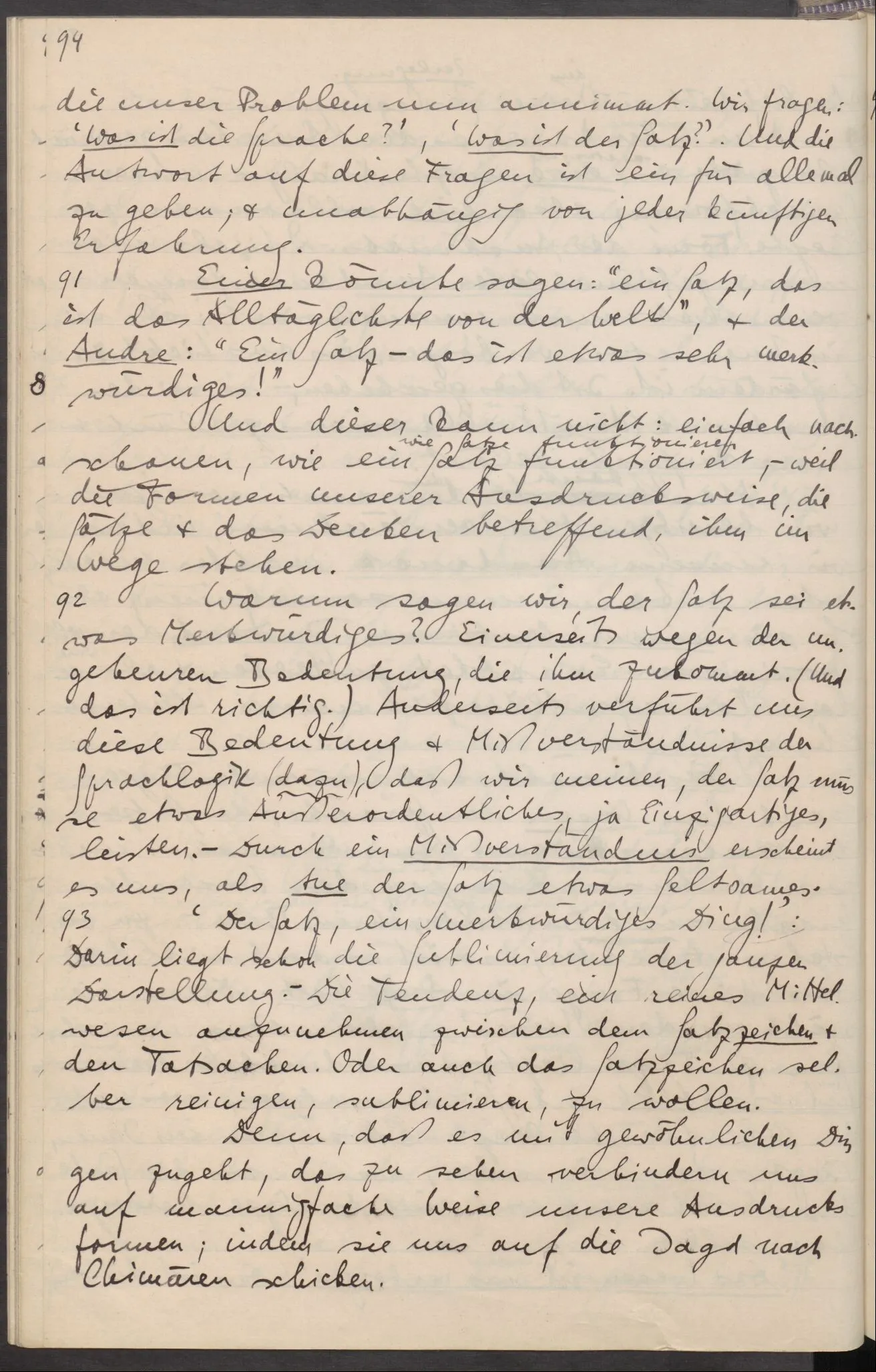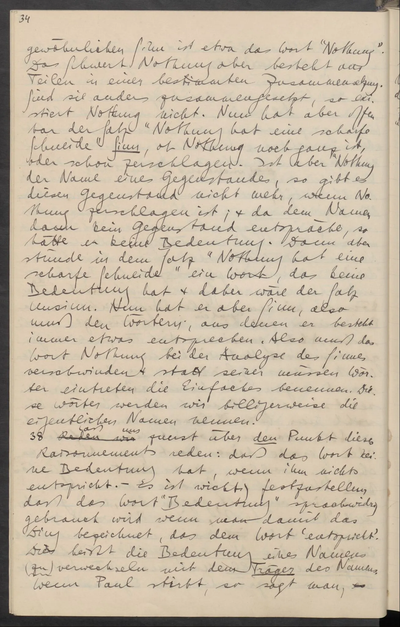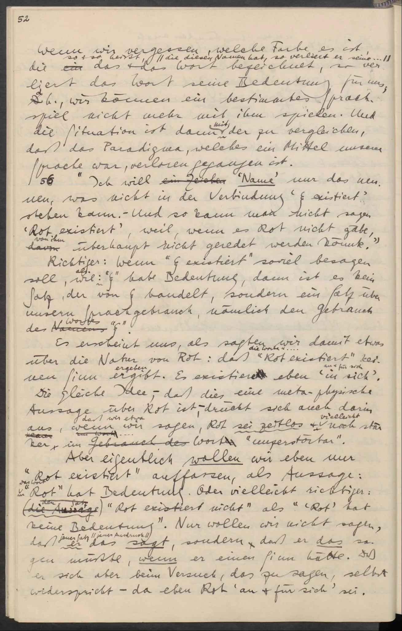 23 Der wichtige Sinn des Fregeschen Behauptungszeichens wird vielleicht am besten dadurch gefaßt, daß wir sagen: es bezeichnet deutlich den Anfang des Satzes. – Das ist wichtig, denn unsere philosophischen Schwierigkeiten das Wesen der ‘Negation’ & des ‘Denkens’ betreffend rühren, in gewissem Sinn daher, daß wir nicht sehen, daß ein Satz “⊢ ~ p”, oder “⊢ ich denke p”, oder”, mit dem Satz ⊢ p” wohl “p” gemeinsam hat, aber nicht “⊢ p”. (Denn wenn ich jemand sagen höre “es regnet”, so weiß ich nicht was er sagt, wenn ich nicht weiß, ob ich den Anfang des Satzes gehört habe.)