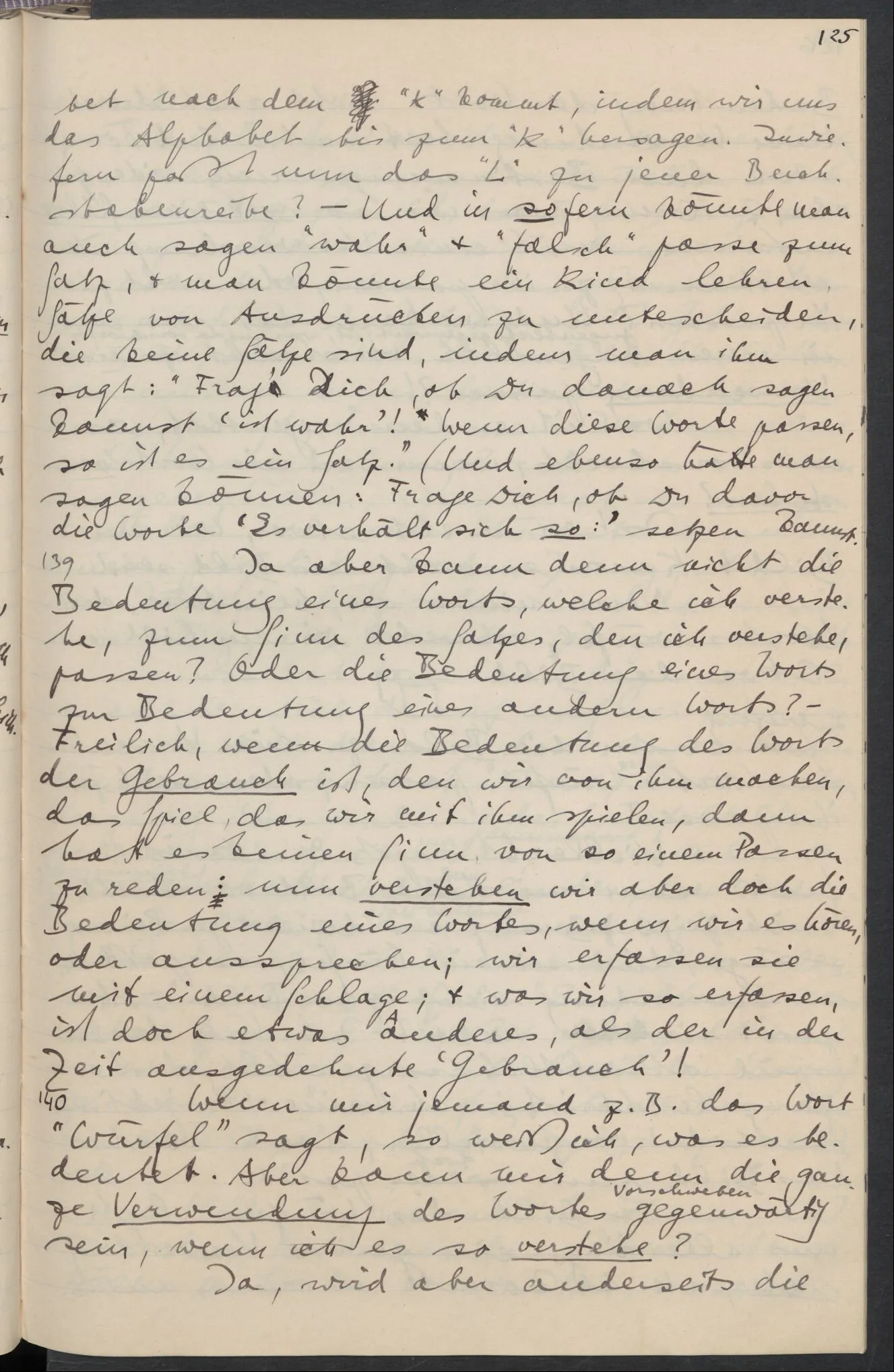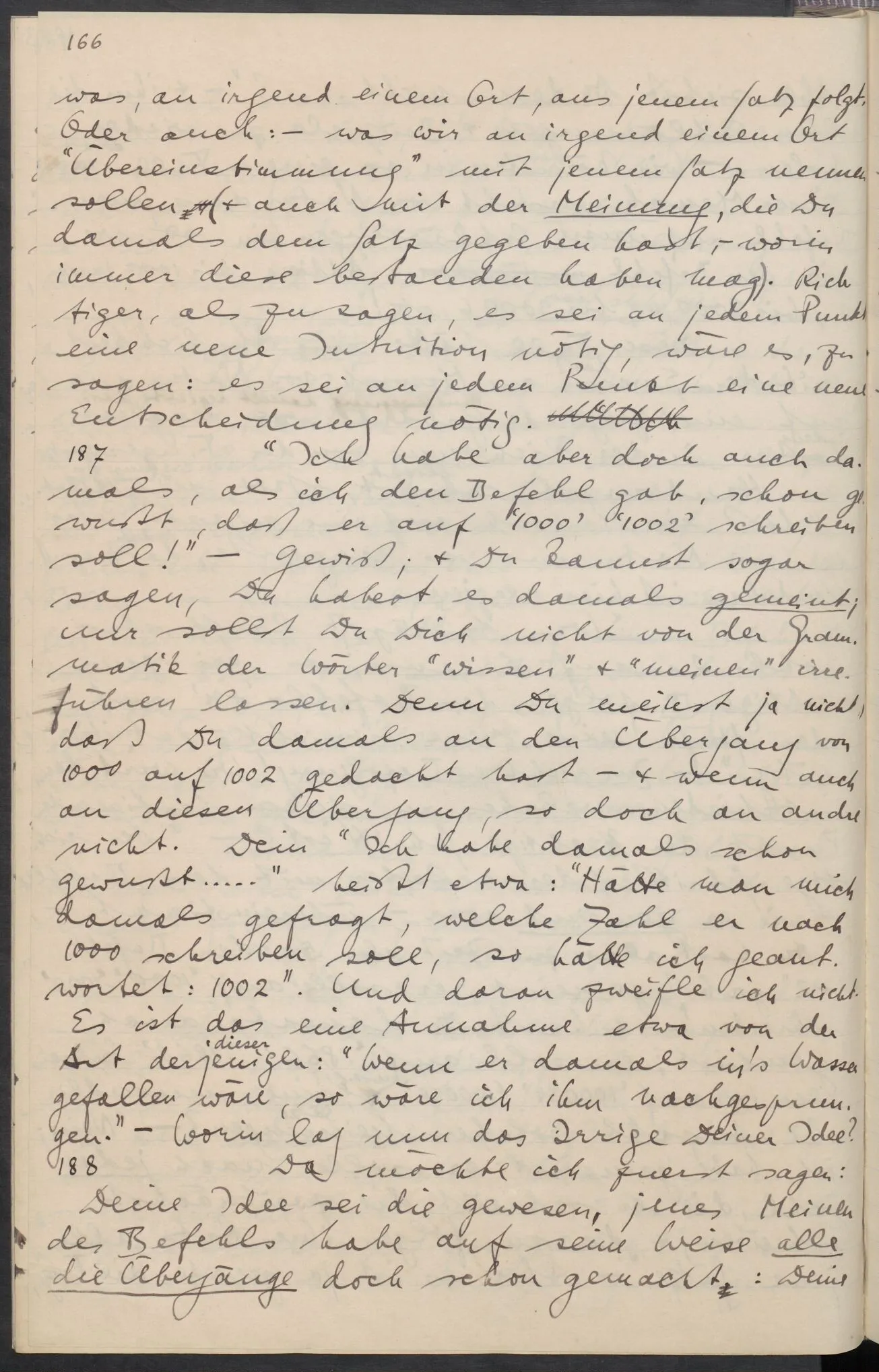 187 “Ich habe aber doch auch damals, als ich den Befehl gab, schon gewußt, daß er auf ‘1000’ ‘1002’ schreiben soll!” – Gewiß; & Du kannst sogar sagen, Du habest es damals gemeint; nur sollst Du Dich nicht von der Grammatik der Wörter “wissen” & “meinen” irreführen lassen. Denn Du meinst ja nicht, daß Du damals an den Übergang von 1000 auf 1002 gedacht hast – & wenn auch an diesen Übergang, so doch an andre nicht. Dein “Ich habe damals schon gewußt …” heißt etwa: “Hätte man mich damals gefragt, welche Zahl er nach 1000 schreiben soll, so hätte ich geantwortet, 1002”. Und daran zweifle ich nicht. Es ist das eine Annahme etwa von der Art derjenigen: “Wenn er damals in’s Wasser gefallen wäre, so wäre ich ihm nachgesprungen.” – Worin lag nun das Irrige Deiner Idee?
