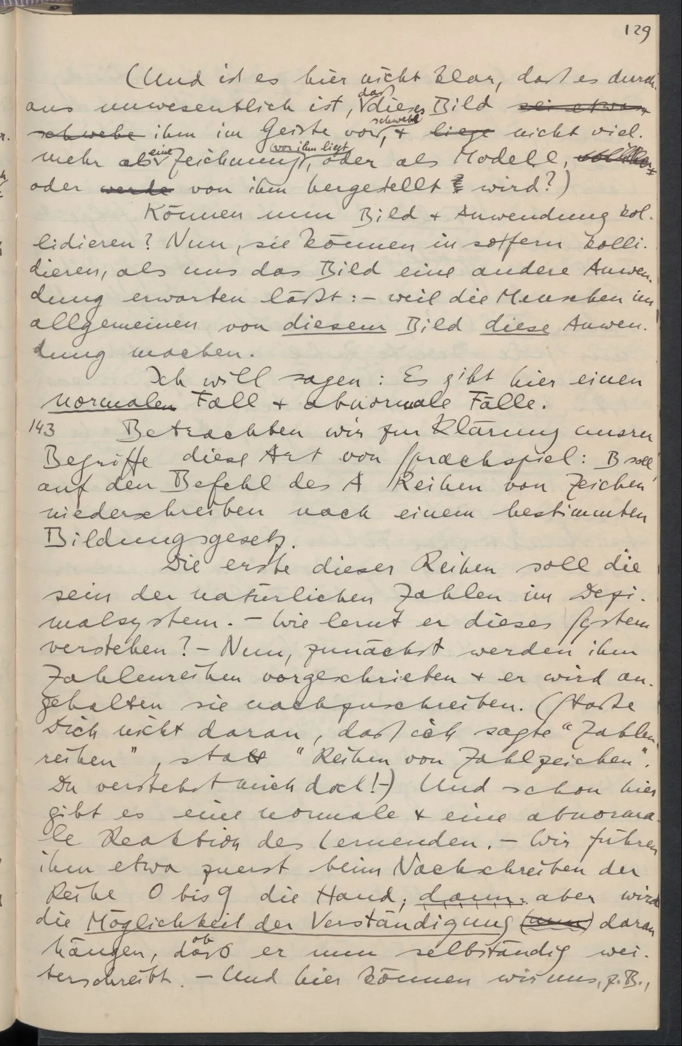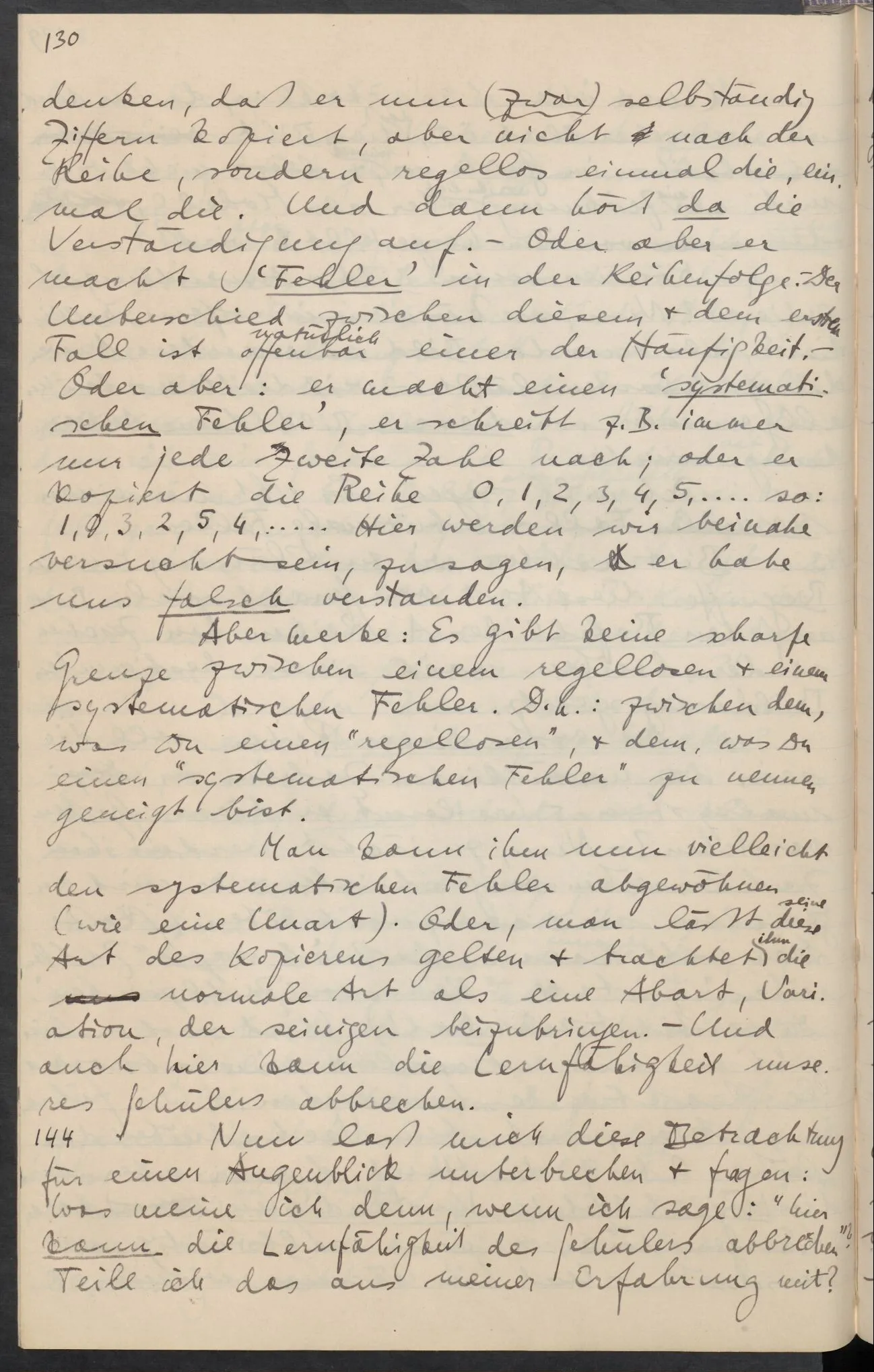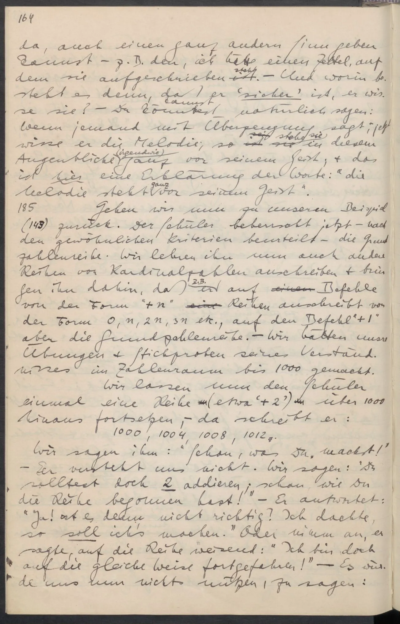 185 Gehen wir nun zu unserm Beispiel (143) zurück. Der Schüler beherrscht jetzt – nach den gewöhnlichen Kriterien beurteilt – die Grundzahlenreihe. Wir lehren ihn nun auch andere Reihen von Kardinalzahlen anschreiben & bringen ihn dahin, daß er z.B. auf Befehle von der Form “ + n” Reihen anschreibt von der Form 0, n, 2n, 3n, etc., auf den Befehl “ + 1” aber die Grundzahlenreihe. – Wir hätten unsre Übungen und Stichproben seines Verständnisses im Zahlenraum bis 1000 gemacht. Wir lassen nun den Schüler einmal eine Reihe (etwa ‘ + 2’) über 1000 hinaus fortsetzen, – da schreibt er: