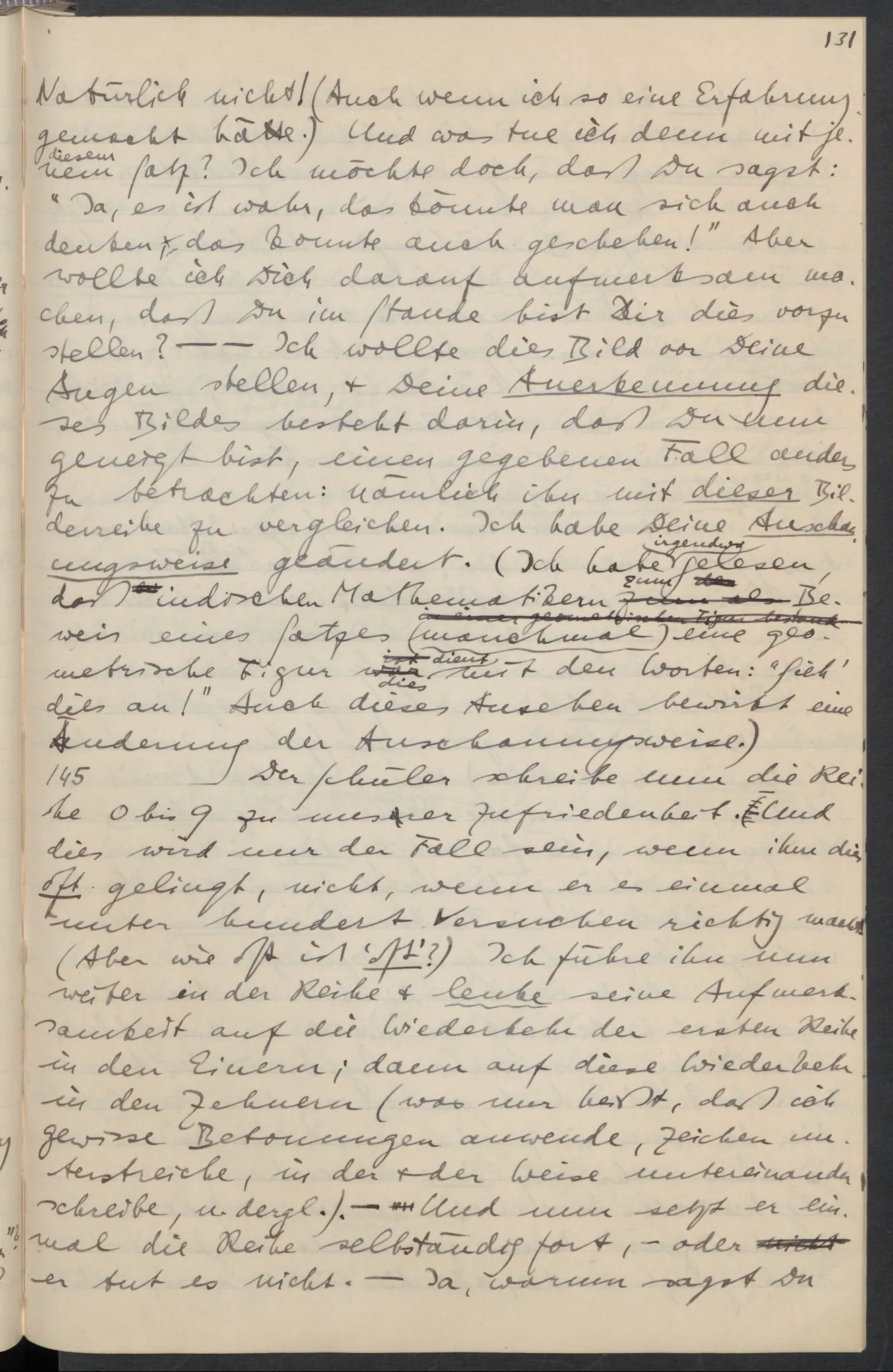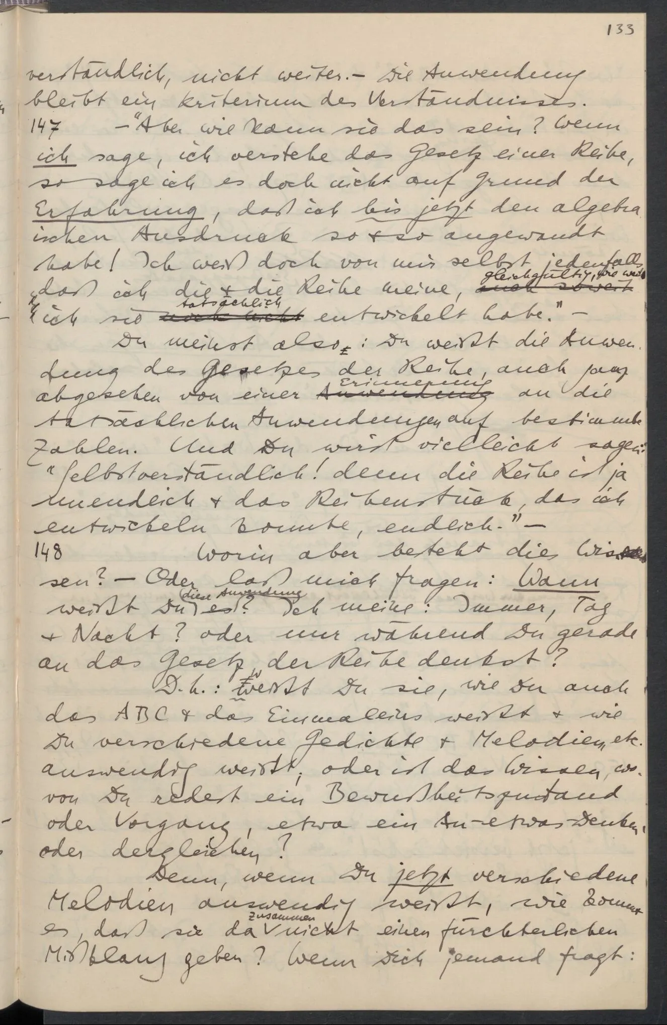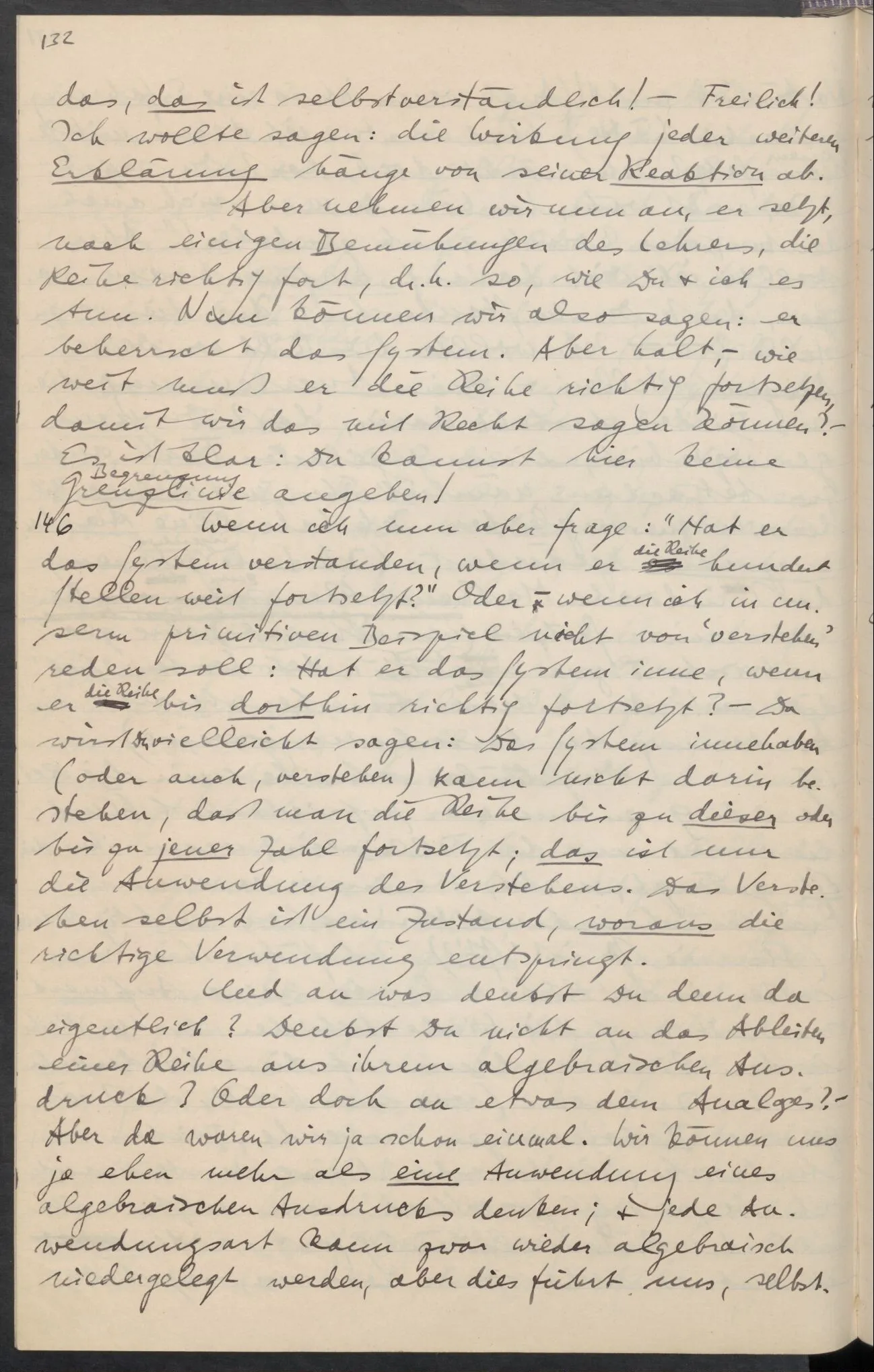 185 Gehen wir nun zu unserm Beispiel (143) zurück. Der Schüler beherrscht jetzt – nach den gewöhnlichen Kriterien beurteilt – die Grundzahlenreihe. Wir lehren ihn nun auch andere Reihen von Kardinalzahlen anschreiben & bringen ihn dahin, daß er z.B. auf Befehle von der Form “ + n” Reihen anschreibt von der Form 0, n, 2n, 3n, etc., auf den Befehl “ + 1” aber die Grundzahlenreihe. – Wir hätten unsre Übungen und Stichproben seines Verständnisses im Zahlenraum bis 1000 gemacht. Wir lassen nun den Schüler einmal eine Reihe (etwa ‘ + 2’) über 1000 hinaus fortsetzen, – da schreibt er: