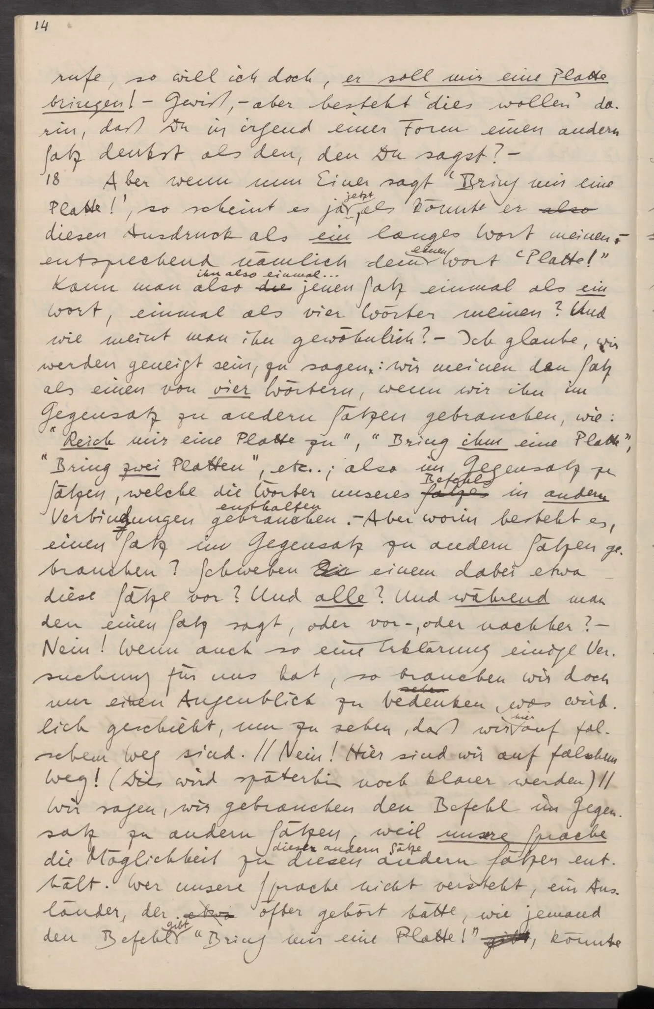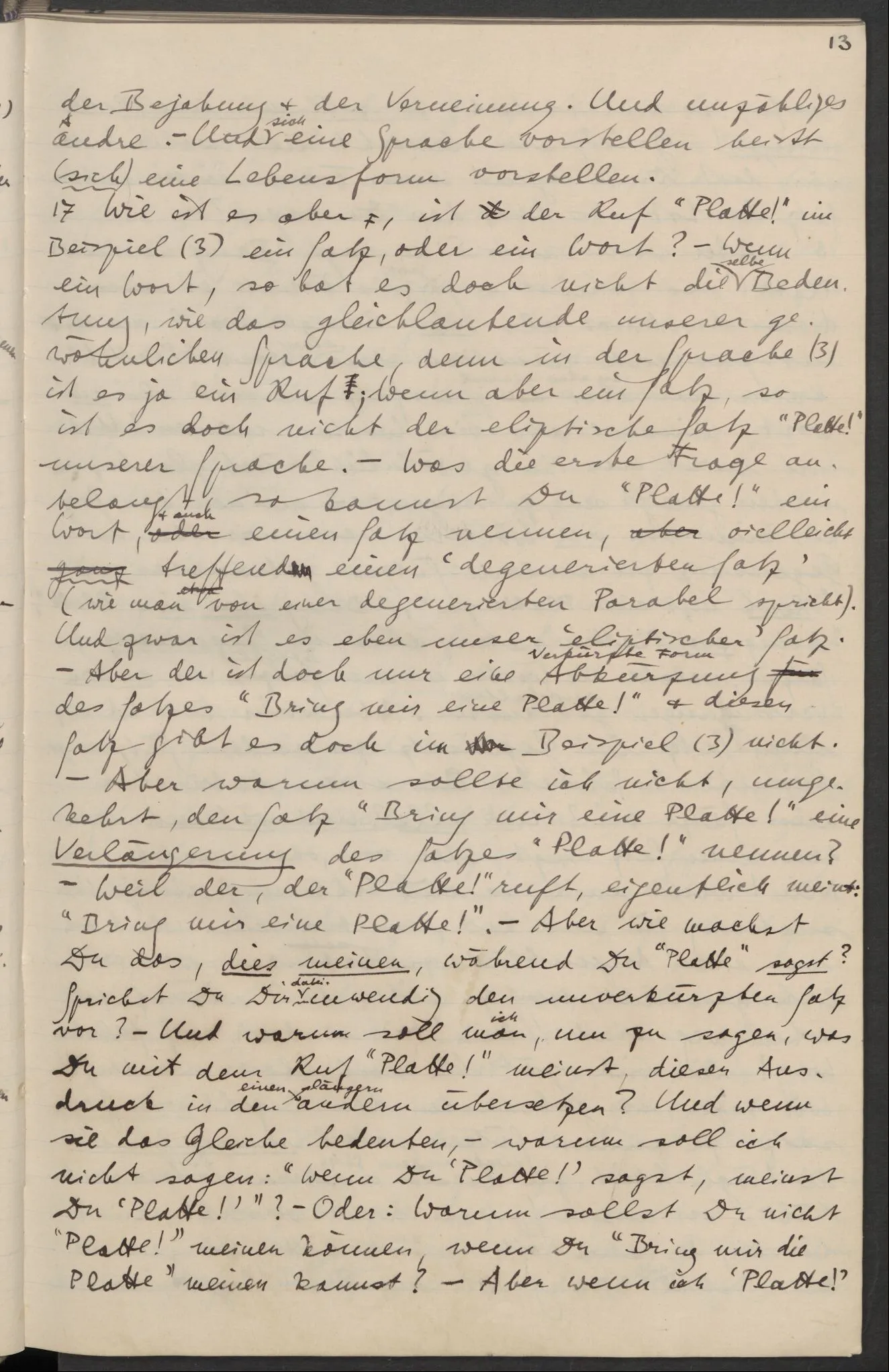 17 Wie ist es aber, ist der Ruf “Platte!” im Beispiel (3) ein Satz, oder ein Wort? – Wenn ein Wort, so hat es doch nicht dieselbe Bedeutung, wie das gleichlautende unserer gewöhnlichen Sprache, denn in der Sprache (3) ist es ja ein Ruf; wenn aber ein Satz, so ist es doch nicht der elliptische Satz “Platte!” unserer Sprache. – Was die erste Frage anbelangt, so kannst Du “Platte!” ein Wort, & auch einen Satz nennen, vielleicht treffend einen ‘degenerierten Satz’ (wie man von einer degenerierten Parabel spricht). Und zwar ist es eben unser ‘elliptischer’ Satz. – Aber der ist doch nur eine Abkürzung des Satzes “Bring mir eine Platte!” & diesen Satz gibt es doch im Beispiel (3) nicht. – Aber warum sollte ich nicht, umgekehrt, den Satz “Bring mir eine Platte!” eine Verlängerung des Satzes “Platte!” nennen? – Weil der, der “Platte!” ruft, eigentlich meint: “Bring mir eine Platte!”. – Aber wie machst Du das, dies meinen, während Du “Platte” sagst? Sprichst Du Dir dabei inwendig den unverkürzten Satz vor? Und warum soll man, um zu sagen, was Du mit dem Ruf “Platte!” meinst, diesen Ausdruck in den andern übersetzen? Und wenn sie das Gleiche bedeuten, – warum soll ich nicht sagen: “Wenn Du ‘Platte!’ sagst, meinst Du ‘Platte!’”? – Oder: Warum sollst Du nicht “Platte!” meinen können, wenn Du “Bring mir die Platte!” meinen kannst? – Aber wenn ich ‘Platte!’ rufe, so will ich doch, er soll mir eine Platte bringen! – Gewiß, – aber besteht ‘dies wollen’ darin, daß Du in irgend einer Form einen andern Satz denkst, als den, den Du sagst? –