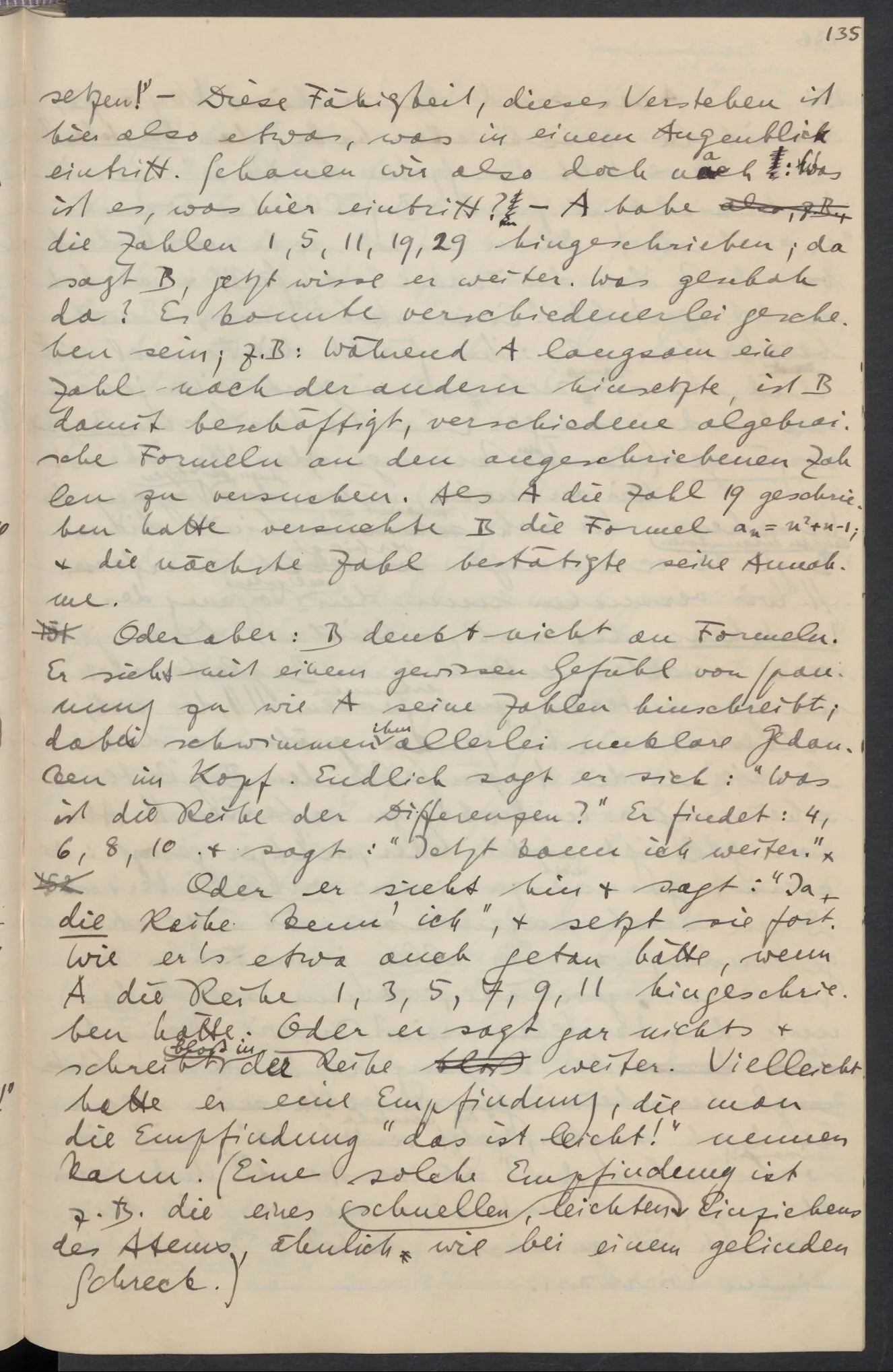 Es ist klar: wir würden nicht sagen, daß B nun weiter wisse, die Reihe fortsetzen könne, weil ihm die algebraische Formel eingefallen ist, wenn nicht erfahrungsmäßig ein Zusammenhang bestünde zwischen dem Einfallen (Aussprechen, Anschreiben) der Formel & dem tatsächlichen Fortsetzen der Reihe.