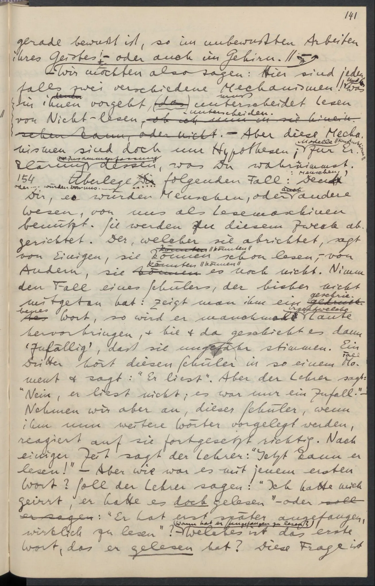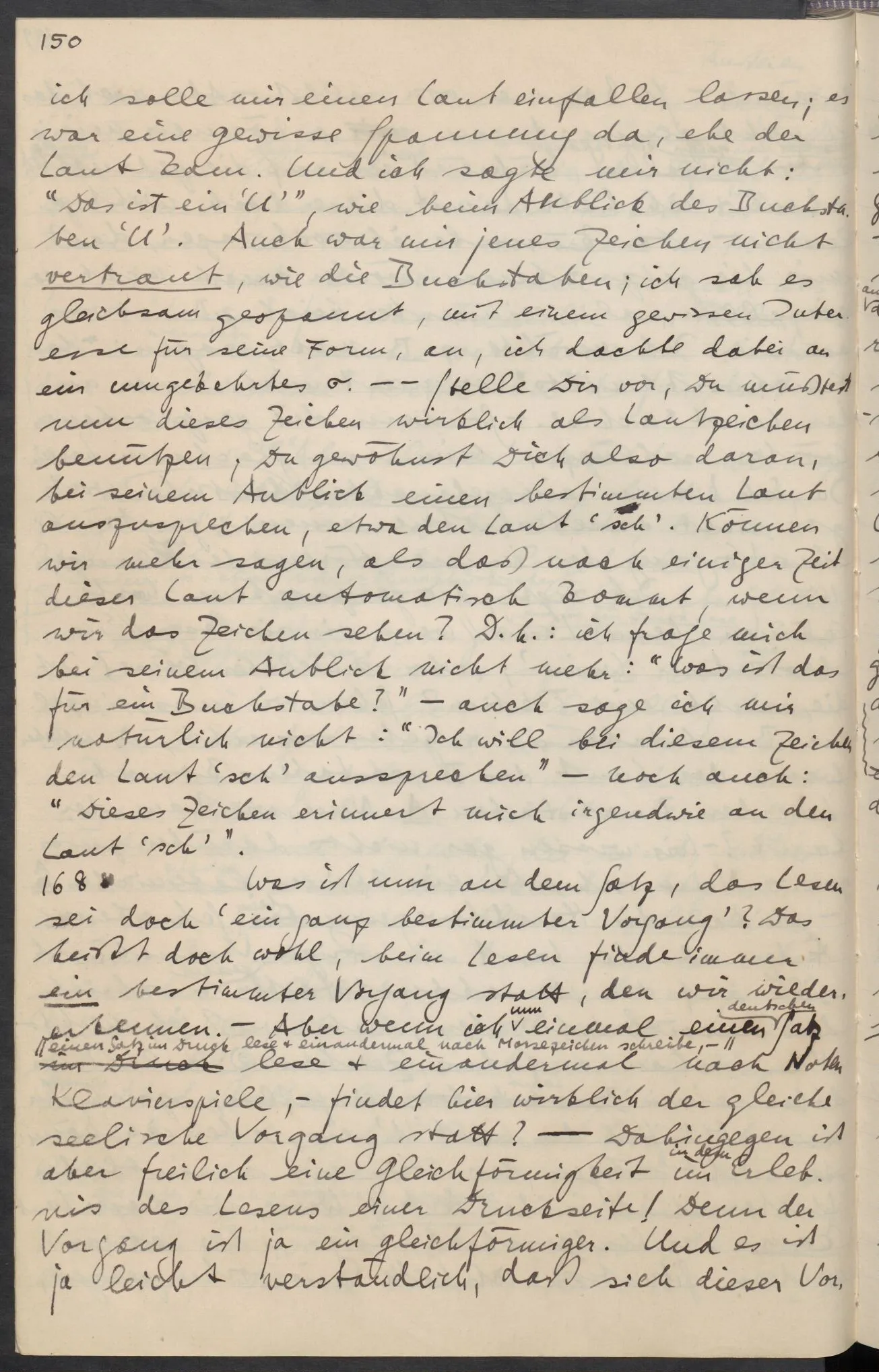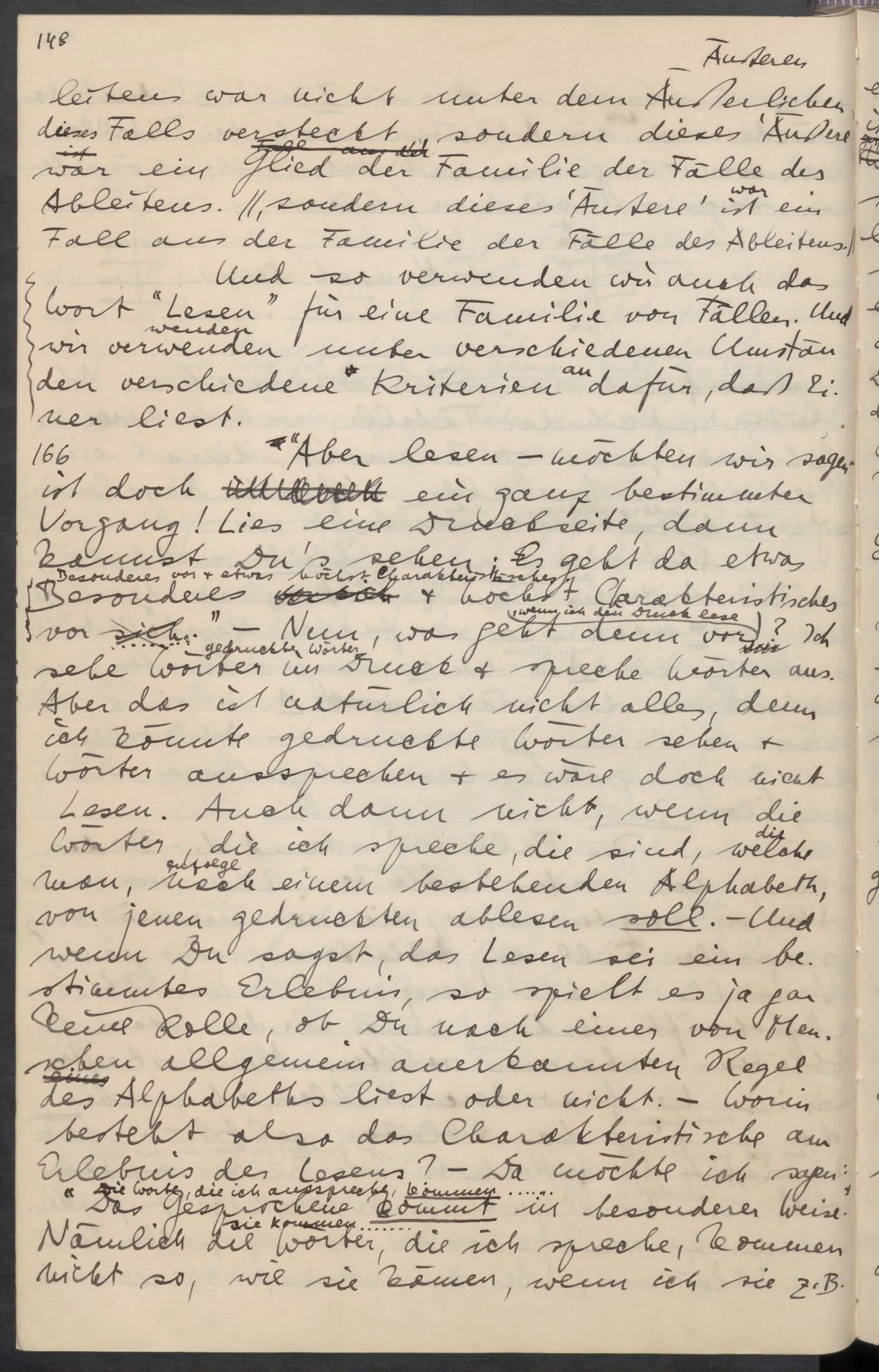 166 “Aber lesen – möchten wir sagen – ist doch ein ganz bestimmter Vorgang! Lies eine Druckseite, dann kannst Du’s sehen, es geht da etwas Besonderes & höchst Charakteristisches vor sich.” Nun, was geht denn vor, wenn ich den Druck lese? Ich sehe Wörter im Druck & spreche Wörter aus. Aber das ist natürlich nicht alles, denn ich könnte gedruckte Wörter sehen & Wörter aussprechen & es wäre doch nicht Lesen. Auch dann nicht, wenn die Wörter, die ich spreche, die sind, welche man, nach einem bestehenden Alphabet, von jenen gedruckten ablesen soll. – Und wenn Du sagst, das Lesen sei ein bestimmtes Erlebnis, so spielt es ja gar keine Rolle, ob Du nach einer von Menschen allgemein anerkannten Regel des Alphabets liest oder nicht. – Worin besteht also das Charakteristische am Erlebnis des Lesens? – Da möchte ich sagen: “Das Gesprochene kommt in besonderer Weise.” Nämlich die Wörter, die ich spreche, kommen nicht so, wie sie kämen, wenn ich sie z.B. ersänne. – Sie kommen von selbst. – Aber auch das ist nicht genug; denn es können mir ja Lautzeichen einfallen, während ich auf die gedruckten Worte schaue, & ich habe damit diese doch nicht gelesen. – Da könnte ich noch sagen, daß mir die gesprochenen Wörter auch nicht so einfallen, als erinnerte mich, z.B., etwas an sie. Ich möchte z.B. nicht sagen: das Druckwort “nichts” erinnert mich immer an den Laut “nichts”. – Sondern die gesprochenen Wörter schlüpfen beim Lesen gleichsam herein. Ja, ich kann ein deutsches gedrucktes Wort gar nicht ansehen, ohne einen eigentümlichen Vorgang des innern Hörens des Wortklangs.