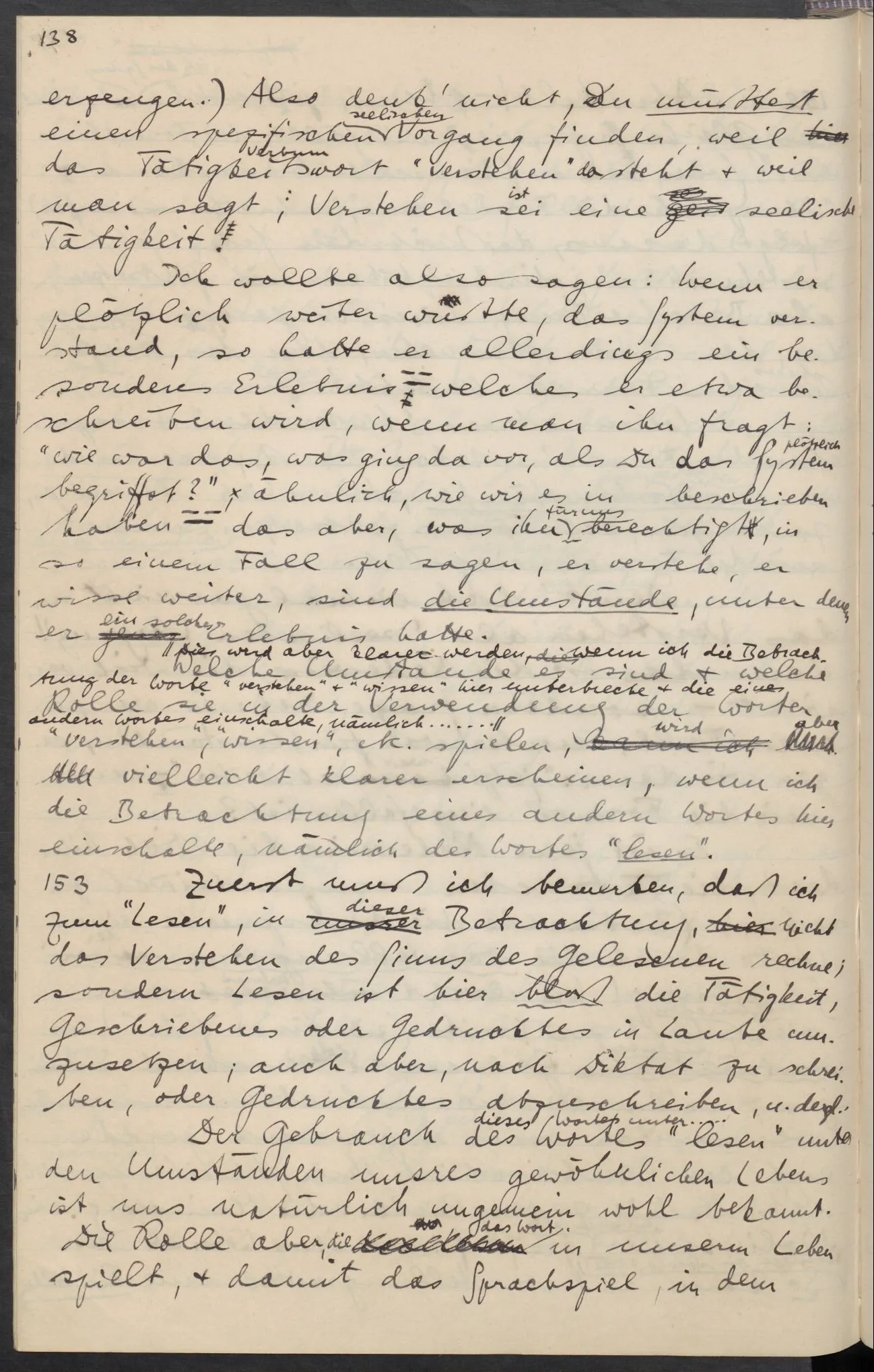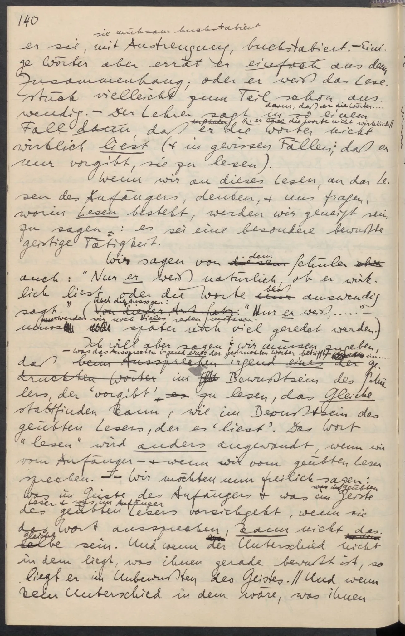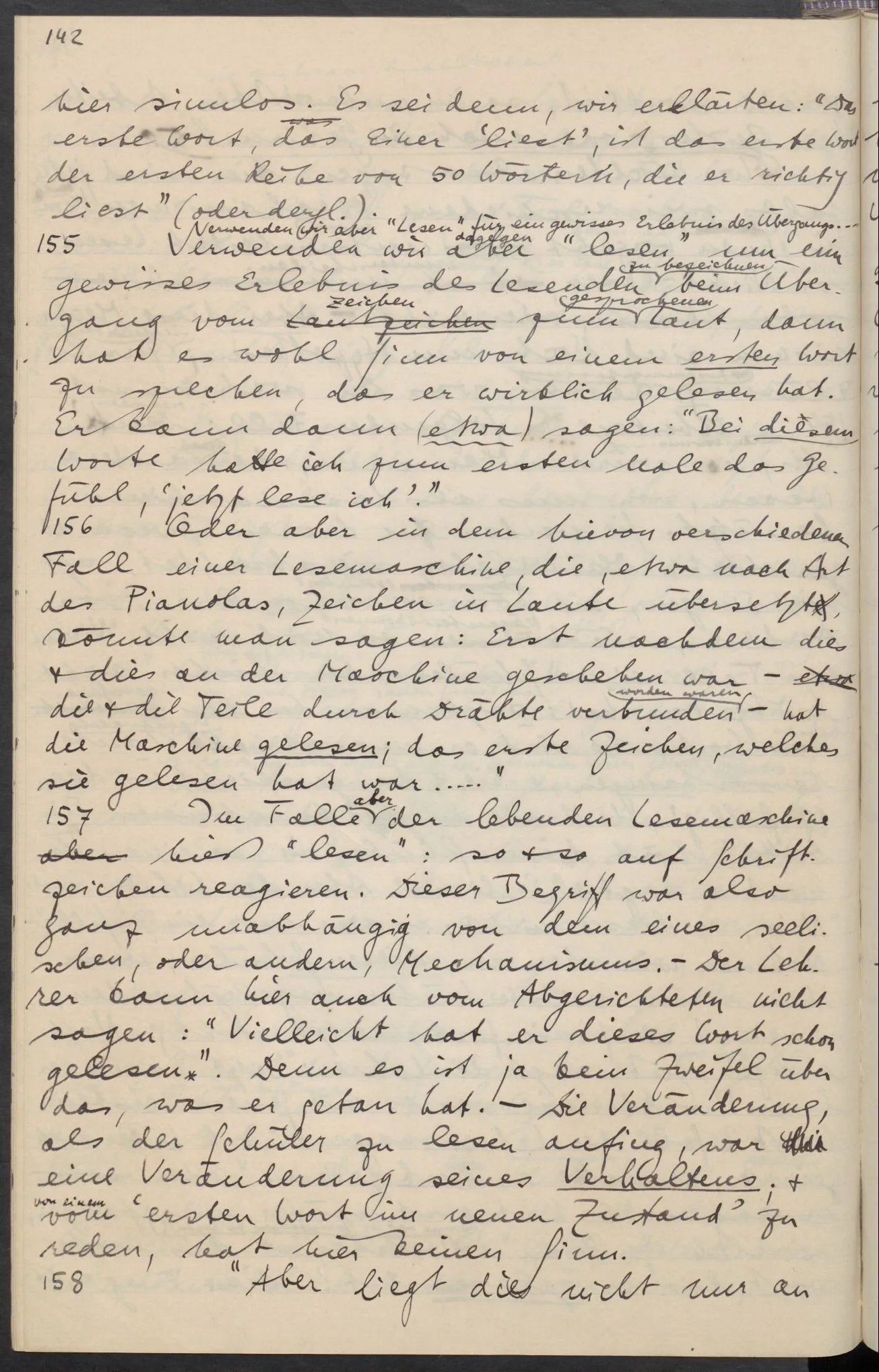 166 “Aber lesen – möchten wir sagen – ist doch ein ganz bestimmter Vorgang! Lies eine Druckseite, dann kannst Du’s sehen, es geht da etwas Besonderes & höchst Charakteristisches vor sich.” Nun, was geht denn vor, wenn ich den Druck lese? Ich sehe Wörter im Druck & spreche Wörter aus. Aber das ist natürlich nicht alles, denn ich könnte gedruckte Wörter sehen & Wörter aussprechen & es wäre doch nicht Lesen. Auch dann nicht, wenn die Wörter, die ich spreche, die sind, welche man, nach einem bestehenden Alphabet, von jenen gedruckten ablesen soll. – Und wenn Du sagst, das Lesen sei ein bestimmtes Erlebnis, so spielt es ja gar keine Rolle, ob Du nach einer von Menschen allgemein anerkannten Regel des Alphabets liest oder nicht. – Worin besteht also das Charakteristische am Erlebnis des Lesens? – Da möchte ich sagen: “Das Gesprochene kommt in besonderer Weise.” Nämlich die Wörter, die ich spreche, kommen nicht so, wie sie kämen, wenn ich sie z.B. ersänne. – Sie kommen von selbst. – Aber auch das ist nicht genug; denn es können mir ja Lautzeichen einfallen, während ich auf die gedruckten Worte schaue, & ich habe damit diese doch nicht gelesen. – Da könnte ich noch sagen, daß mir die gesprochenen Wörter auch nicht so einfallen, als erinnerte mich, z.B., etwas an sie. Ich möchte z.B. nicht sagen: das Druckwort “nichts” erinnert mich immer an den Laut “nichts”. – Sondern die gesprochenen Wörter schlüpfen beim Lesen gleichsam herein. Ja, ich kann ein deutsches gedrucktes Wort gar nicht ansehen, ohne einen eigentümlichen Vorgang des innern Hörens des Wortklangs.
