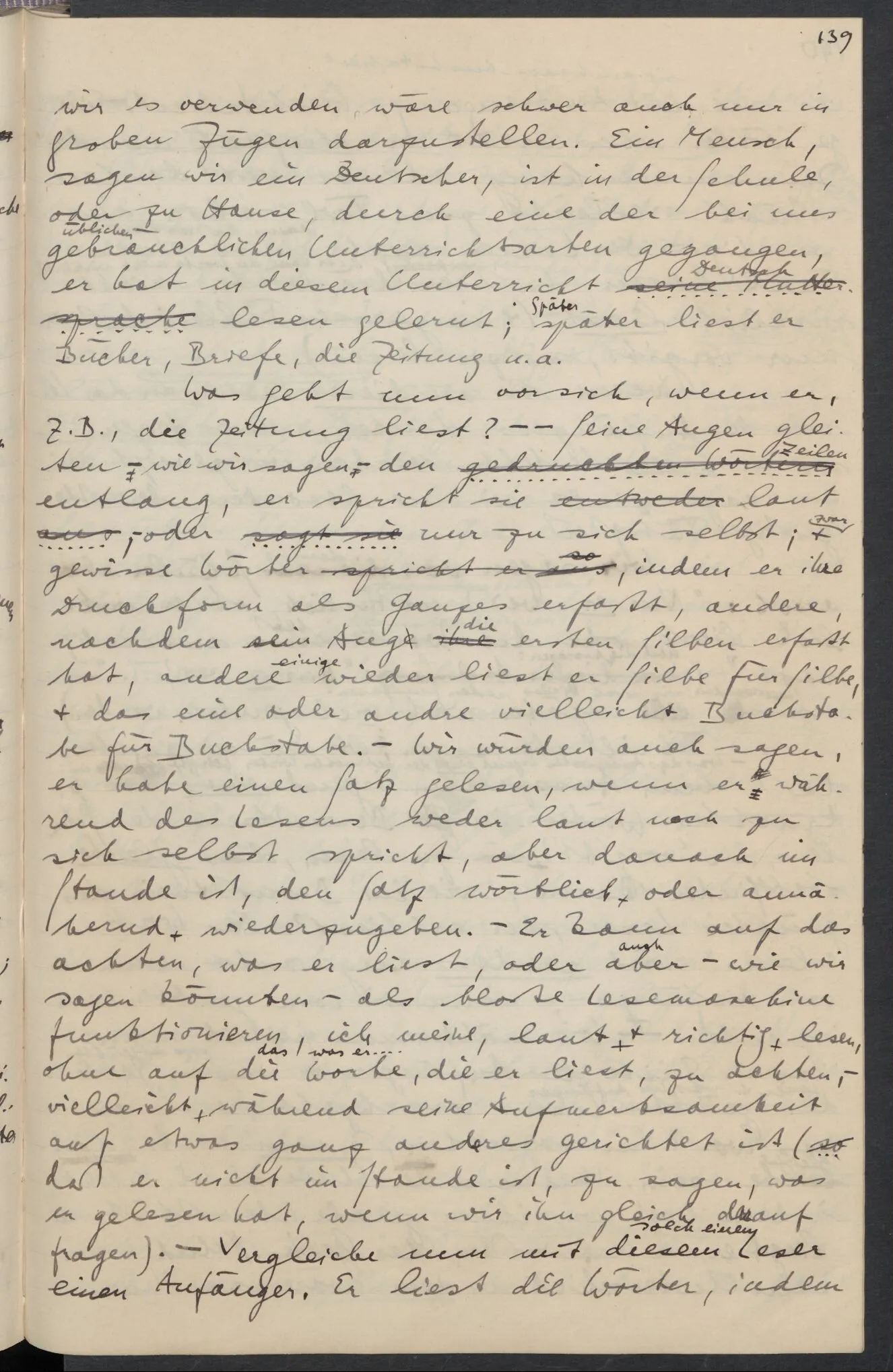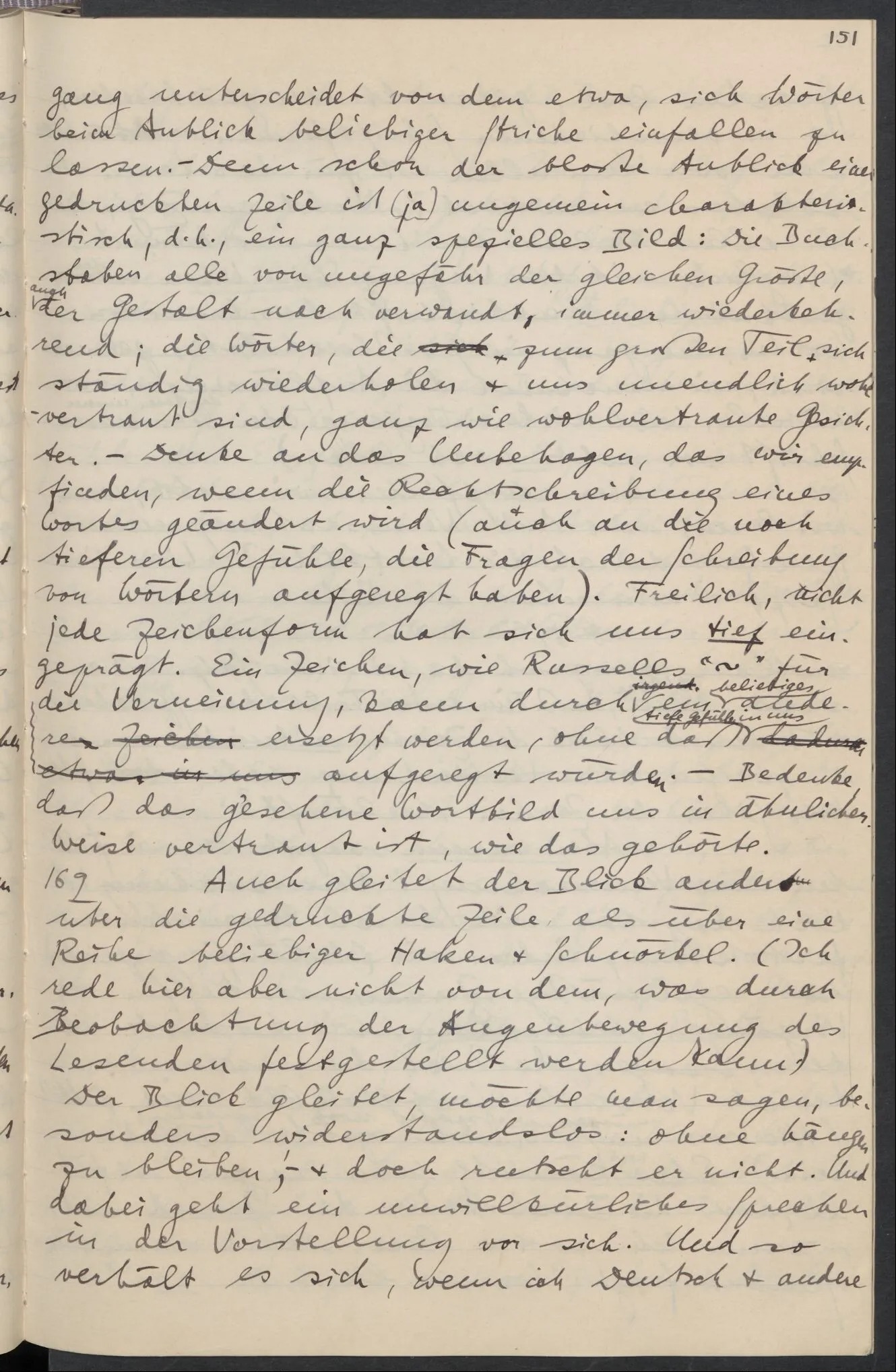 169 Auch gleitet der Blick anders über die gedruckte Zeile, als über eine Reihe beliebiger Haken & Schnörkel. (Ich rede hier aber nicht von dem, was durch Beobachtung der Augenbewegung des Lesenden festgestellt werden kann.) Der Blick gleitet, möchte man sagen, besonders widerstandslos: ohne hängen zu bleiben, – & doch rutscht er nicht. Und dabei geht ein unwillkürliches Sprechen in der Vorstellung vor sich. Und so verhält es sich, wenn ich Deutsch & andere Sprachen lese, gedruckt oder geschrieben, & in verschiedenen Schriftformen. – Was aber von dem allen ist für das Lesen als solches wesentlich? Nicht ein Zug, der in allen Fällen des Lesens vorkäme!