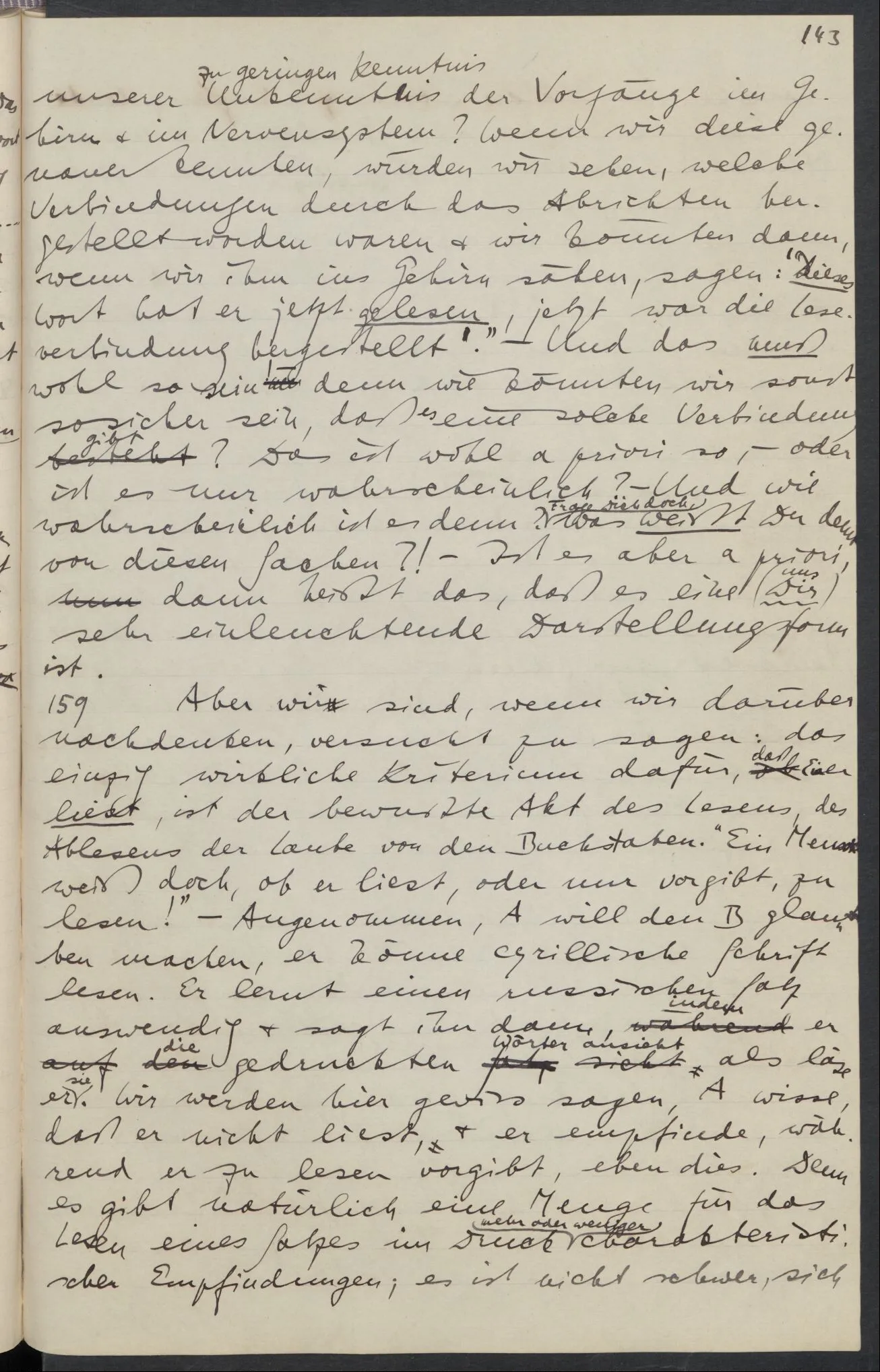 159 Aber wir sind, wenn wir darüber nachdenken, versucht zu sagen: das einzig wirkliche Kriterium dafür, daß Einer liest, ist der bewußte Akt des Lesens, des Ablesens der Laute von den Buchstaben. “Ein Mensch weiß doch, ob er liest, oder nur vorgibt, zu lesen!” – Angenommen, A will den B glauben machen, er könne kyrillische Schrift lesen. Er lernt einen russischen Satz auswendig & sagt ihn dann, indem er die gedruckten Wörter ansieht als läse er sie. Wir werden hier gewiß sagen, A wisse, daß er nicht liest, & er empfinde, während er zu lesen vorgibt, eben dies. Denn es gibt natürlich eine Menge für das Lesen eines Satzes im Druck mehr oder weniger charakteristischer Empfindungen; es ist nicht schwer, sich solche ins Gedächtnis zu rufen; denke an Empfindungen des Stockens, genaueren Hinsehens, Verlesens, der größeren & geringeren Geläufigkeit der Wortfolgen, u.a.. Und ebenso gibt es charakteristische Empfindungen für das Aufsagen von etwas Auswendiggelerntem. Und A wird in unserm Fall keine von den Empfindungen haben, die für das Lesen charakteristisch sind & er wird etwa eine Reihe von Empfindungen haben, die für das Schwindeln charakteristisch sind.