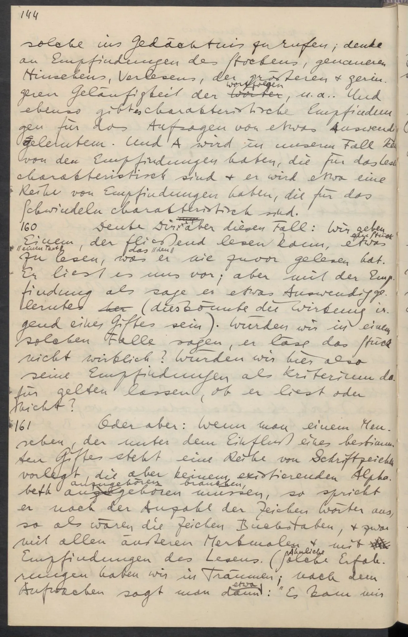 160 Denke Dir aber diesen Fall: Wir geben Einem, der fließend lesen kann, etwas zu lesen, was er nie zuvor gesehen hat. Er liest ihn uns vor; aber mit der Empfindung, als sage er etwas Auswendiggelerntes (dies könnte die Wirkung irgend eines Giftes sein). Würden wir in einem solchen Falle sagen, er läse das Stück nicht wirklich? Würden wir hier also seine Empfindungen als Kriterium dafür gelten lassen, ob er liest oder nicht?