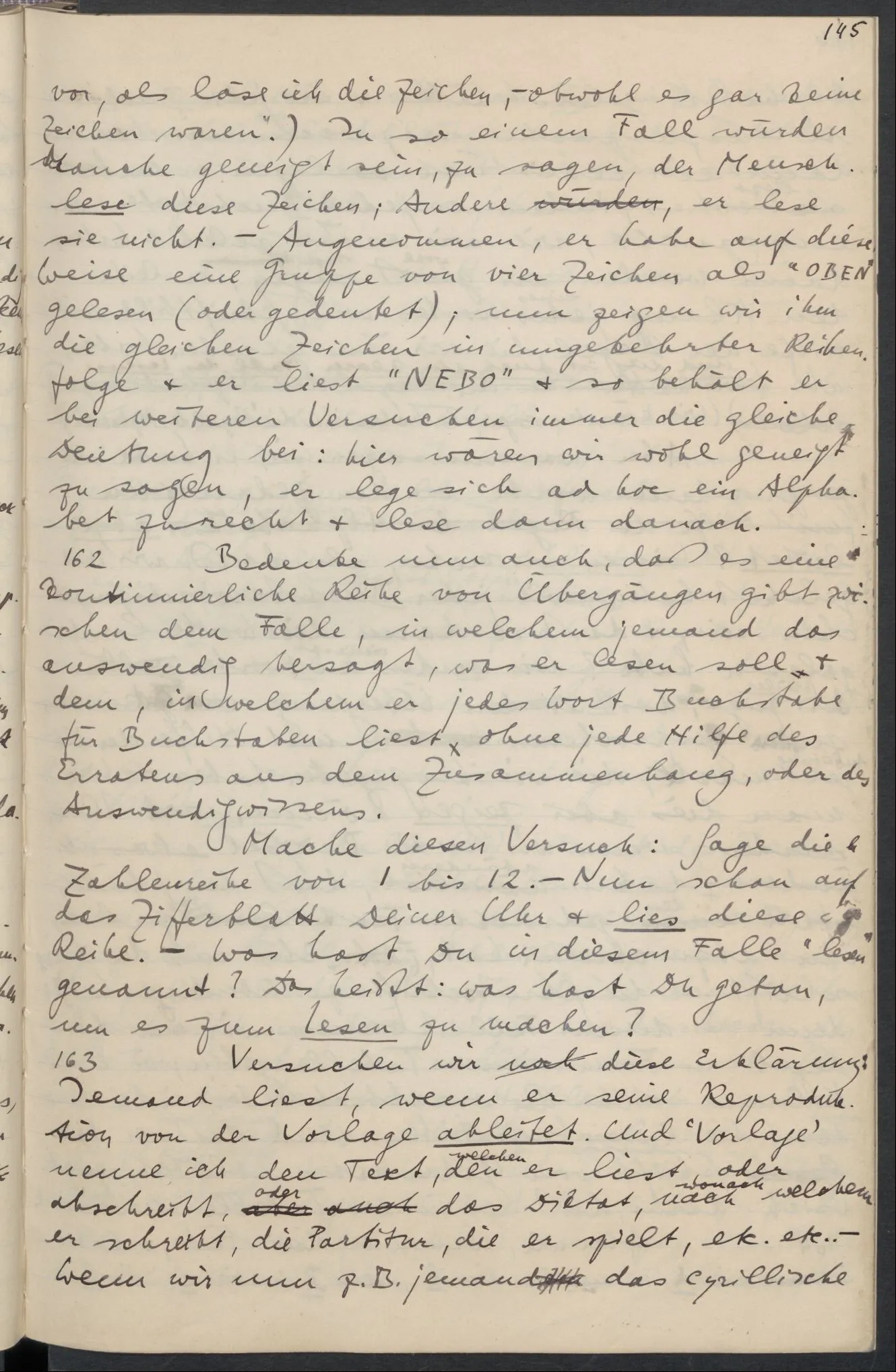 162 Bedenke nun auch, daß es eine kontinuierliche Reihe von Übergängen gibt zwischen dem Falle, in welchem jemand das auswendig hersagt, was er lesen soll & dem, in welchem er jedes Wort Buchstabe für Buchstaben liest ohne jede Hilfe des Erratens aus dem Zusammenhang, oder des Auswendigwissens. Mache diesen Versuch: Sage die Zahlenreihe von 1 bis 12. – Nun schau auf das Zifferblatt Deiner Uhr & lies diese Reihe. – Was hast Du in diesem Falle “lesen” genannt? Das heißt: was hast Du getan, um es zum Lesen zu machen?