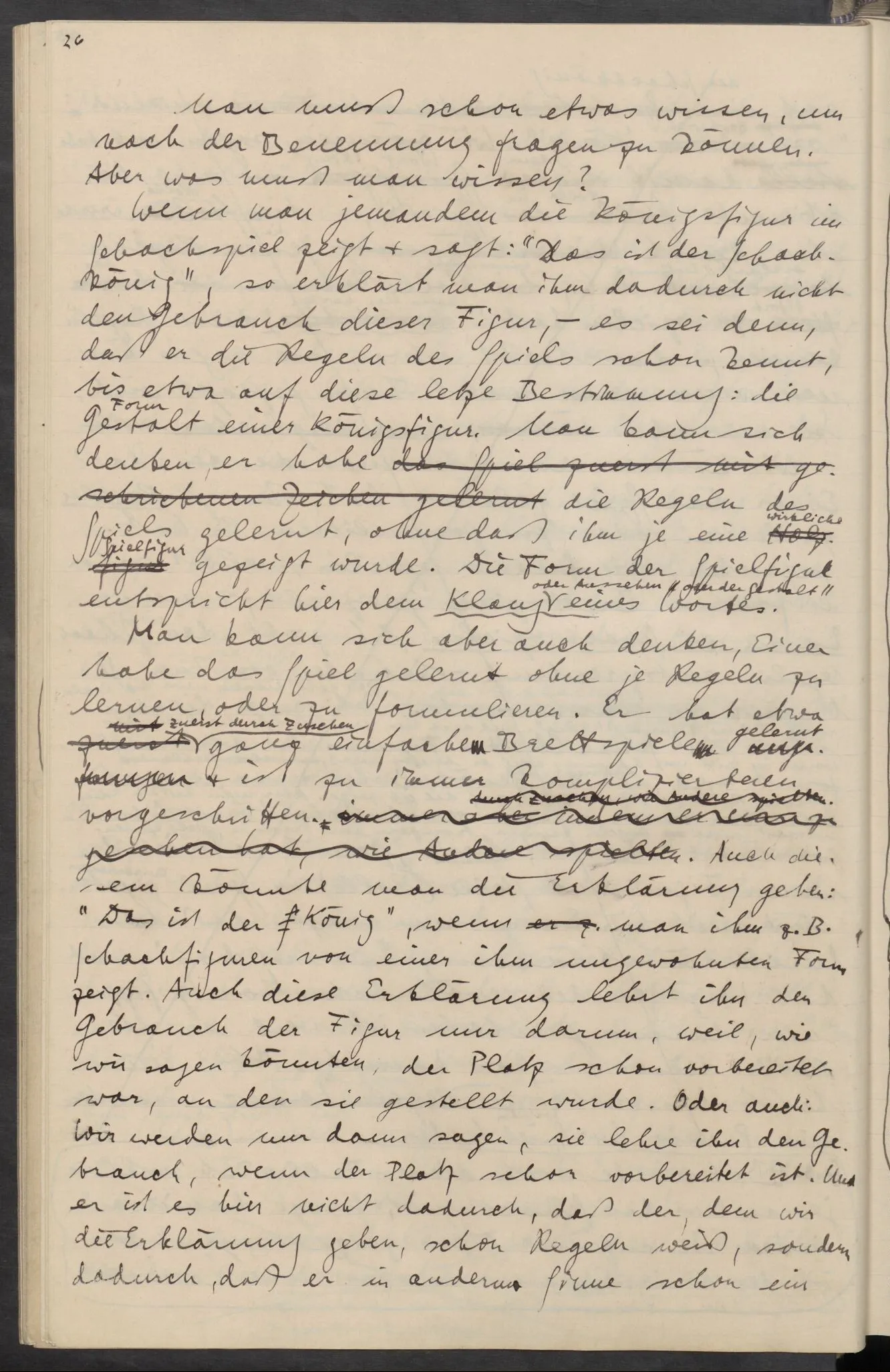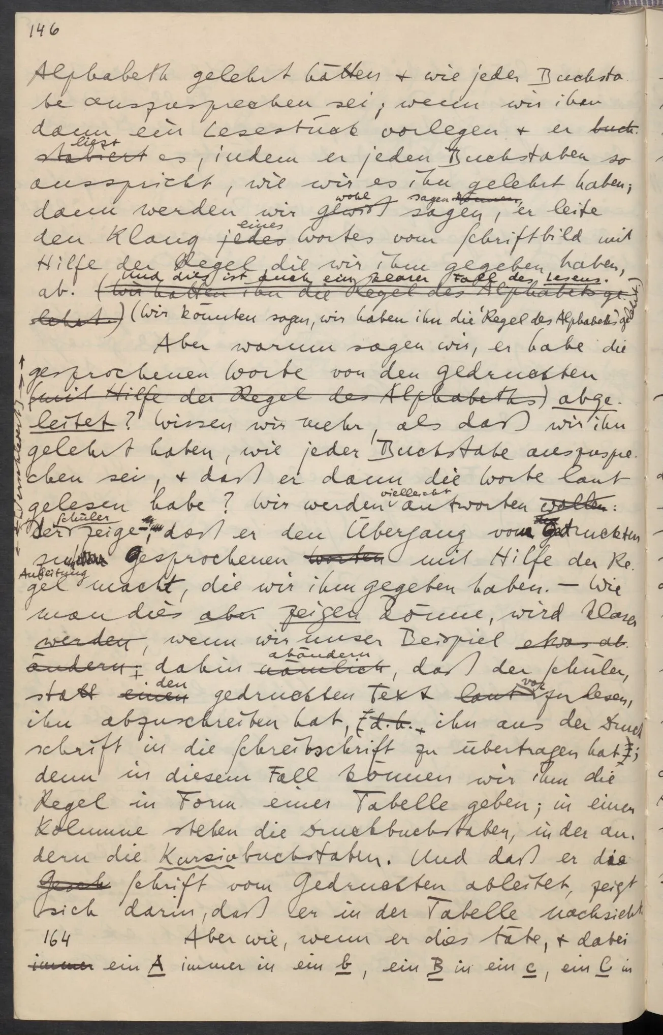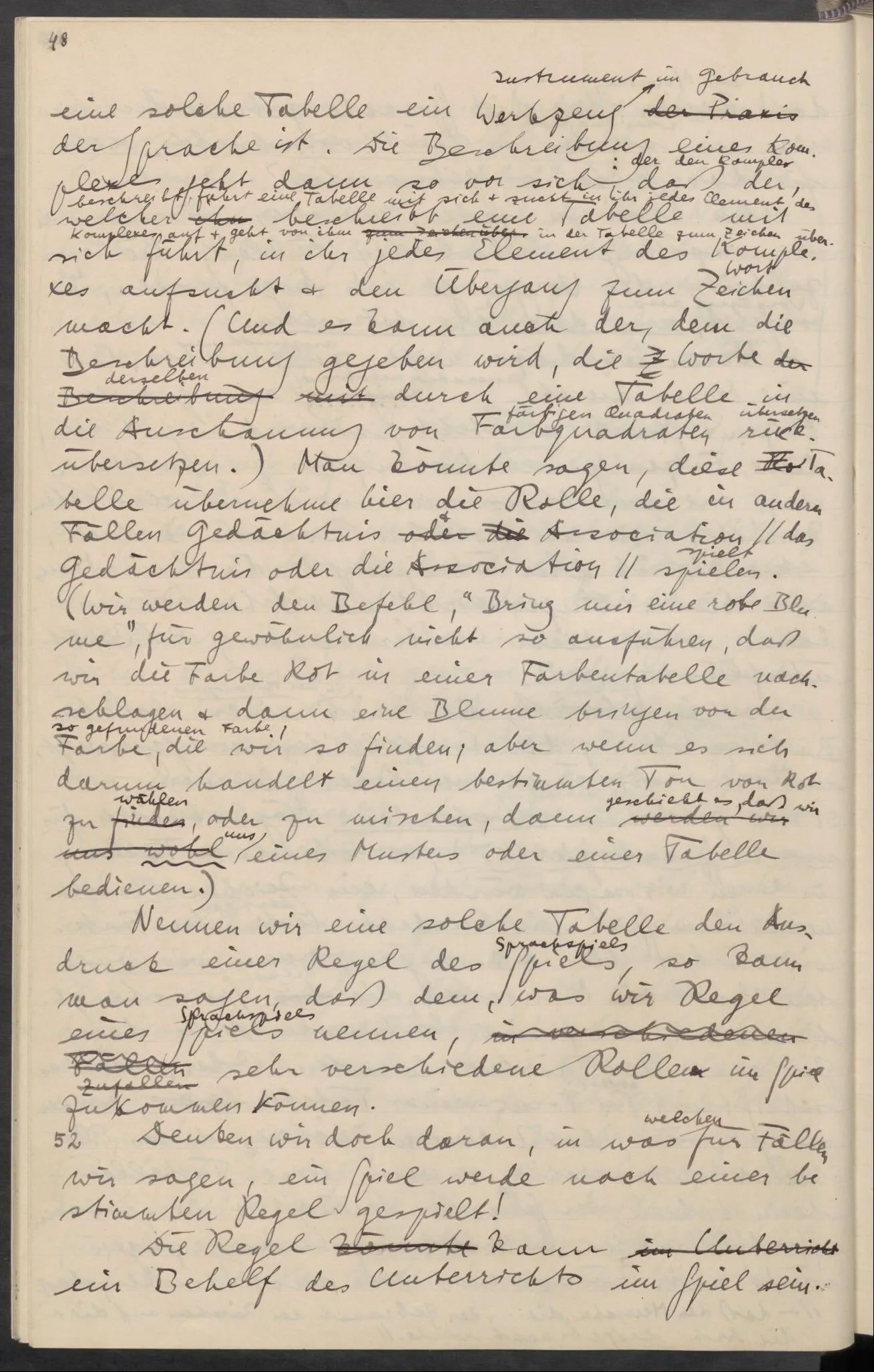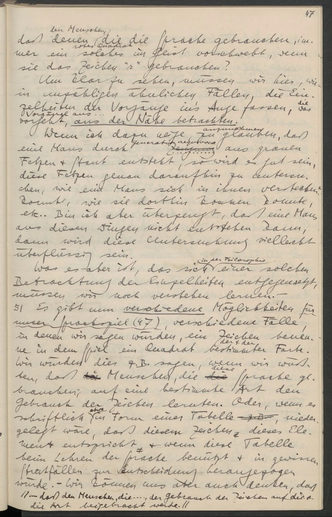 Aber warum sagen wir, er habe die gesprochenen Worte von den gedruckten abgeleitet? Wissen wir mehr, als daß wir ihn gelehrt haben, wie jeder Buchstabe auszusprechen sei, & daß er dann die Worte laut gelesen habe? Wir werden vielleicht antworten: Der Schüler zeige –, daß er den Übergang vom Gedruckten zum Gesprochenen mit Hilfe der Regel macht, die wir ihm gegeben haben. – Wie man dies zeigen könne, wird klarer, wenn wir unser Beispiel dahin abändern daß der Schüler, statt den gedruckten Text vorzulesen, ihn abzuschreiben hat, ihn aus der Druckschrift in die Schreibschrift zu übertragen hat; denn in diesem Fall können wir ihm die Regel in Form einer Tabelle geben; in einer Kolumne stehen die Druckbuchstaben, in der andern die Kursivbuchstaben. Und daß er die Schrift vom Gedruckten ableitet, zeigt sich darin, daß er in der Tabelle nachsieht.