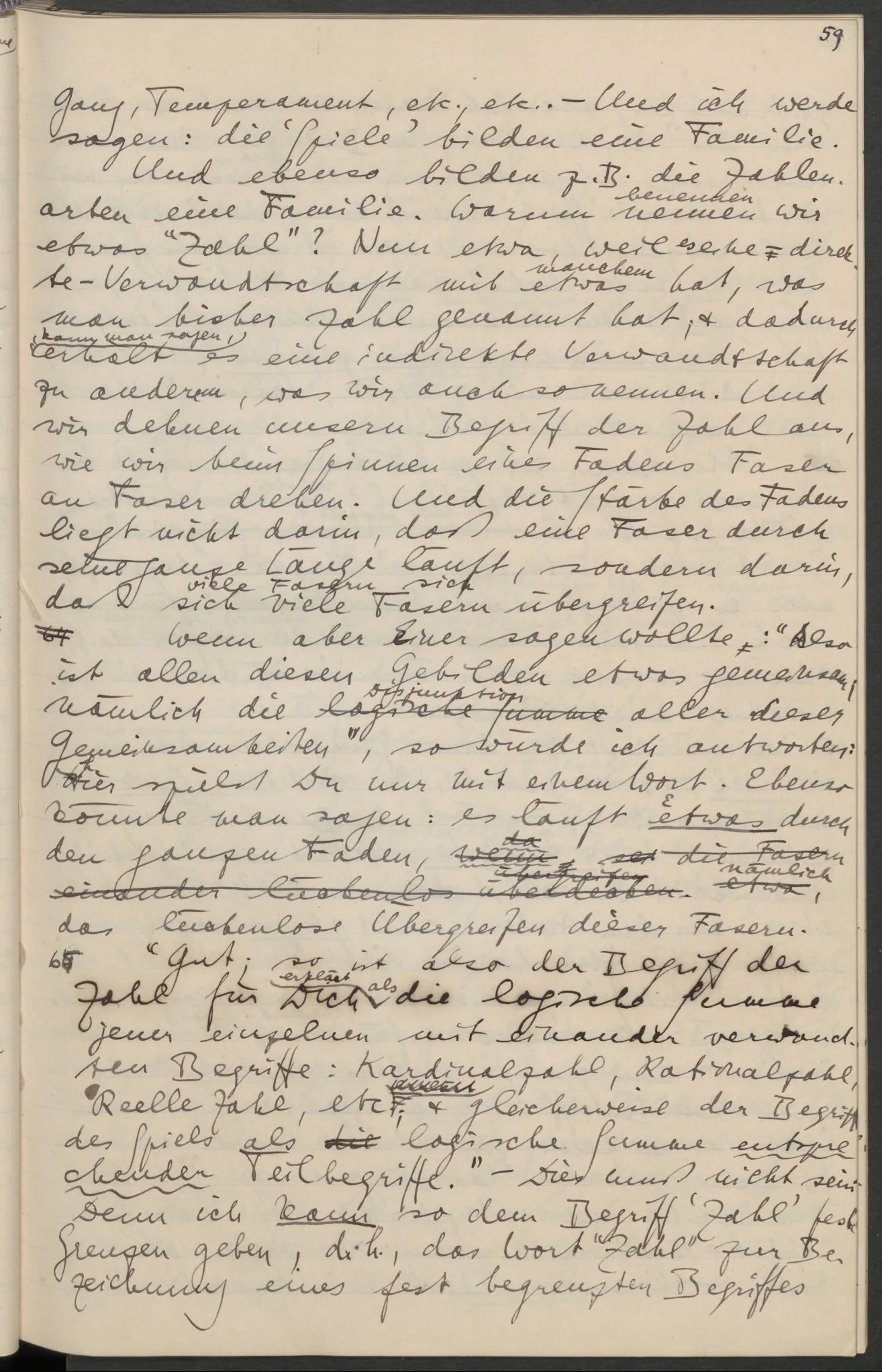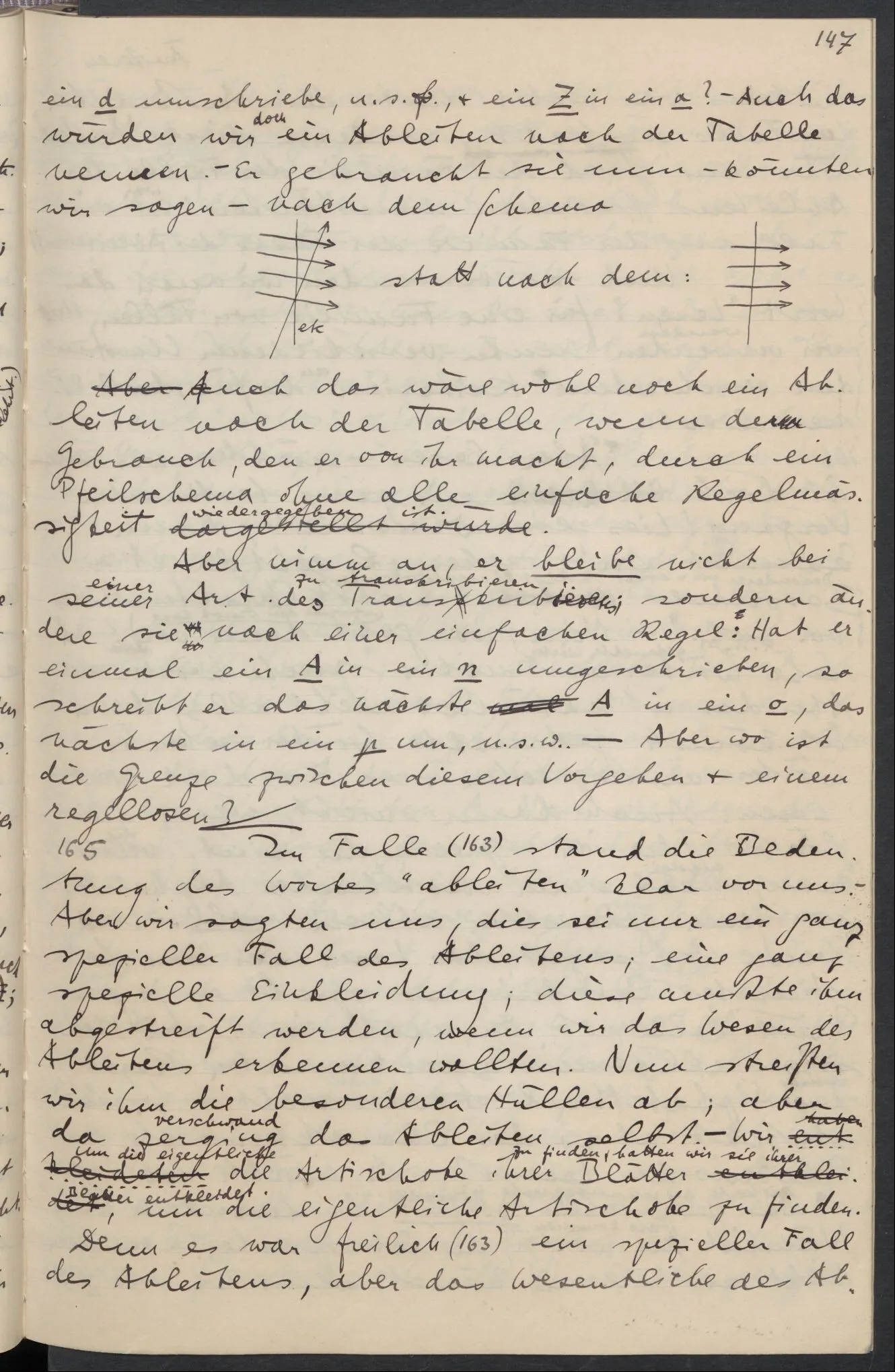 165 Im Falle (163) stand die Bedeutung des Wortes “ableiten” klar vor uns. – Aber wir sagten uns, dies sei nur ein ganz spezieller Fall des Ableitens; eine ganz spezielle Einkleidung; diese mußte ihm abgestreift werden, wenn wir das Wesen des Ableitens erkennen wollten. Nun streiften wir ihm die besonderen Hüllen ab; aber da zerging das Ableiten selbst. – Wir entkleideten die Artischocke ihrer Blätter, um die eigentliche Artischocke zu finden. Denn es war freilich (163) ein spezieller Fall des Ableitens, aber das Wesentliche des Ableitens war nicht unter dem Äußerlichen dieses Falls versteckt, sondern dieses ‘Äußere’ war ein Glied der Familie der Fälle des Ableitens.