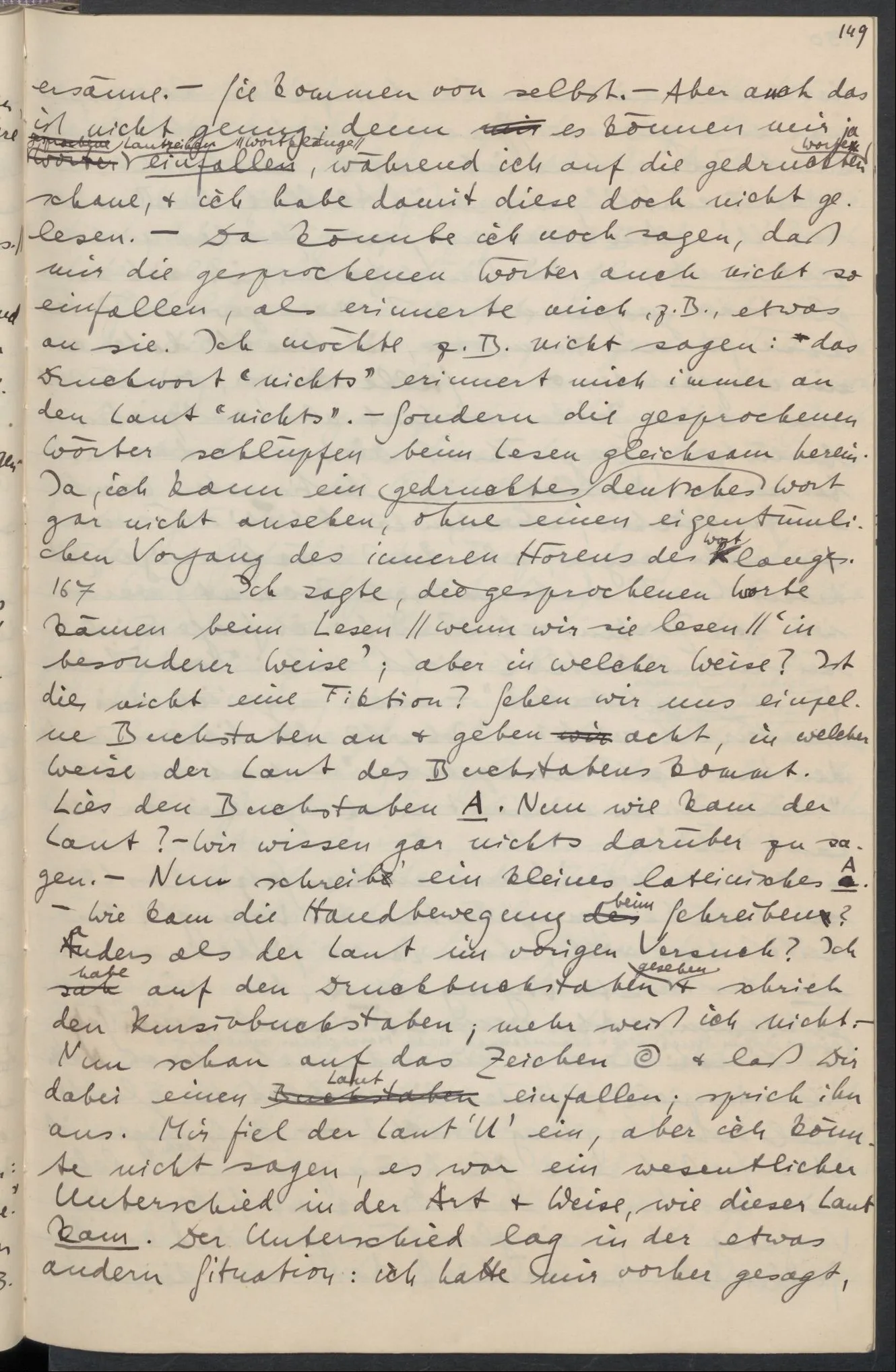 167 Ich sagte, die gesprochenen Worte kämen beim Lesen ‘in besonderer Weise’; aber in welcher Weise? Ist dies nicht eine Fiktion? Sehen wir uns einzelne Buchstaben an & geben acht, in welcher Weise der Laut des Buchstabens kommt. Lies den Buchstaben A. Nun, wie kam der Laut? – Wir wissen gar nichts darüber zu sagen. – Nun schreib’ ein kleines lateinisches A. – Wie kam die Handbewegung beim Schreiben? anders als der Laut im vorigen Versuch? Ich habe auf den Druckbuchstaben gesehen & schrieb den Kursivbuchstaben; mehr weiß ich nicht. – Nun schau auf das Zeichen