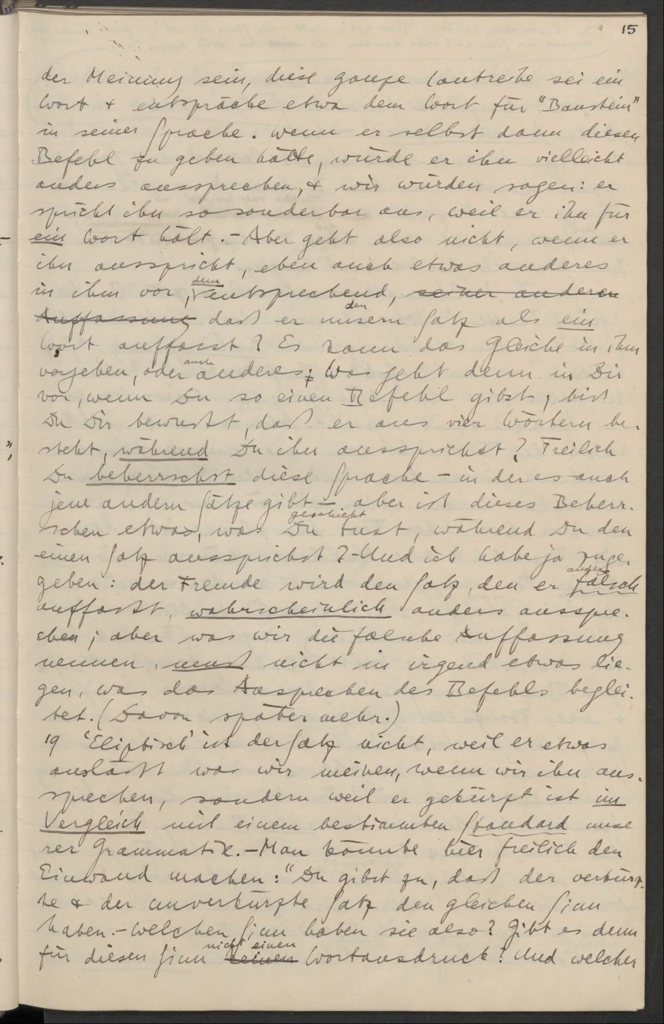18 “Aber wenn nun Einer sagt “Bring mir eine Platte!”, so scheint es ja jetzt, als könnte er diesen Ausdruck als ein langes Wort meinen, – entsprechend nämlich dem einen Wort ‘Platte!’” – Kann man also jenen Satz einmal als ein Wort, einmal als vier Wörter meinen? Und wie meint man ihn gewöhnlich? – Ich glaube, wir werden geneigt sein, zu sagen: wir meinen den Satz als einen von vier Wörtern, wenn wir ihn im Gegensatz zu andern Sätzen gebrauchen, wie: “Reich mir eine Platte zu”, “Bring ihm eine Platte”, “Bring zwei Platten”, etc.; also im Gegensatz zu Sätzen, welche die Wörter unseres Befehls in andern Verbindungen gebrauchen. – Aber worin besteht es, einen Satz im Gegensatz zu andern Sätzen gebrauchen? Schweben einem dabei etwa diese Sätze vor? Und alle? Und während man den einen Satz sagt, oder vor-, oder nachher? – Nein! Wenn auch so eine Erklärung einige Versuchung für uns hat, so brauchen wir doch nur einen Augenblick zu bedenken, was wirklich geschieht, um zu sehen, daß wir hier auf falschem Weg sind. Wir sagen, wir gebrauchen den Befehl im Gegensatz zu andern Sätzen, weil unsere Sprache die Möglichkeit zu diesen andern Sätzen enthält. Wer unsere Sprache nicht versteht, ein Ausländer, der öfter gehört hätte, wie jemand den Befehl gibt “Bring mir eine Platte!”, könnte der Meinung sein, diese ganze Lautreihe sei ein Wort & entspräche etwa dem Wort für “Baustein” in seiner Sprache. Wenn er selbst dann diesen Befehl zu geben hätte, würde er ihn vielleicht anders aussprechen, & wir würden sagen: er spricht ihn so sonderbar aus, weil er ihn für ein Wort hält. – Aber geht also nicht, wenn er ihn ausspricht, eben auch etwas anderes in ihm vor, dem entsprechend daß er unsern Satz als ein Wort auffaßt? Es kann das Gleiche in ihm vorgehen, oder auch anderes. Was geht denn in Dir vor, wenn Du so einen Befehl gibst; bist Du Dir bewußt, daß er aus vier Wörtern besteht, während Du ihn aussprichst? Freilich, Du beherrschst diese Sprache – in der es auch jene andern Sätze gibt – aber ist dieses Beherrschen etwas, was Du tust, während Du den einen Satz aussprichst? – Und ich habe ja zugegeben: der Fremde wird den Satz, den er falsch auffaßt, wahrscheinlich anders aussprechen; aber was wir die falsche Auffassung nennen muß nicht in irgend etwas liegen, was das Aussprechen des Befehls begleitet. (Davon später mehr.)