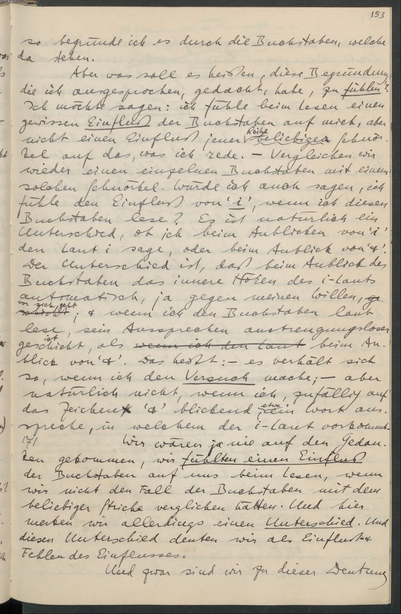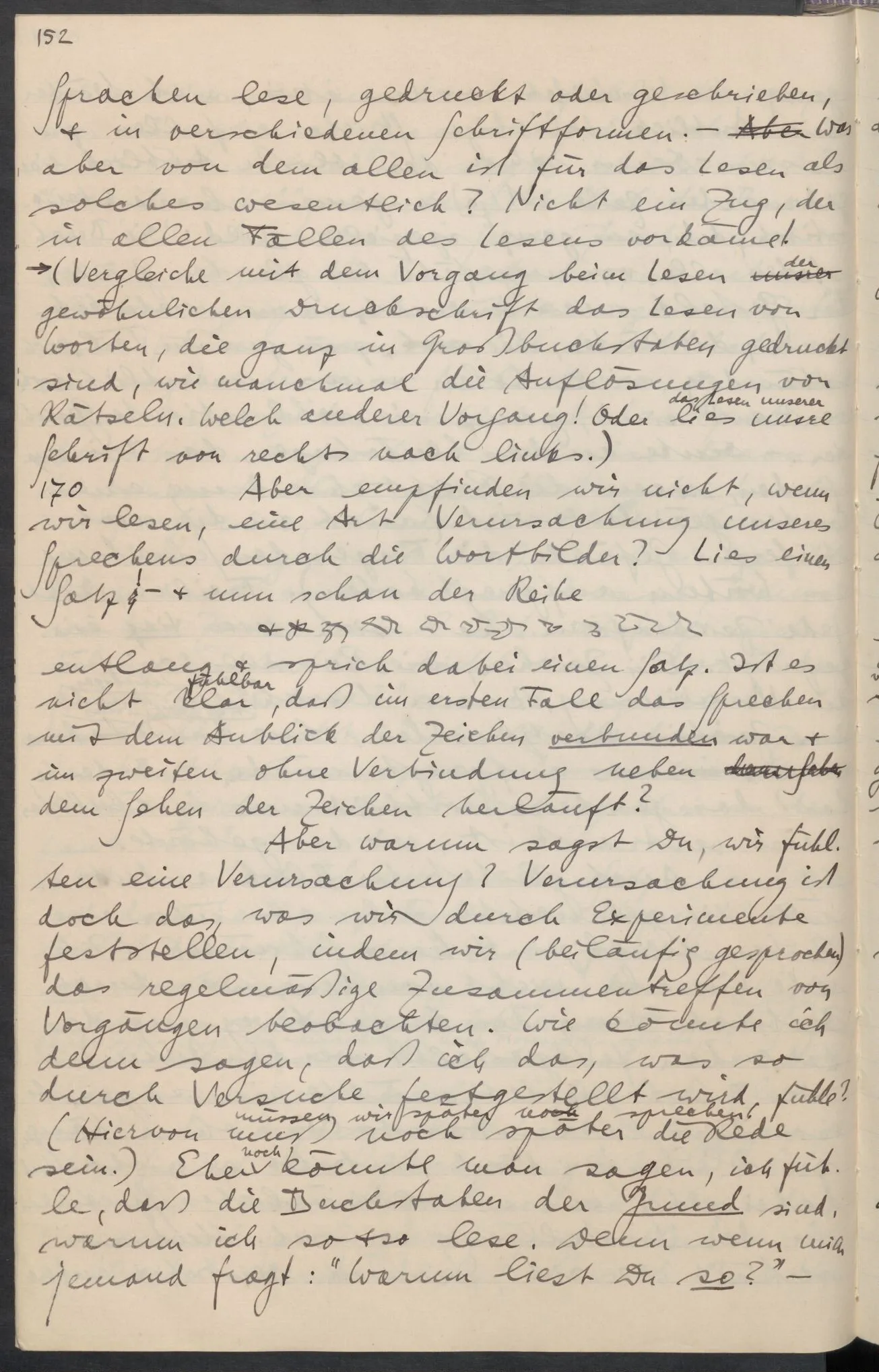 entlang & sprich dabei einen Satz. Ist es nicht klar, daß im ersten Fall das Sprechen mit dem Anblick der Zeichen verbunden war & im zweiten ohne Verbindung neben dem Sehen der Zeichen herläuft? Aber warum sagst Du, wir fühlten eine Verursachung? Verursachung ist doch das, was wir durch Experimente feststellen, indem wir (beiläufig gesprochen) das regelmäßige Zusammentreffen von Vorgängen beobachten. Wie könnte ich denn sagen, daß ich das, was so durch Versuche festgestellt wird, fühle? (Hiervon muß noch später die Rede sein.) Eher noch könnte man sagen, ich fühle, daß die Buchstaben der Grund sind, warum ich so & so lese. Denn, wenn mich jemand fragt: “Warum liest Du so? – so begründe ich es durch die Buchstaben, welche da stehen. Aber was soll es heißen, diese Begründung, die ich ausgesprochen, gedacht, habe, zu fühlen? Ich möchte sagen: ich fühle beim Lesen einen gewissen Einfluß der Buchstaben auf mich, aber nicht einen Einfluß jener Reihe beliebiger Schnörkel auf das, was ich rede. – Vergleichen wir wieder einen einzelnen Buchstaben mit einem solchen Schnörkel. Würde ich auch sagen, ich fühle den Einfluß von ‘i’, wenn ich diesen Buchstaben lese? Es ist natürlich ein Unterschied, ob ich beim Anblicken von ‘i’ den Laut i sage, oder beim Anblick von ‘ + ’. Der Unterschied ist, daß beim Anblick des Buchstaben das innere Hören des i-Lauts automatisch, ja gegen meinen Willen, vor sich geht; & wenn ich den Buchstaben laut lese, sein Aussprechen anstrengungsloser geschieht, als beim Anblick von ‘ + ’. Das heißt: – es verhält sich so, wenn ich den Versuch mache; – aber natürlich nicht, wenn ich, zufällig auf das Zeichen ‘ + ’ blickend, etwa ein Wort ausspreche, in welchem der i-Laut vorkommt.