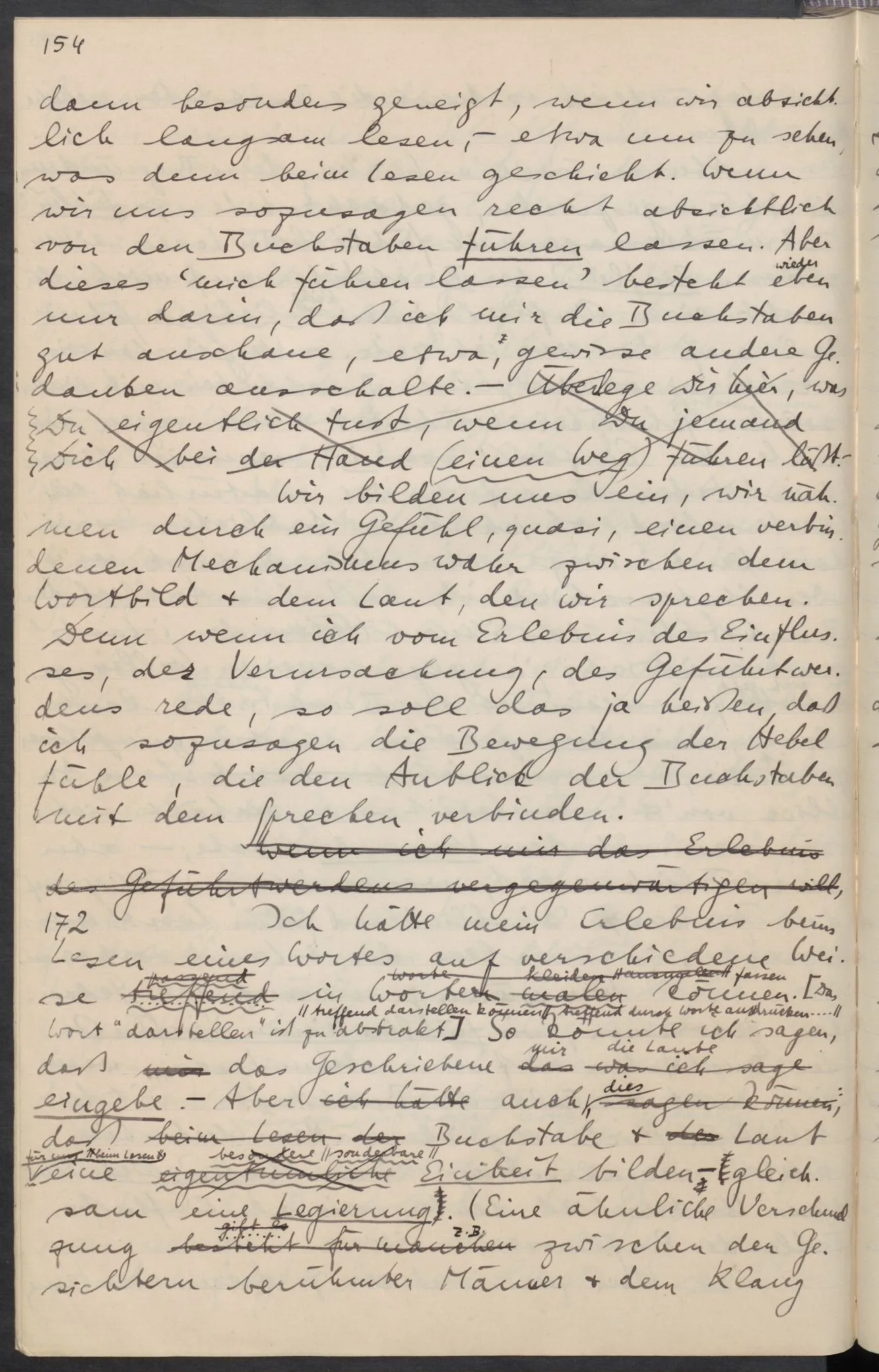 171 Wir wären ja nie auf den Gedanken gekommen, wir fühlten einen Einfluß der Buchstaben auf uns beim Lesen, wenn wir nicht den Fall der Buchstaben mit dem beliebiger Striche verglichen hätten. Und hier merken wir allerdings einen Unterschied. Und diesen Unterschied deuten wir als Einfluß – & Fehlen des Einflusses. Und zwar sind wir zu dieser Deutung dann besonders geneigt, wenn wir absichtlich langsam lesen, – etwa um zu sehen, was denn beim Lesen geschieht. Wenn wir uns sozusagen recht absichtlich von den Buchstaben führen lassen. Aber dieses ‘mich führen lassen’ besteht eben nur darin, daß ich mir die Buchstaben gut anschaue, etwa, gewisse andere Gedanken ausschalte. – Wir bilden uns ein, wir nähmen durch ein Gefühl, quasi, einen verbindenden Mechanismus wahr zwischen dem Wortbild & dem Laut, den wir sprechen. Denn wenn ich vom Erlebnis des Einflusses, der Verursachung, des Geführtwerdens rede, so soll das ja heißen, daß ich sozusagen die Bewegung der Hebel fühle, die den Anblick der Buchstaben mit dem Sprechen verbinden.