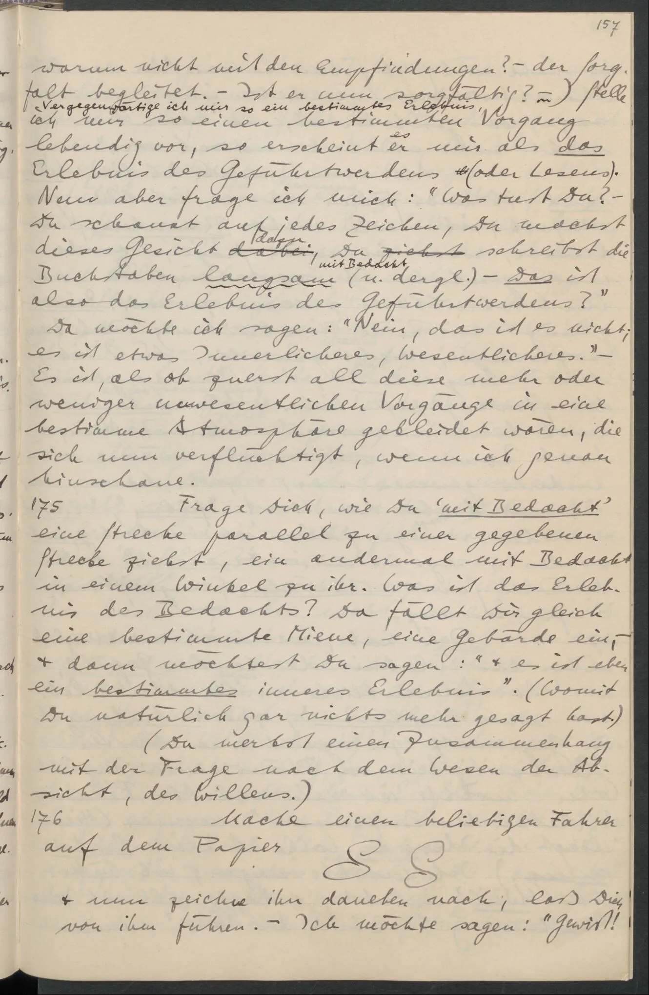 175 Frage Dich, wie Du ‘mit Bedacht’ eine Strecke parallel zu einer gegebenen Strecke ziehst, ein andermal mit Bedacht in einem Winkel zu ihr. Was ist das Erlebnis des Bedachts? Da fällt Dir gleich eine bestimmte Miene, eine Gebärde ein, – & dann möchtest Du sagen: “& es ist eben ein bestimmtes inneres Erlebnis”. (Womit Du natürlich gar nichts mehr gesagt hast.) (Du merkst einen Zusammenhang mit der Frage nach dem Wesen der Absicht, des Willens.)