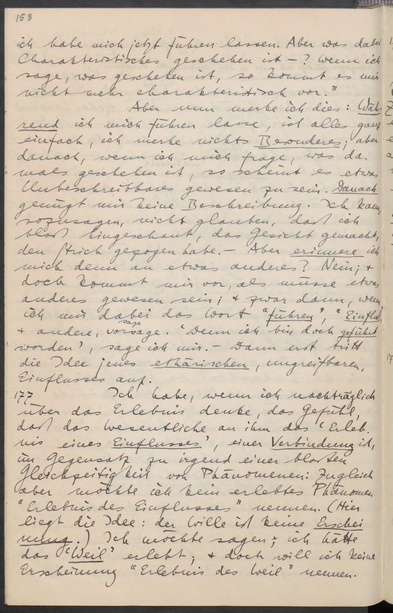 177 Ich habe, wenn ich nachträglich über das Erlebnis denke, das Gefühl, daß das Wesentliche an ihm das ‘Erlebnis eines Einflusses’, einer Verbindung ist, im Gegensatz zu irgend einer bloßen Gleichzeitigkeit von Phänomenen: Zugleich aber möchte ich kein erlebtes Phänomen “Erlebnis des Einflusses” nennen. (Hier liegt die Idee: der Wille ist keine Erscheinung.) Ich möchte sagen, ich hätte das ‘Weil’ erlebt; & doch will ich keine Erscheinung “Erlebnis des Weil” nennen.