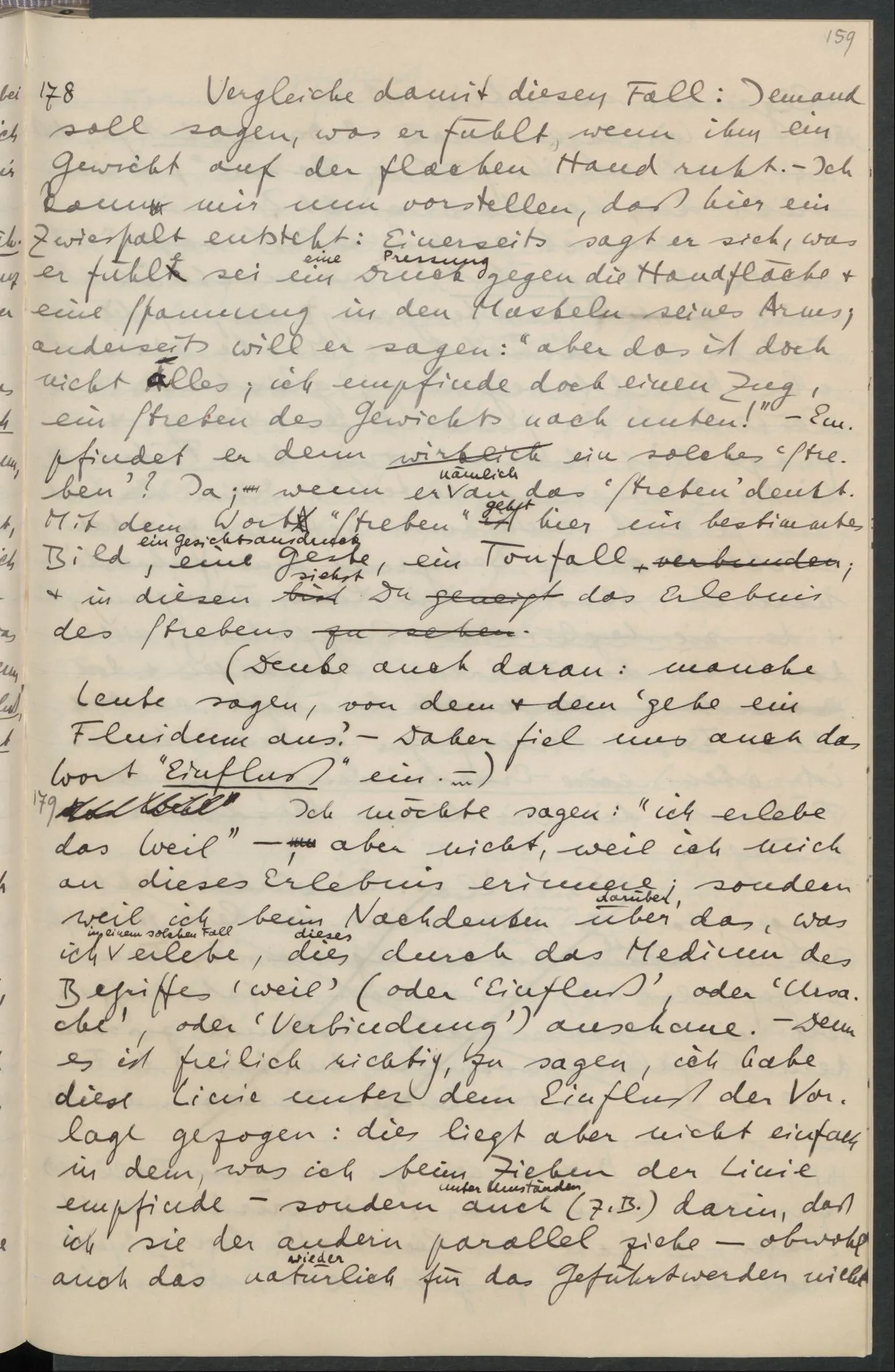 178 Vergleiche damit diesen Fall: Jemand soll sagen, was er fühlt, wenn ihm ein Gewicht auf der flachen Hand ruht. – Ich kann mir nun vorstellen, daß hier ein Zwiespalt entsteht: Einerseits sagt er sich, was er fühle sei ein Druck gegen die Handfläche & eine Spannung in den Muskeln seines Arms; anderseits will er sagen: “aber das ist doch nicht alles; ich empfinde doch einen Zug, ein Streben des Gewichts nach unten!” – Empfindet er denn ein solches ‘Streben’? Ja: wenn er nämlich an das ‘Streben’ denkt. Mit dem Wort “Streben” geht hier ein bestimmtes Bild, eine Geste, ein Tonfall; & in diesem siehst Du das Erlebnis des Strebens. (Denke auch daran: manche Leute sagen, von dem & dem ‘gehe ein Fluidum aus’. – Daher fiel uns auch das Wort “Einfluß” ein. –)