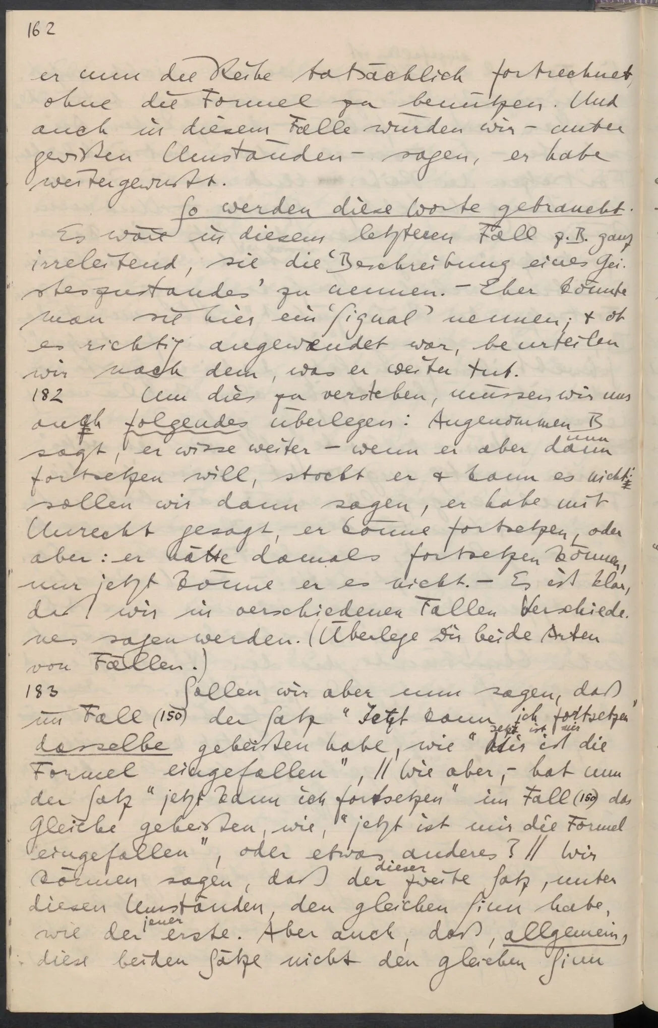181 Kehren wir zu unserm Fall [→ (150)] [→ 132] zurück. Es ist klar: wir würden nicht sagen, B habe ein Recht, die Worte, “jetzt weiß ich weiter”, zu gebrauchen, wenn ihm die Formel einfällt, – wenn nicht erfahrungsmäßig ein Zusammenhang bestünde zwischen dem Einfallen – Aussprechen, Anschreiben – der Formel & dem tatsächlichen Fortsetzen der Reihe. Und so ein Zusammenhang besteht ja offenbar. – Und nun könnte man meinen, der Satz “ich kann fortsetzen” sage eigentlich: “ich habe ein Erlebnis, welches erfahrungsgemäß zum Fortsetzen der Reihe führt”. Aber meint das B, wenn er sagt “ich kann fortsetzen”? Schwebt ihm jener Satz dabei im Geiste vor, oder ist er bereit, ihn als Erklärung dessen, was er meint, zu geben? Nein. – Die Worte “jetzt weiß ich weiter” waren richtig angewandt, wenn ihm die Formel eingefallen war: nämlich unter gewissen Umständen – z.B., wenn er Algebra gelernt, solche Formeln schon früher benutzt hatte. – Das heißt aber nicht, jene Aussage sei nur eine Abkürzung für die Beschreibung sämtlicher Umstände, die den Hintergrund unseres Sprachspiels bilden. – Denke daran, wie wir jene Ausdrücke, “jetzt weiß ich weiter”, “jetzt kann ich fortsetzen”, u.a., gebrauchen lernen – in welcher Familie von Sprachspielen wir ihren Gebrauch lernen. Wir können uns auch den Fall vorstellen, daß im Geist des B gar nichts anderes vorfiel, als daß er plötzlich sagte: “jetzt weiß ich weiter” – etwa mit einem Gefühl der Erleichterung, & daß er nun die Reihe tatsächlich fortrechnet, ohne die Formel zu benützen. Und auch in diesem Falle würden wir – unter gewissen Umständen – sagen, er habe weiter gewußt. So werden diese Worte gebraucht. Es wäre in diesem letzteren Fall z.B. ganz irreleitend, sie die ‘Beschreibung eines Geisteszustandes’ zu nennen. – Eher könnte man sie hier ein ‘Signal’ nennen; & ob es richtig angewendet war, beurteilen wir nach dem, was er weiter tut.