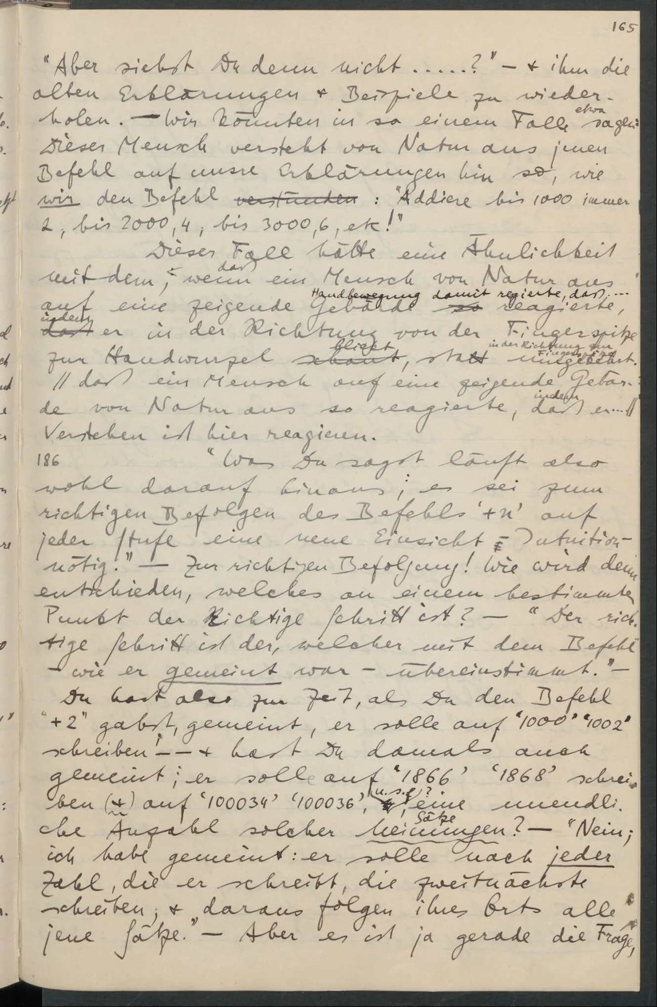 186 “Was Du sagst, läuft also wohl darauf hinaus, es sei zum richtigen Befolgen des Befehls ‘ + n’ auf jeder Stufe eine neue Einsicht – Intuition – nötig.” – Zur richtigen Befolgung! Wie wird denn entschieden, welches an einem bestimmten Punkt der richtige Schritt ist? – “Der richtige Schritt ist der, welcher mit dem Befehl – wie er gemeint war – übereinstimmt.” – Du hast also zur Zeit, als Du den Befehl “ + 2” gabst, gemeint, er solle auf ‘1000’ ‘1002’ schreiben – – & hast Du damals auch gemeint, er solle auf ‘1866’ ‘1868’ schreiben (&) auf ‘100034’ ‘100036’, u.s.f., eine unendliche Anzahl solcher Meinungen? – “Nein; ich habe gemeint: er solle nach jeder Zahl, die er schreibt, die zweitnächste schreiben; & daraus folgen ihres Orts alle jene Sätze.” – Aber es ist ja gerade die Frage, was, an irgend einem Ort, aus jenem Satz folgt. Oder auch: – was wir an irgend einem Ort “Übereinstimmung” mit jenem Satz nennen sollen(& auch mit der Meinung, die Du damals dem Satz gegeben hast, – worin immer diese bestanden haben mag). Richtiger, als zu sagen, es sei an jedem Punkt eine neue Intuition nötig, wäre es, zu sagen: es sei an jedem Punkt eine neue Entscheidung nötig.