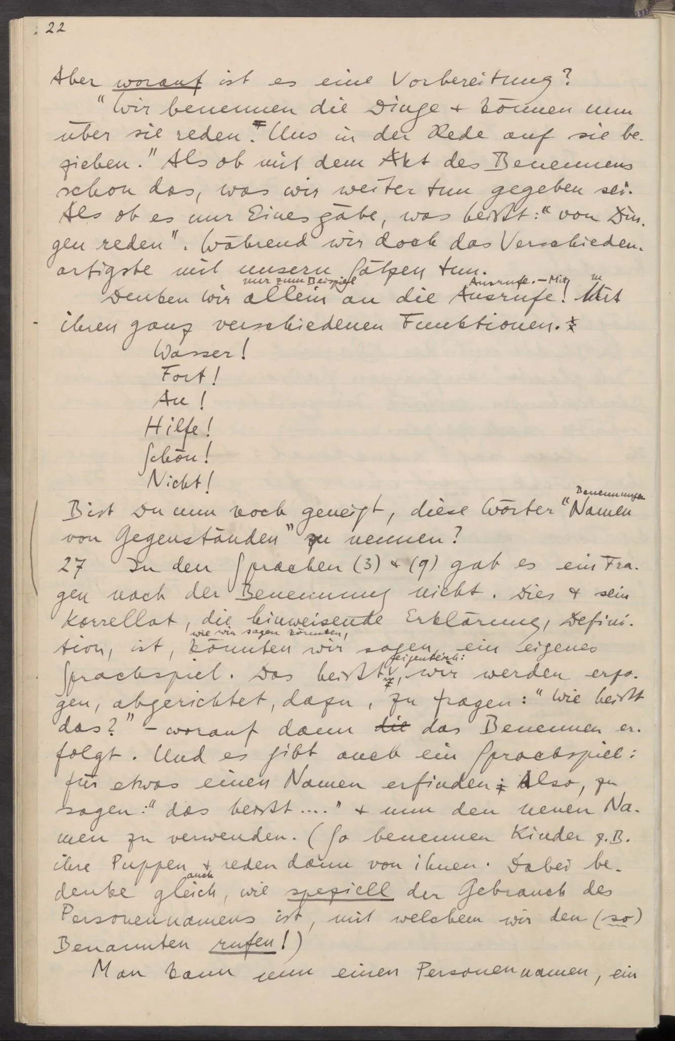 22 Man hat freilich das Recht ein Behauptungszeichen zu verwenden im Gegensatz z.B. zu einem Fragezeichen. Irrig ist es nur, wenn man meint, daß die Behauptung nun aus zwei Akten besteht, dem Erwägen & dem Behaupten (Beilegen des Wahrheitswerts, oder dergl.) & daß wir diese Akte nach den Zeichen des Satzes ausführen, ungefähr wie wir nach Noten singen. Mit dem Singen nach Noten ist allerdings das laute, oder leise, Lesen nach dem geschriebenen Satz zu vergleichen, aber nicht das ‘Meinen’ (Denken) des gelesenen Satzes.