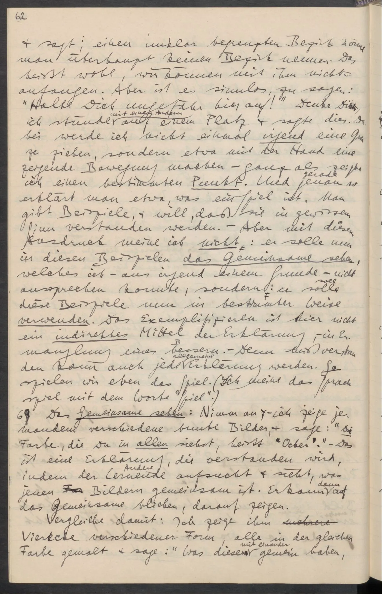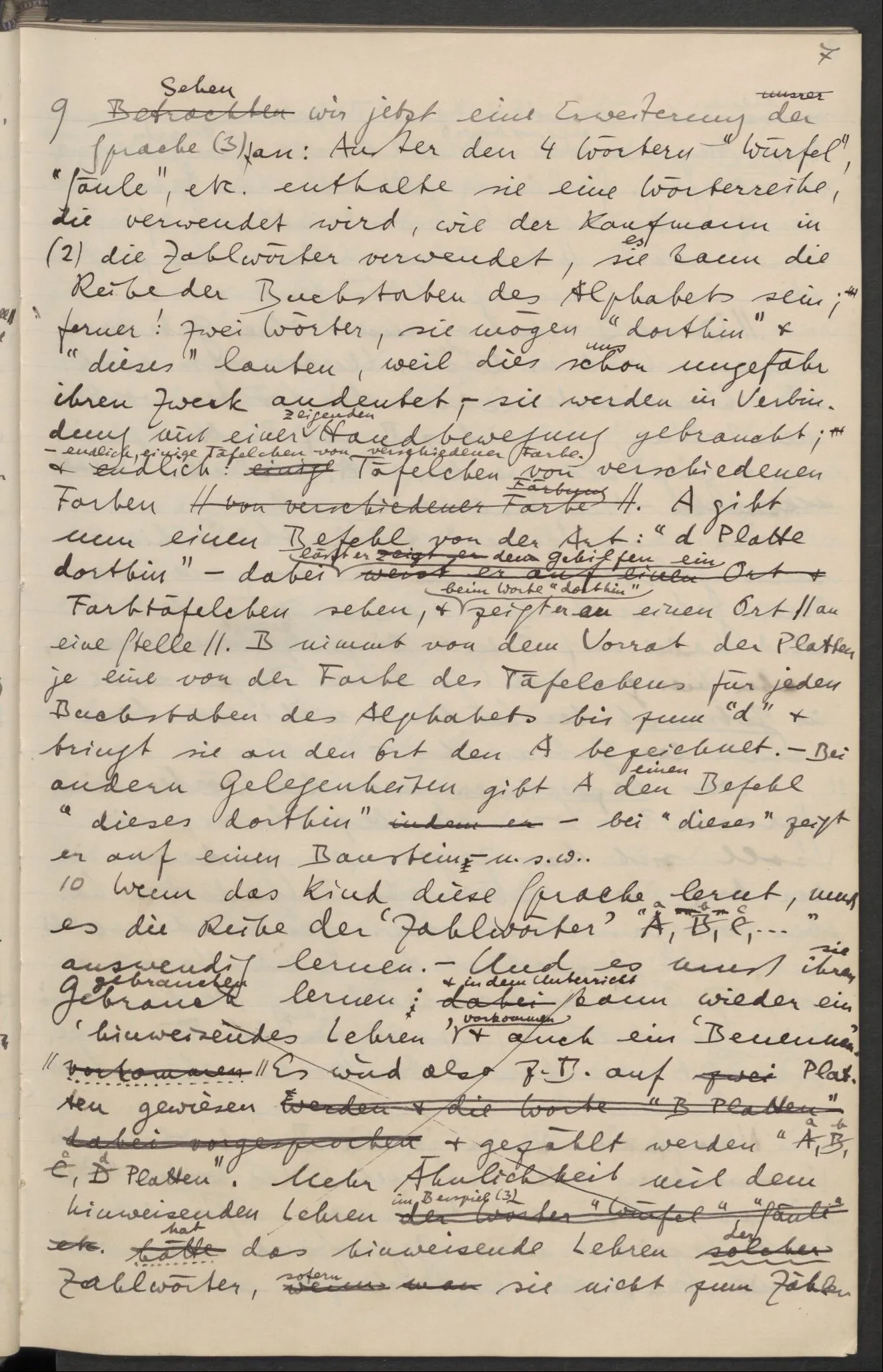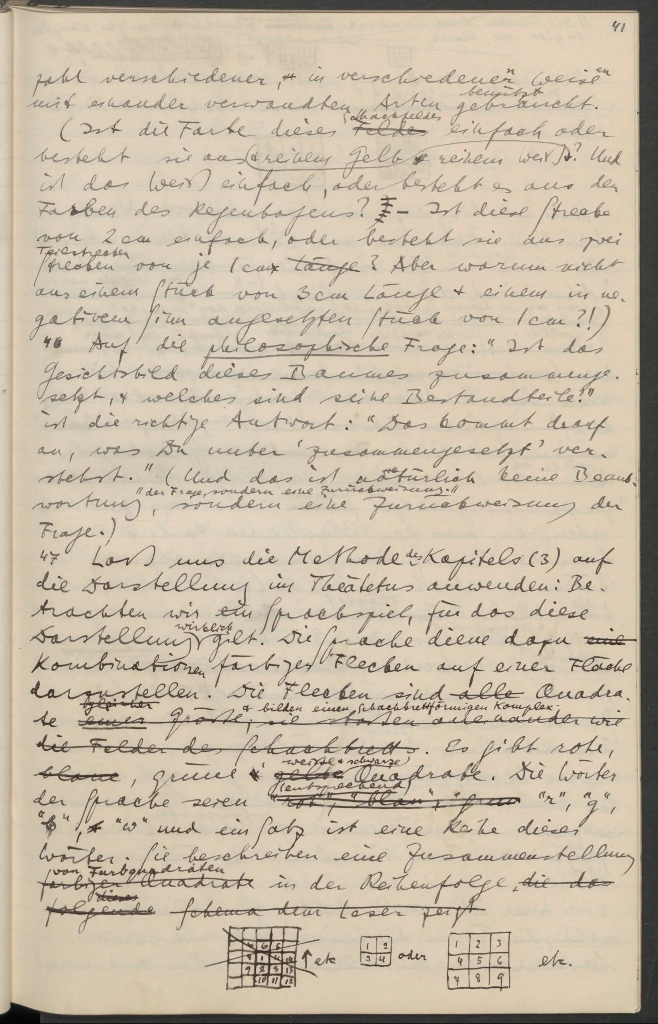 9 Sehen wir jetzt eine Erweiterung der Sprache (3) an: Außer den 4 Wörtern “Würfel”, “Säule”, etc. enthalte sie eine Wörterreihe, die verwendet wird, wie der Kaufmann in (2) die Zahlwörter verwendet, sie kann die Reihe der Buchstaben des Alphabets sein; ferner: zwei Wörter, sie mögen “dorthin” & “dieses” lauten, weil dies schon ungefähr ihren Zweck andeutet, – sie werden in Verbindung mit einer zeigenden Handbewegung gebraucht; & endlich: Täfelchen von verschiedenen Farben A gibt nun einen Befehl von der Art: “d Platte dorthin” – dabei läßt er den Gehilfen ein Farbtäfelchen sehen, & beim Worte “dorthin” zeigt er an einen Ort. B nimmt von dem Vorrat der Platten je eine von der Farbe des Täfelchens für jeden Buchstaben des Alphabets bis zum “d” & bringt sie an den Ort den A bezeichnet. – Bei andren Gelegenheiten gibt A den Befehl “dieses dorthin” – bei “dieses” zeigt er auf einen Baustein – u.s.w..
