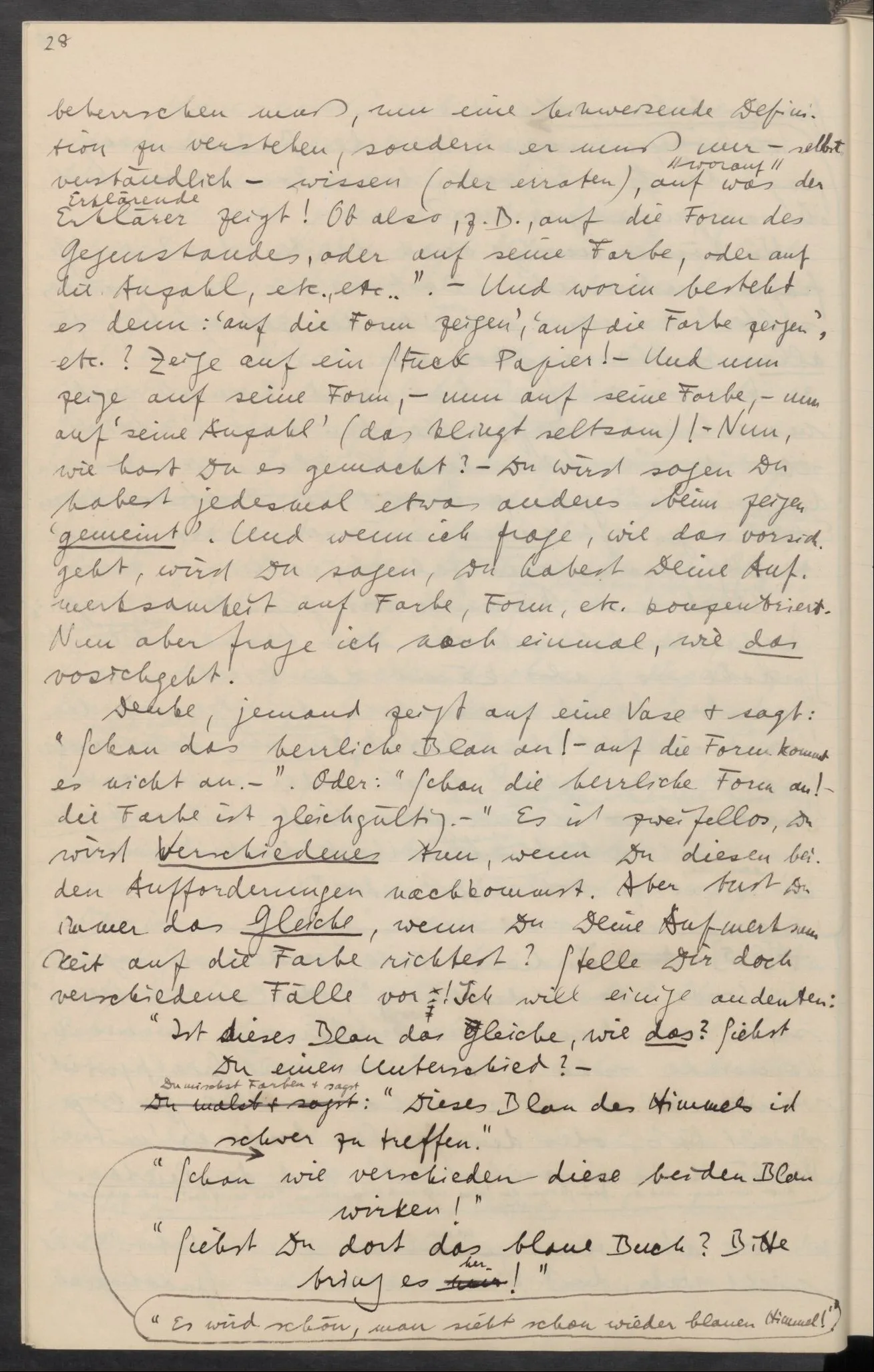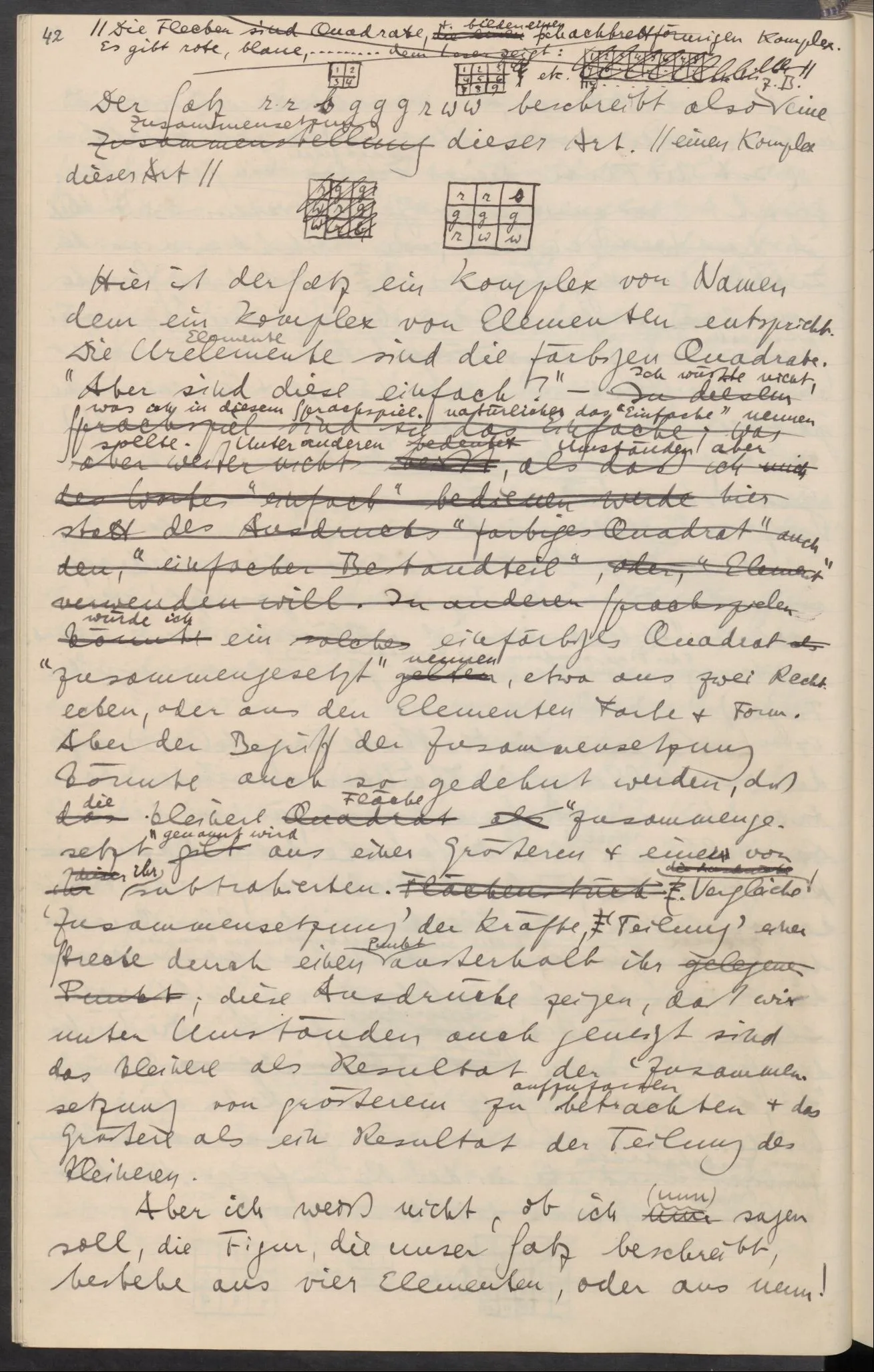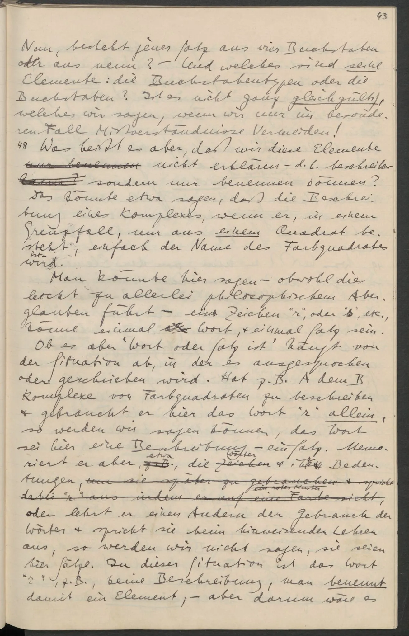 9 Sehen wir jetzt eine Erweiterung der Sprache (3) an: Außer den 4 Wörtern “Würfel”, “Säule”, etc. enthalte sie eine Wörterreihe, die verwendet wird, wie der Kaufmann in (2) die Zahlwörter verwendet, sie kann die Reihe der Buchstaben des Alphabets sein; ferner: zwei Wörter, sie mögen “dorthin” & “dieses” lauten, weil dies schon ungefähr ihren Zweck andeutet, – sie werden in Verbindung mit einer zeigenden Handbewegung gebraucht; & endlich: Täfelchen von verschiedenen Farben A gibt nun einen Befehl von der Art: “d Platte dorthin” – dabei läßt er den Gehilfen ein Farbtäfelchen sehen, & beim Worte “dorthin” zeigt er an einen Ort. B nimmt von dem Vorrat der Platten je eine von der Farbe des Täfelchens für jeden Buchstaben des Alphabets bis zum “d” & bringt sie an den Ort den A bezeichnet. – Bei andren Gelegenheiten gibt A den Befehl “dieses dorthin” – bei “dieses” zeigt er auf einen Baustein – u.s.w..