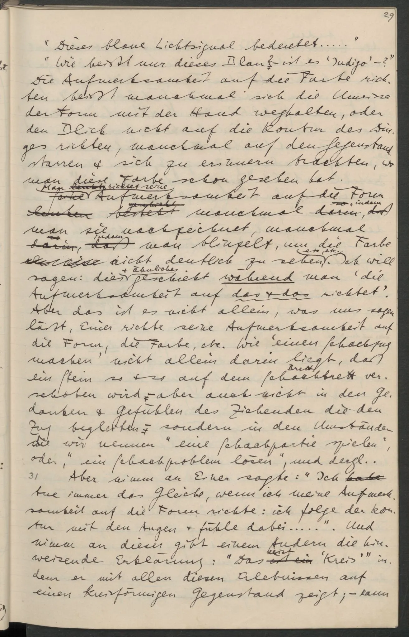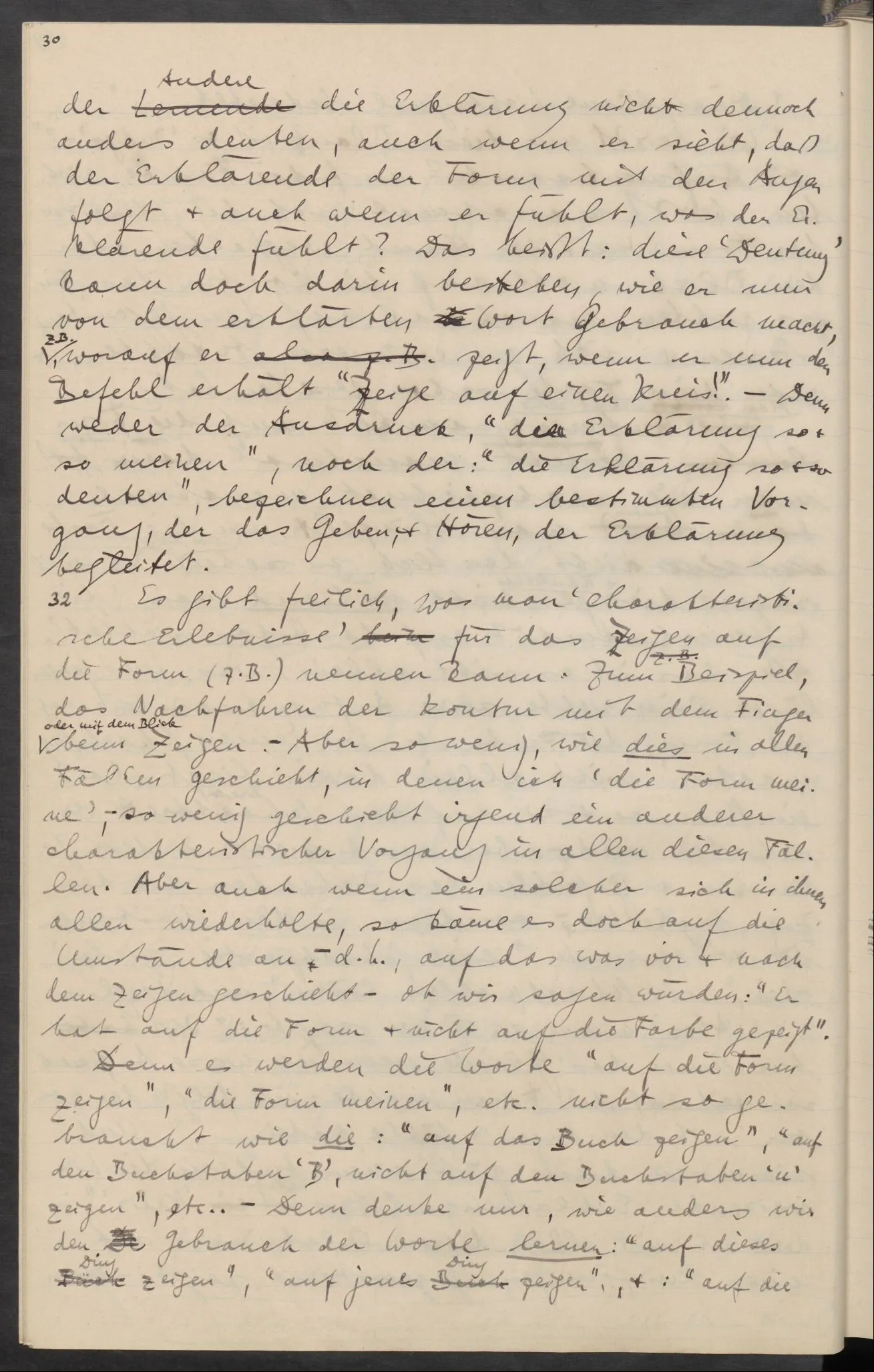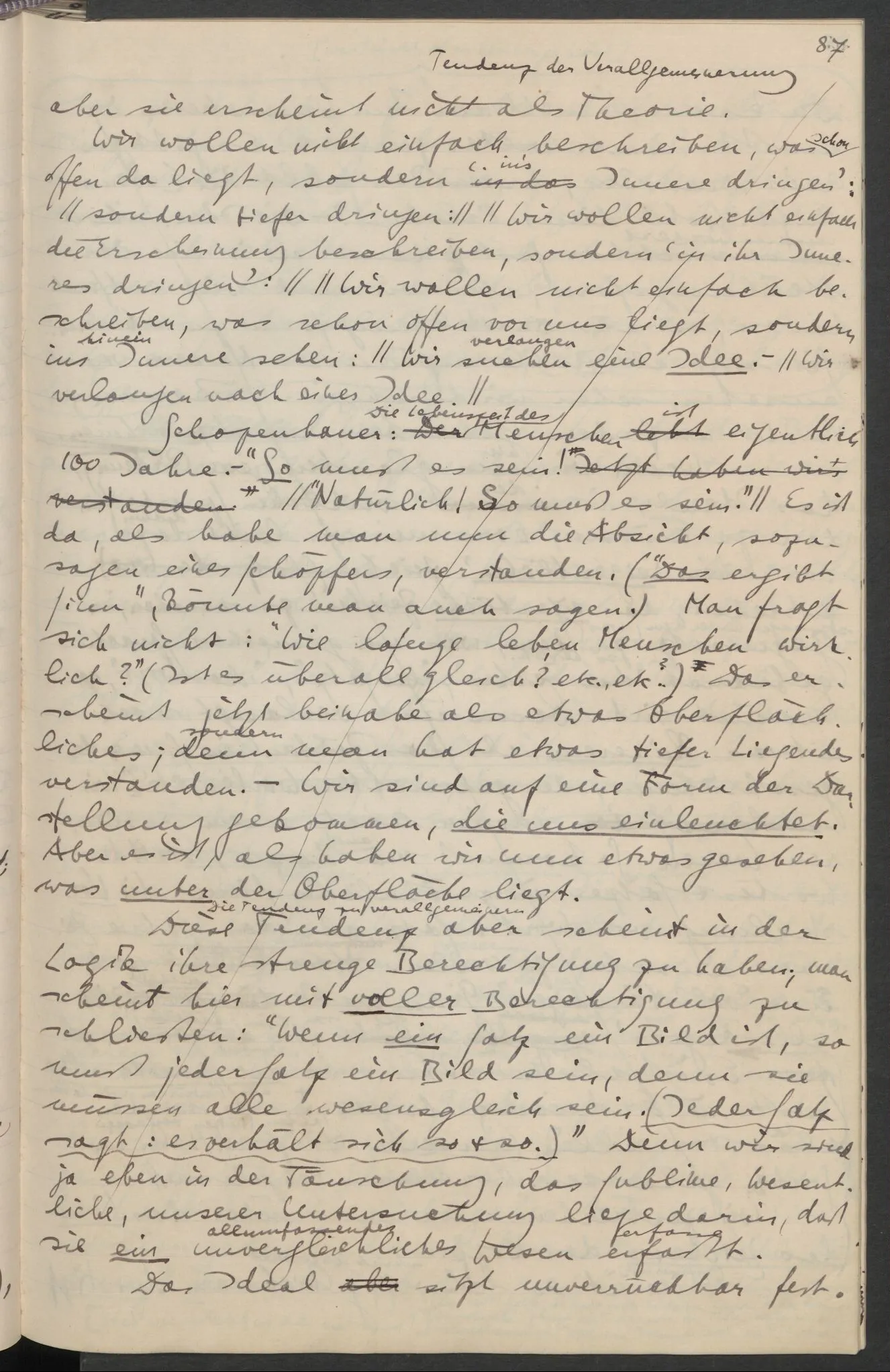 & nun zeichne ihn daneben nach, laß Dich von ihm führen. – Ich möchte sagen: “Gewiß! ich habe mich jetzt führen lassen. Aber was dabei Charakteristisches geschehen ist –? Wenn ich sage, was geschehen ist, so kommt es mir nicht mehr charakteristisch vor.” Aber nun merke ich dies: Während ich mich führen lasse, ist alles ganz einfach, ich merke nichts Besonderes; aber danach, wenn ich mich frage, was damals geschehen ist, so scheint es etwas Unbeschreibbares gewesen zu sein. Danach genügt mir keine Beschreibung. Ich kann, sozusagen, nicht glauben, daß ich bloß hingeschaut, das Gesicht gemacht, den Strich gezogen habe. – Aber erinnere ich mich denn an etwas anderes? Nein; & doch kommt mir vor, als müsse etwas anderes gewesen sein; & zwar dann, wenn ich mir dabei das Wort “führen”, “Einfluß”, & andere, vorsage. ‘Denn ich bin doch geführt worden’, sage ich mir. – Dann erst tritt die Idee jenes ätherischen, ungreifbaren, Einflusses auf.