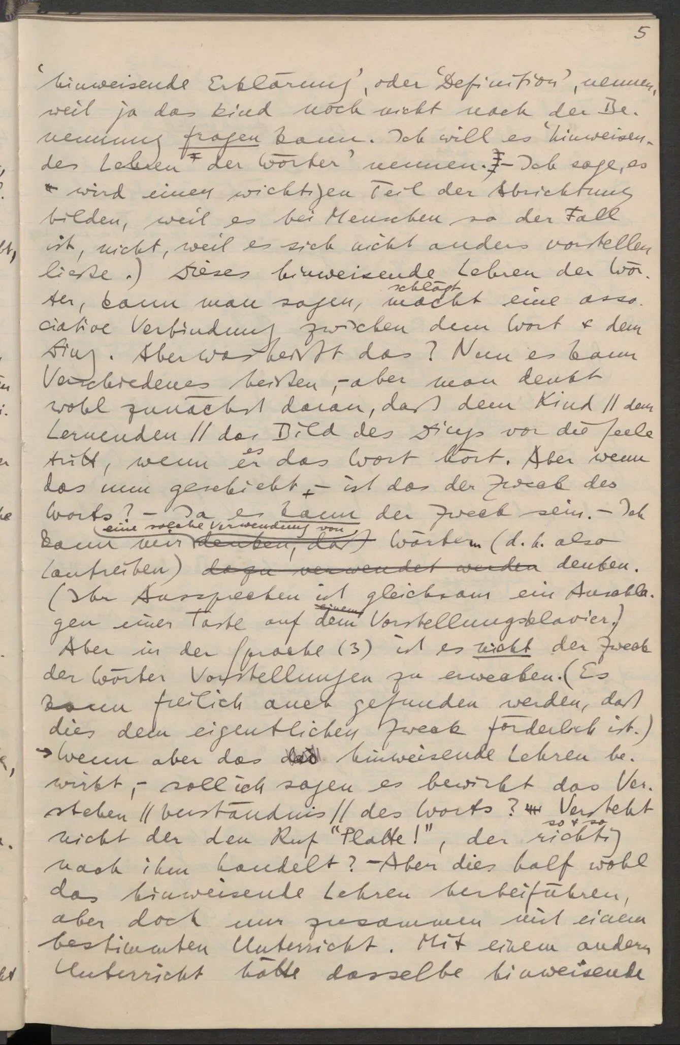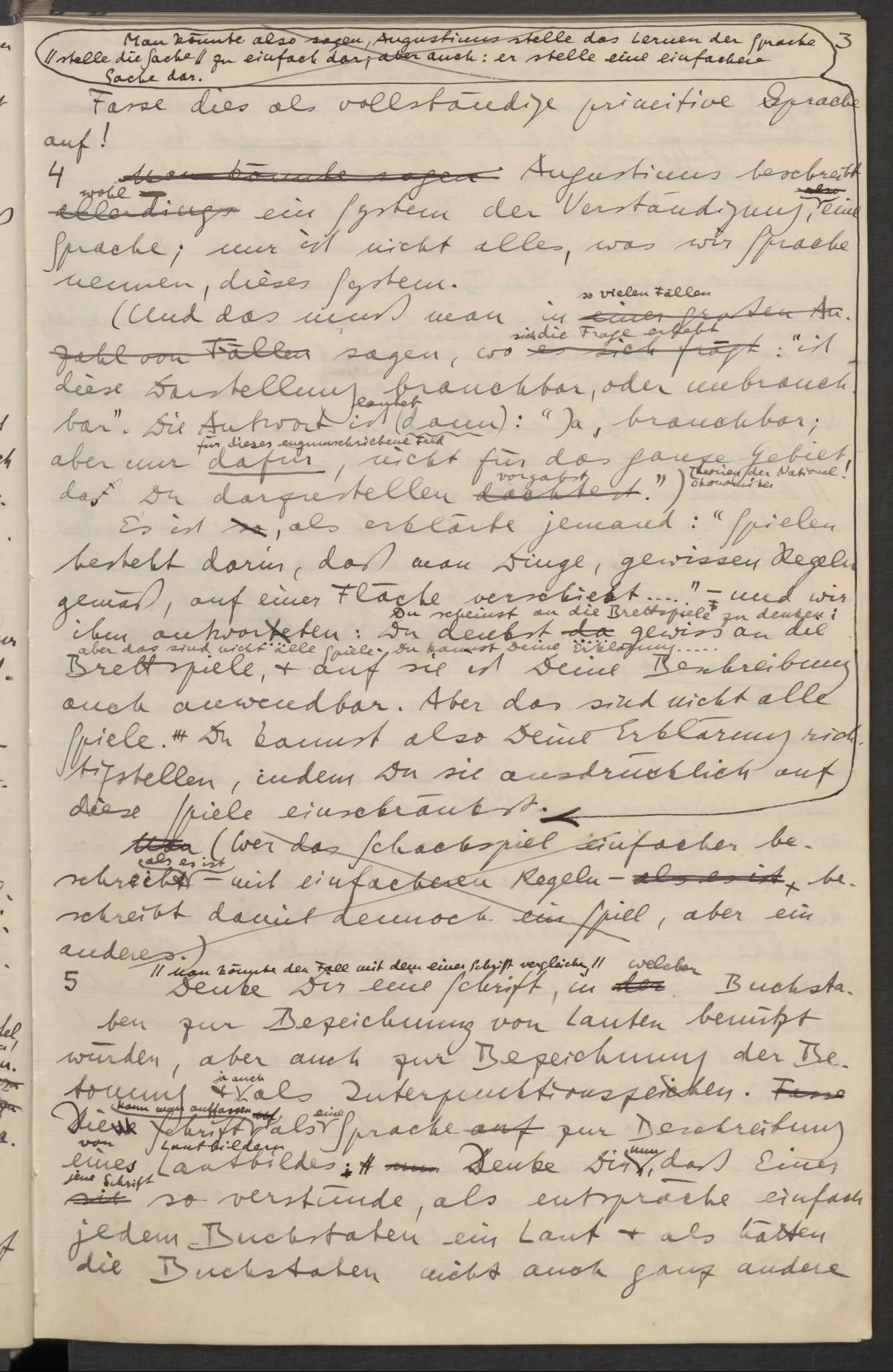 5 Denke Dir eine Schrift, in welcher Buchstaben zur Bezeichnung von Lauten benützt würden, aber auch zur Bezeichnung der Betonung & ja auch als Interpunktionszeichen. Die Schrift kann man auffassen als eine Sprache zur Beschreibung eines Lautbildes. Denke Dir nun, daß Einer jene Schrift so verstünde, als entspräche einfach jedem Buchstaben ein Laut & als hätten die Buchstaben nicht auch ganz andere Funktionen. – So einer – zu einfachen – Auffassung der Schrift gleicht Augustinus’ Auffassung der Sprache.
