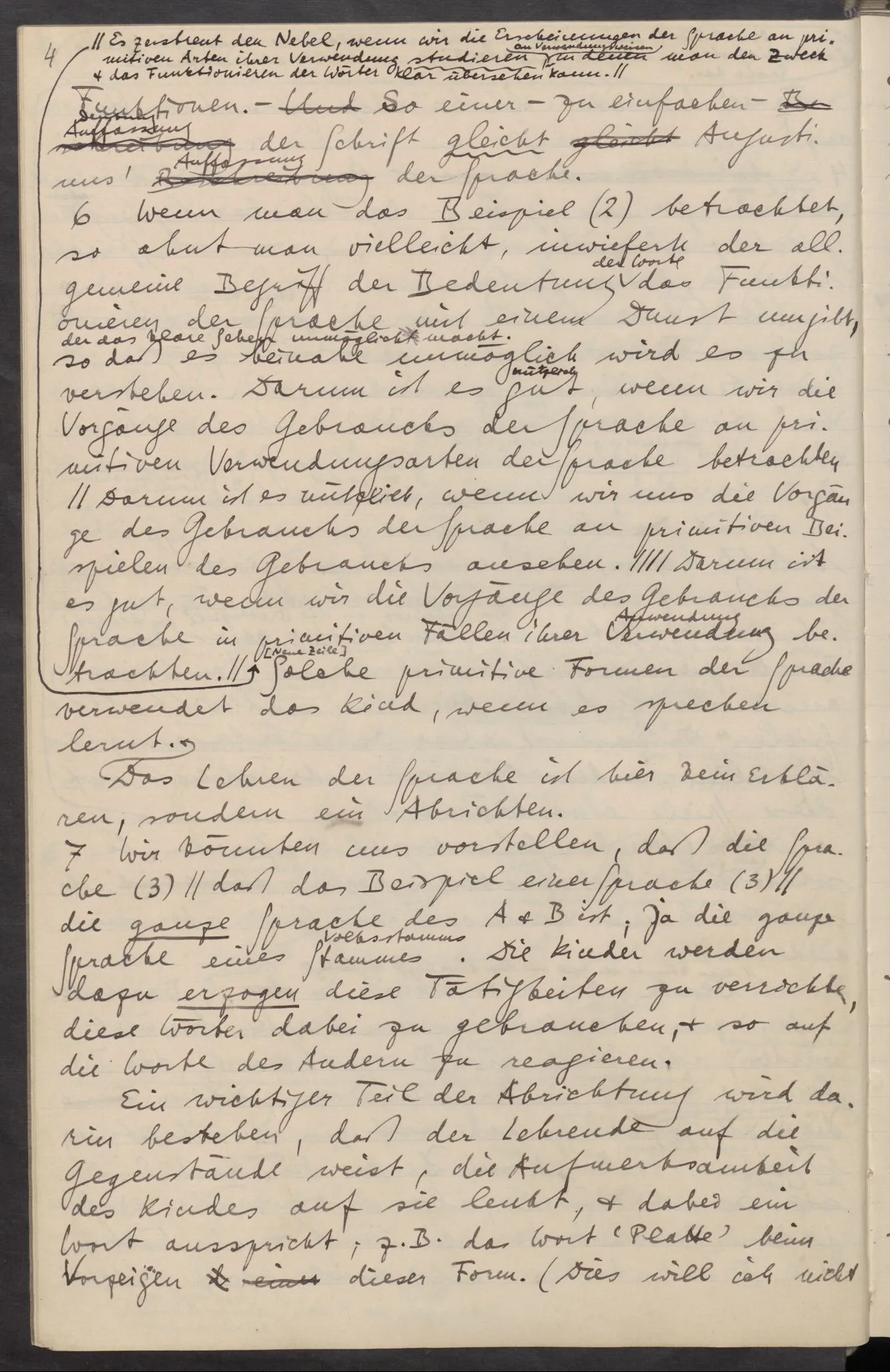 6 Wenn man das Beispiel (2) betrachtet, so ahnt man vielleicht, inwiefern der allgemeine Begriff der Bedeutung der Worte das Funktionieren der Sprache mit einem Dunst umgibt, so daß es beinahe unmöglich wird es zu verstehen. Darum ist es gut, wenn wir die Vorgänge des Gebrauchs der Sprache an primitiven Verwendungsarten der Sprache betrachten. Solche primitive Formen der Sprache verwendet das Kind, wenn es sprechen lernt. Das Lehren der Sprache ist hier kein Erklären, sondern ein Abrichten.