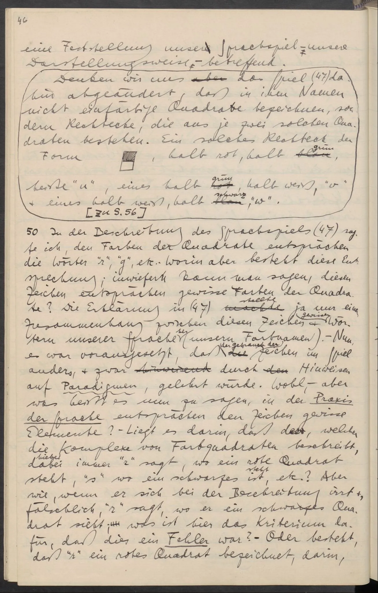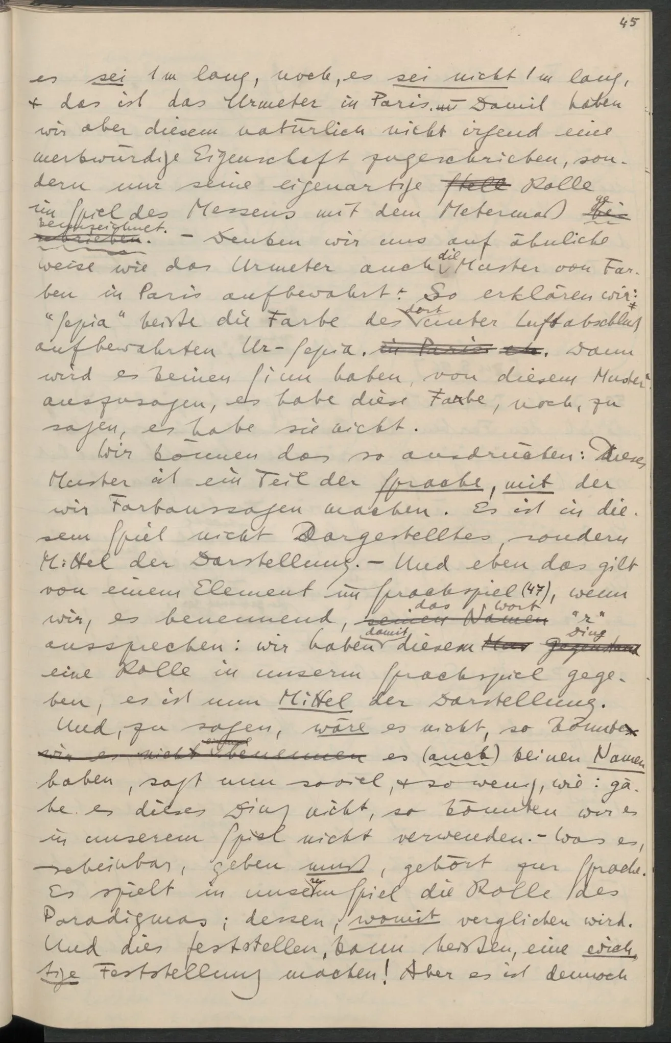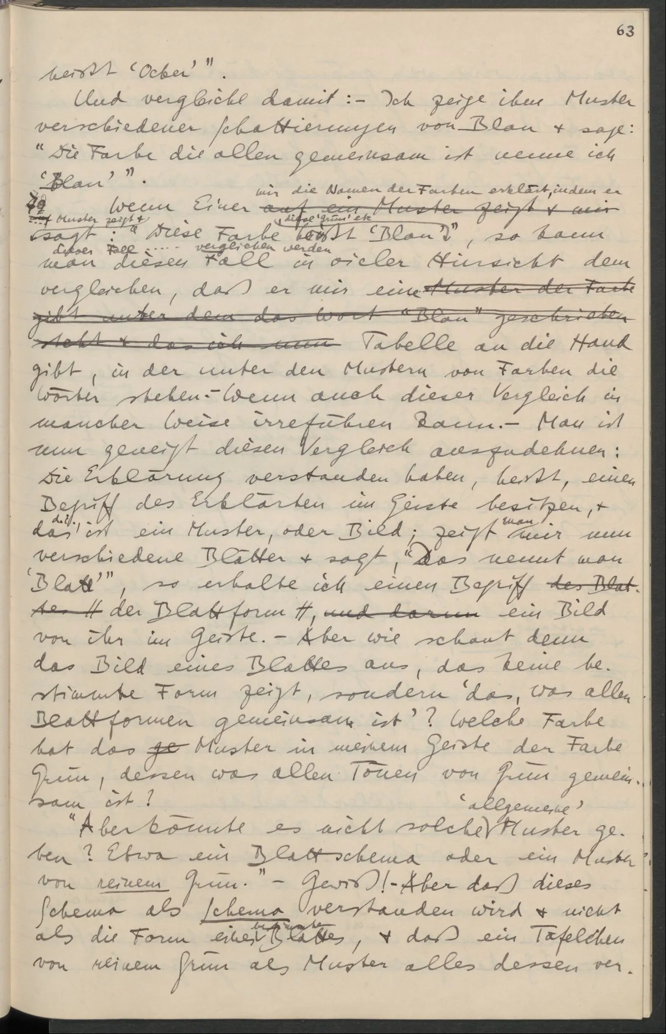 14 Wie ist es mit den Farbmustern, die A dem B zeigt, – gehören sie zur Sprache? Nun, wie man will. Zur Wortsprache gehören sie nicht; aber wenn ich jemandem sagte: “Sage das Wort ‘das’ aus”, so wirst Du doch dieses zweite “‘das’” auch noch zum Satz rechnen. Und doch spielt es eine ganz ähnliche Rolle, wie ein Farbtäfelchen im Sprachspiel (9); es ist nämlich ein Muster dessen, was er sagen soll, wie das Farbtäfelchen ein Muster dessen, was B bringen soll. Es ist das Natürlichste & richtet am wenigsten Verwirrung an, wenn wir die Muster zu den Instrumenten der Sprache rechnen.