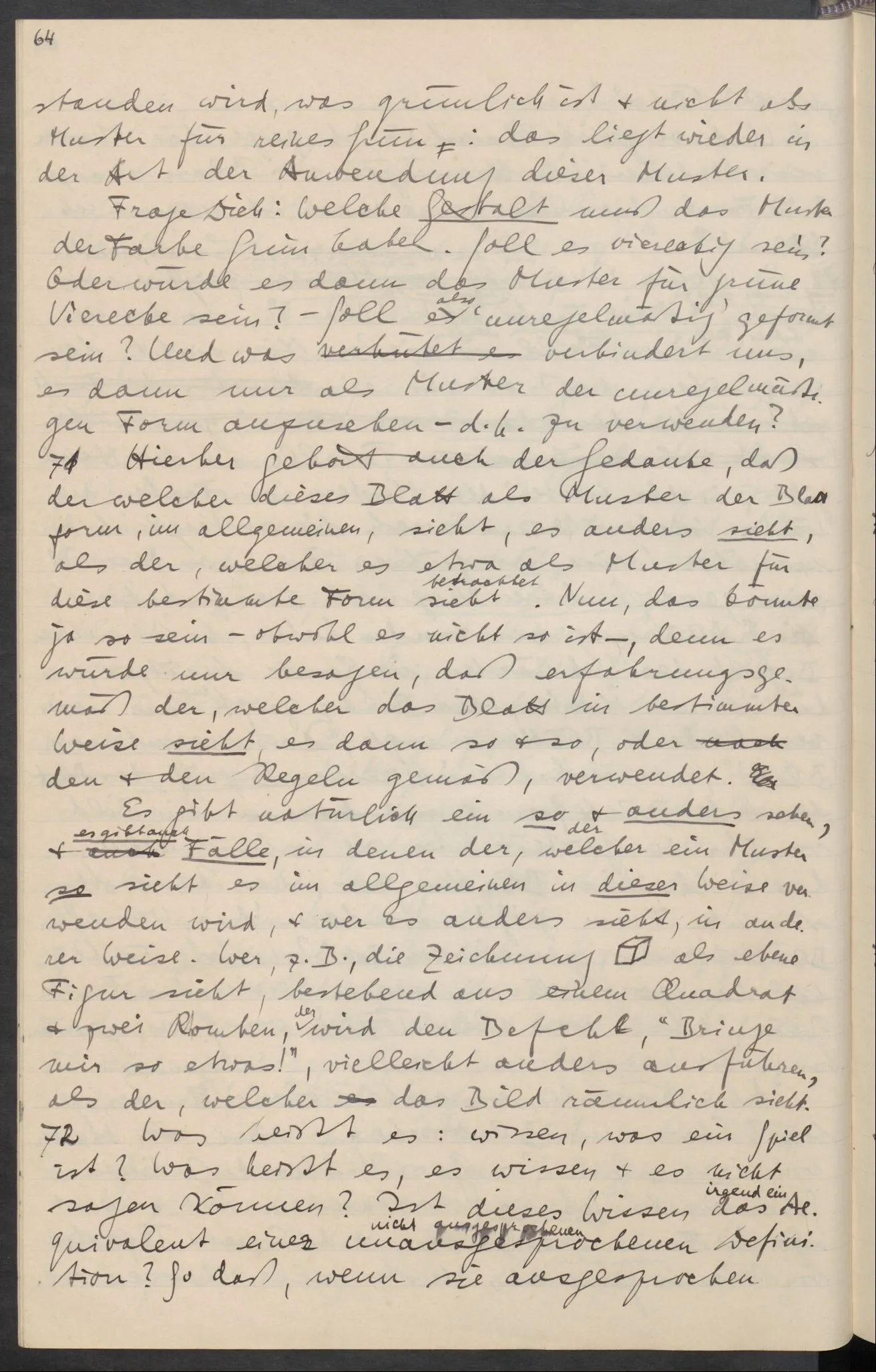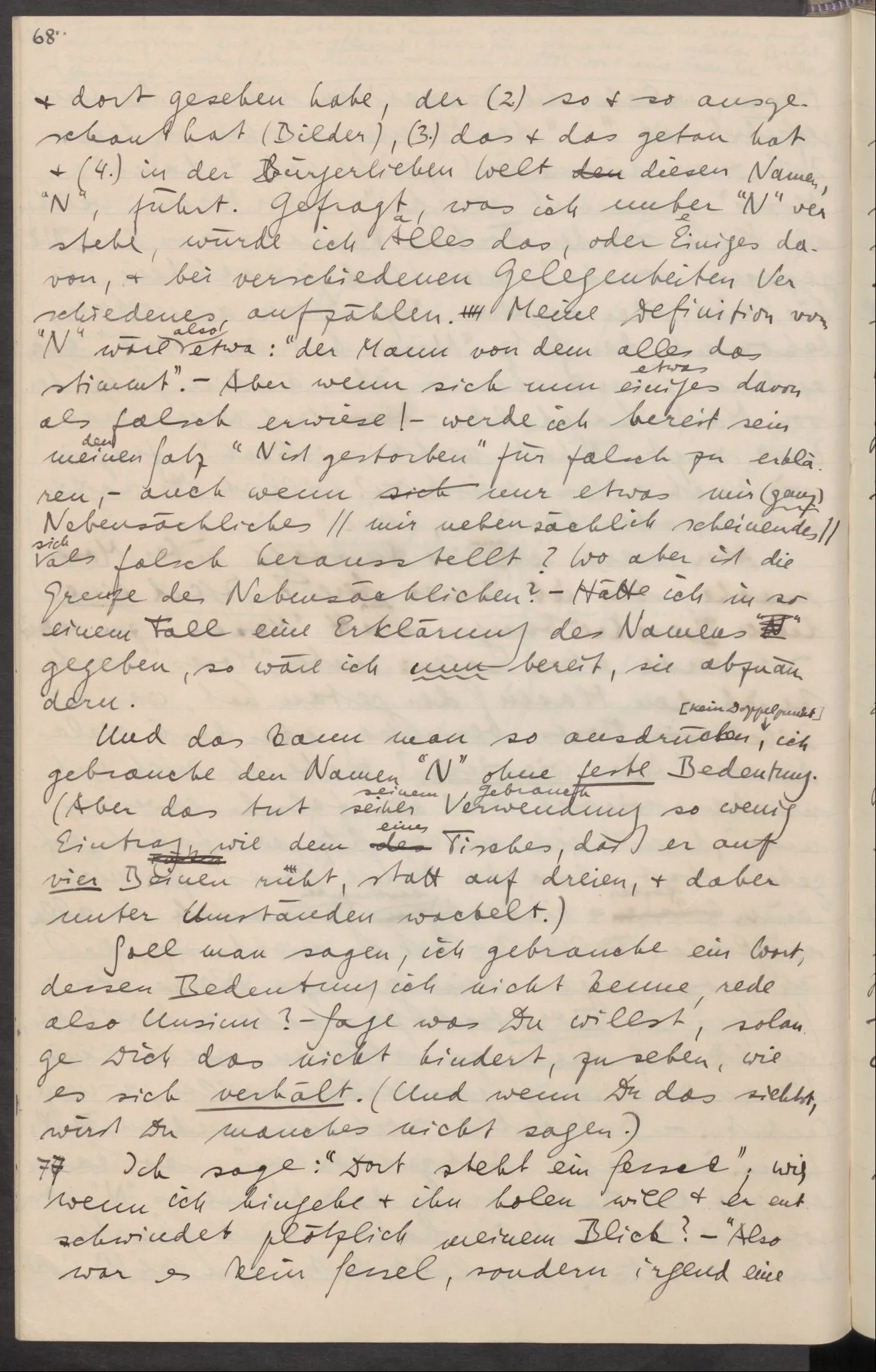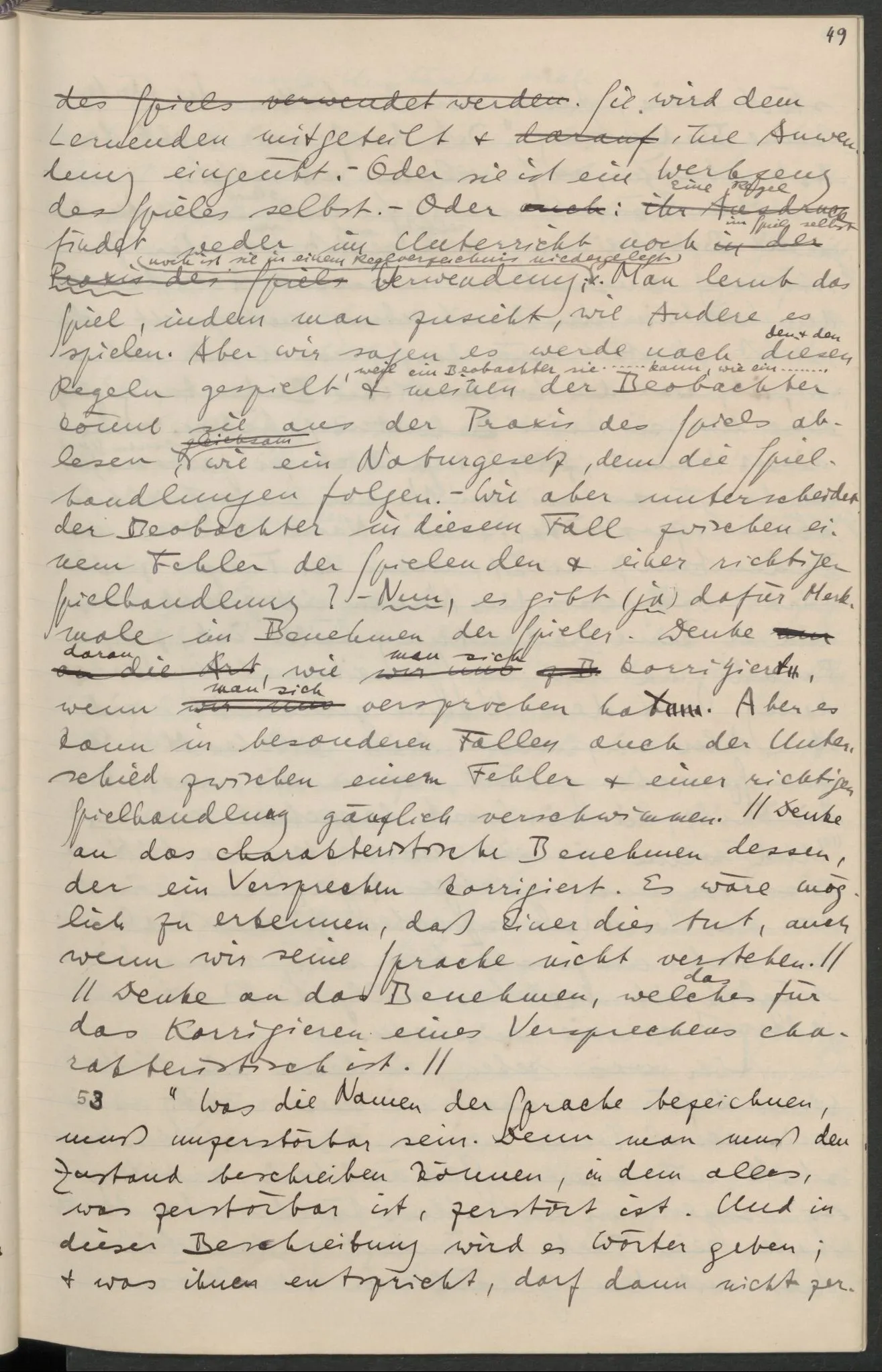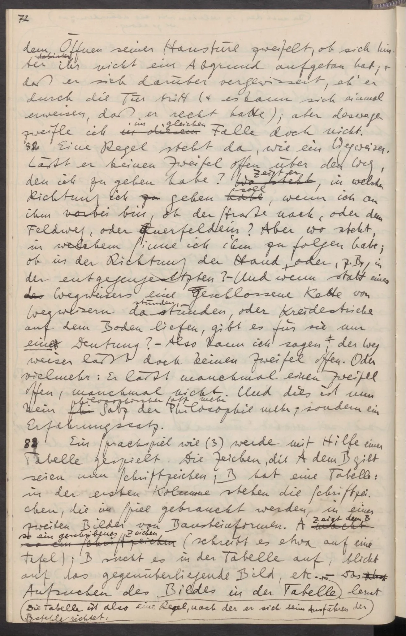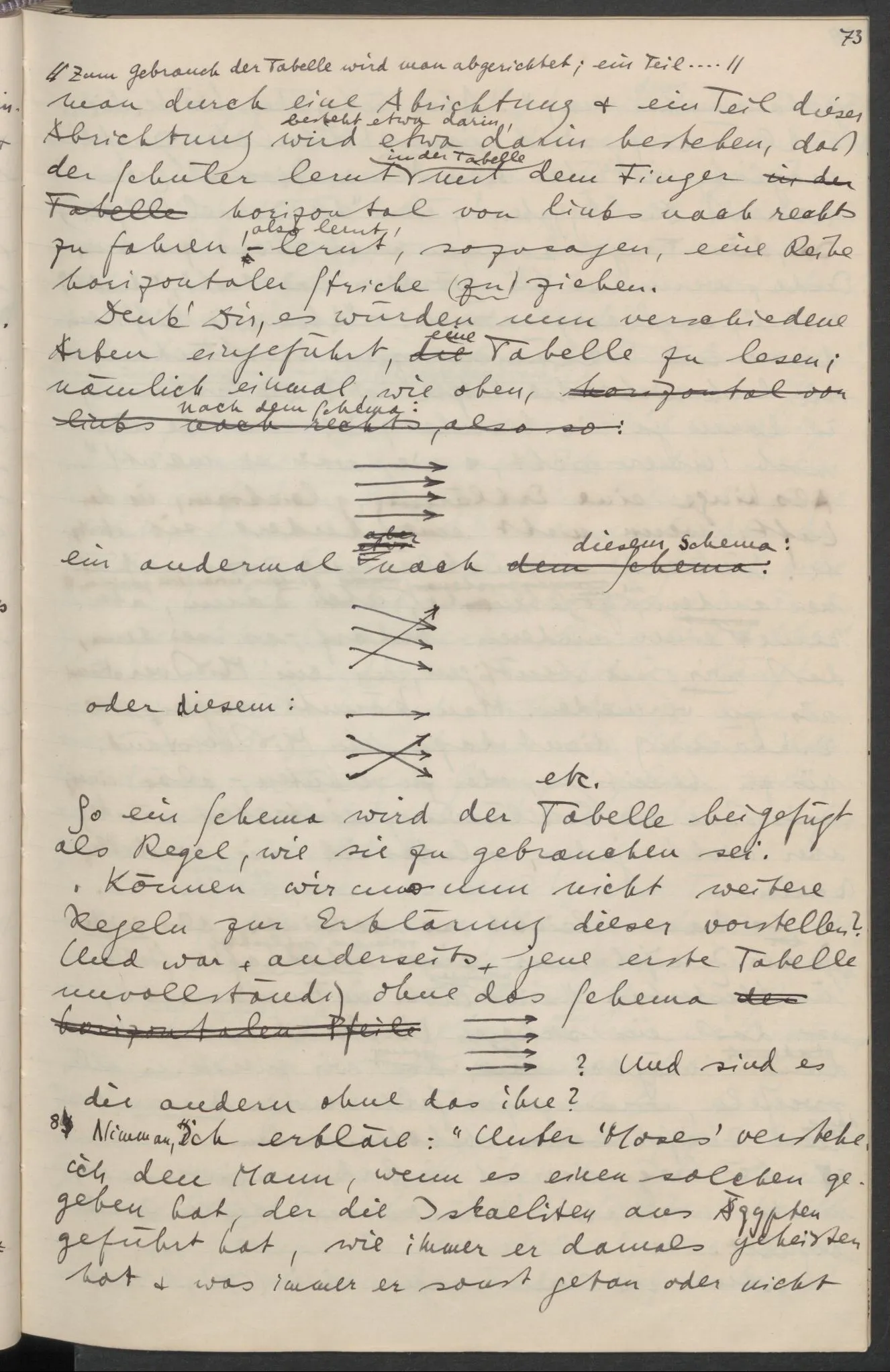 Auch das wäre wohl noch ein Ableiten nach der Tabelle, wenn der Gebrauch, den er von ihr macht, durch ein Pfeilschema ohne alle einfache Regelmäßigkeit wiedergegeben ist. – Aber nimm an, er bleibe nicht bei seiner Art des Transkribierens; sondern ändere sie nach einer einfachen Regel: Hat er einmal ein A in ein n umgeschrieben, so schreibt er das nächste A in ein σ, das nächste in ein p um, u.s.w..– Aber wo ist die Grenze zwischen diesem Vorgehen und dem eines regellosen?