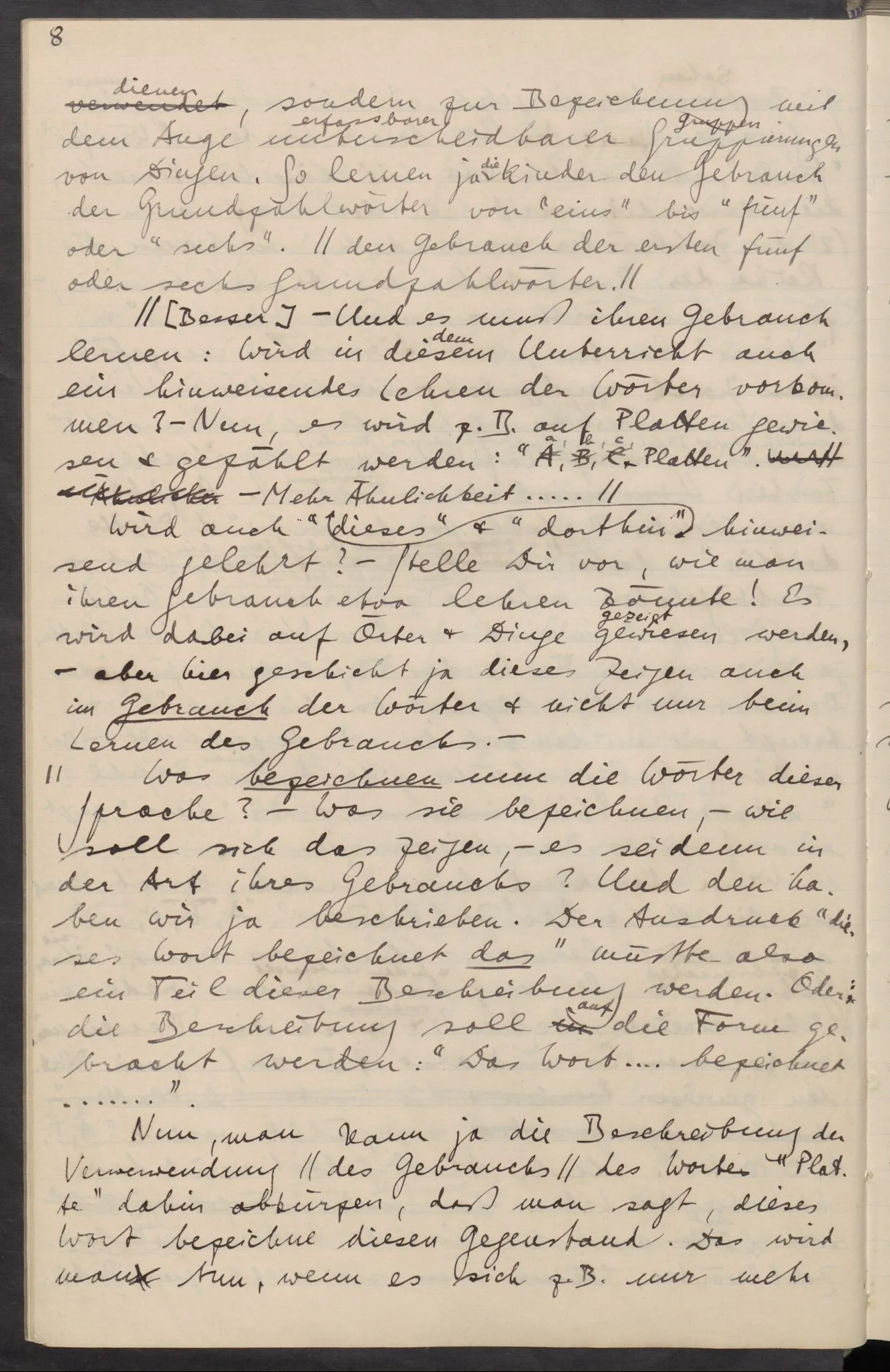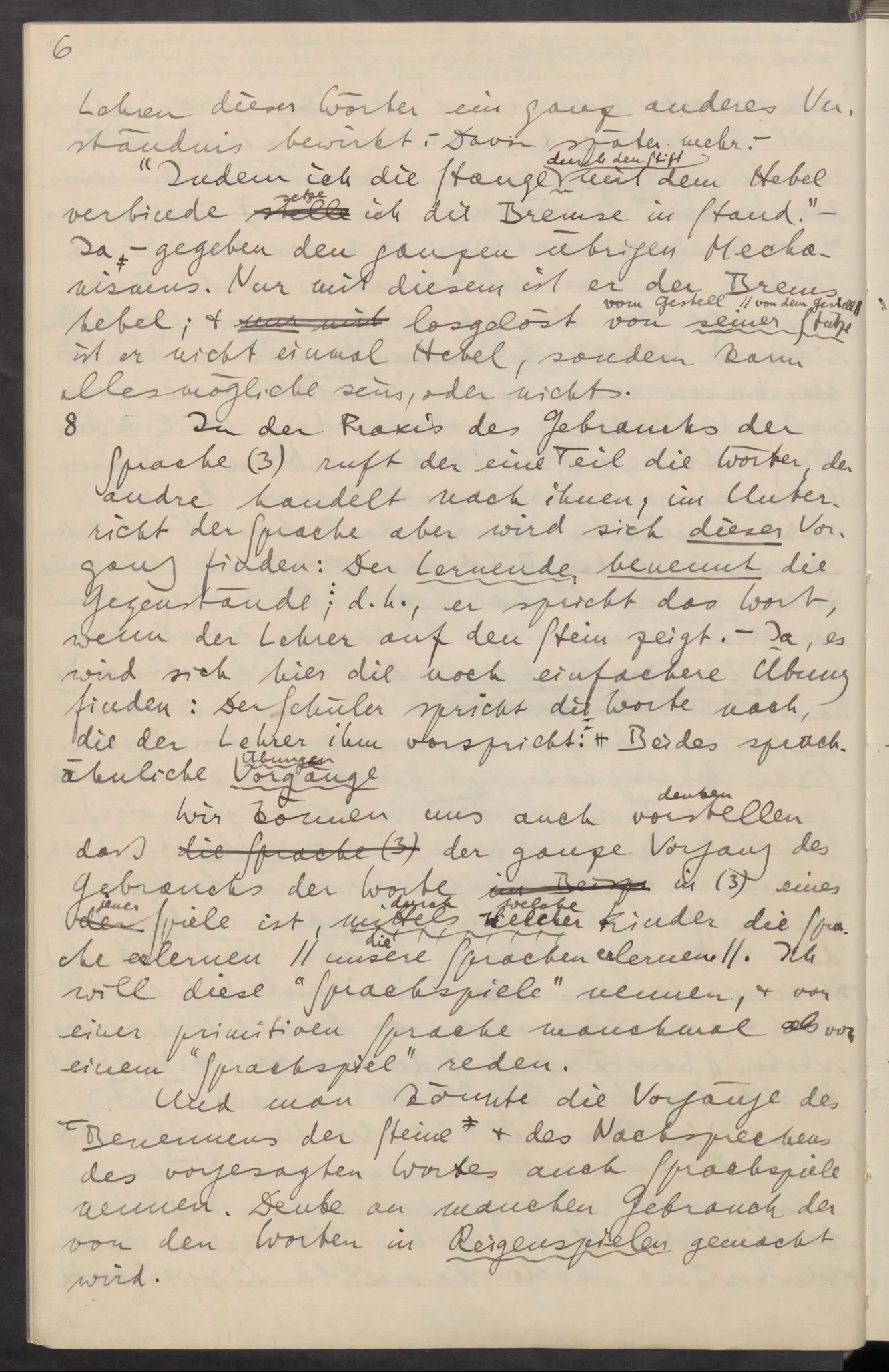 7 Wir könnten uns vorstellen, daß die Sprache (3) die ganze Sprache des A und B ist; ja die ganze Sprache eines Stammes. Die Kinder werden dazu erzogen diese Tätigkeiten zu verrichten, diese Wörter dabei zu gebrauchen, & so auf die Worte des Andern zu reagieren. Ein wichtiger Teil der Abrichtung wird darin bestehen, daß der Lehrende auf die Gegenstände weist, die Aufmerksamkeit des Kindes auf sie lenkt, und dabei ein Wort ausspricht; z.B. das Wort ‘Platte’ beim Vorzeigen dieser Form. (Dies will ich nicht ‘hinweisende Erklärung’, oder ‘Definition’, nennen, weil ja das Kind noch nicht nach der Benennung fragen kann. Ich will es ‘hinweisendes Lehren der Wörter’ nennen. – Ich sage, es wird einen wichtigen Teil der Abrichtung bilden, weil es bei Menschen so der Fall ist, nicht, weil es sich nicht anders vorstellen ließe.) Dieses hinweisende Lehren der Wörter, kann man sagen, macht eine assoziative Verbindung zwischen dem Wort & dem Ding. Aber was heißt das? Nun es kann Verschiedenes heißen, – aber man denkt wohl zunächst daran, daß dem Kind das Bild des Dings vor die Seele tritt wenn es das Wort hört. Aber wenn das nun geschieht – ist das der Zweck des Worts? – Ja, es kann der Zweck sein. – Ich kann mir eine solche Verwendung von Wörtern (d.h. also Lautreihen) denken. (Ihr Aussprechen ist gleichsam ein Anschlagen einer Taste auf dem Vorstellungsklavier.) Aber in der Sprache (3) ist es nicht der Zweck der Wörter Vorstellungen zu erwecken. (Es kann freilich auch gefunden werden, daß dies dem eigentlichen Zweck förderlich ist.) Wenn aber das das hinweisende Lehren bewirkt, – soll ich sagen, es bewirkt das Verstehen des Worts? Versteht nicht der den Ruf “Platte!”, der richtig nach ihm handelt? – Aber dies half wohl das hinweisende Lehren herbeiführen, aber doch nur zusammen mit einem bestimmten Unterricht. Mit einem anderen Unterricht hätte dasselbe hinweisende Lehren dieser Wörter ein ganz anderes Verständnis bewirkt. – Davon später mehr. – “Indem ich die Stange durch den Stift mit dem Hebel verbinde, setze ich die Bremse instand.” – Ja – gegeben den ganzen übrigen Mechanismus. Nur mit diesem ist er der Bremshebel; & losgelöst von seiner Stütze ist er nicht einmal Hebel, sondern kann alles mögliche sein, oder nichts.