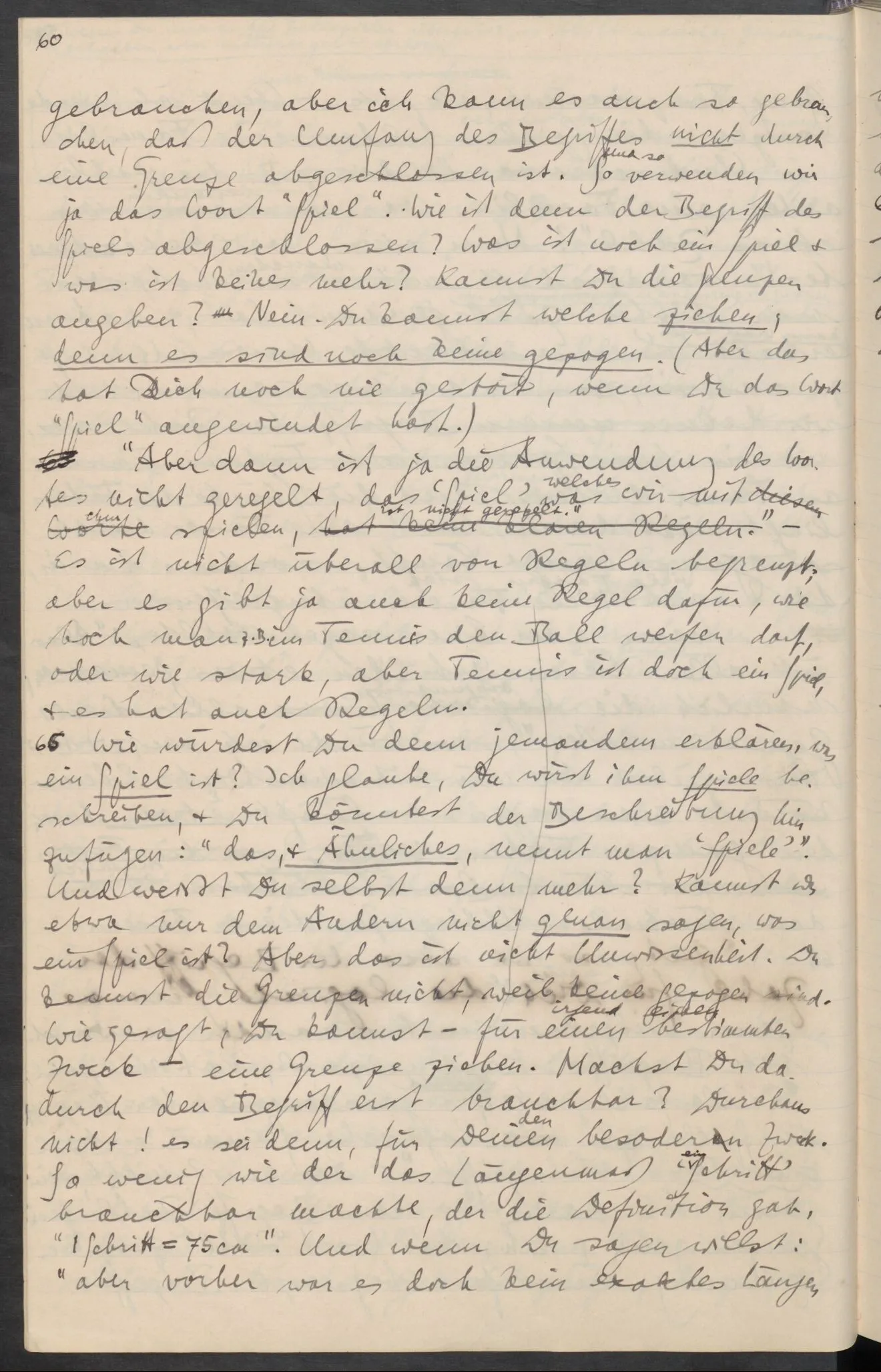Es ist, als erklärte jemand: “Spielen besteht darin, daß man Dinge, gewissen Regeln gemäß, auf einer Fläche verschiebt …”– und wir ihm antworten: Du denkst da gewiß an die Brettspiele, & auf sie ist Deine Beschreibung auch anwendbar. Aber das sind nicht alle Spiele. Du kannst also Deine Erklärung richtigstellen, indem Du sie ausdrücklich auf diese Spiele einschränkst.