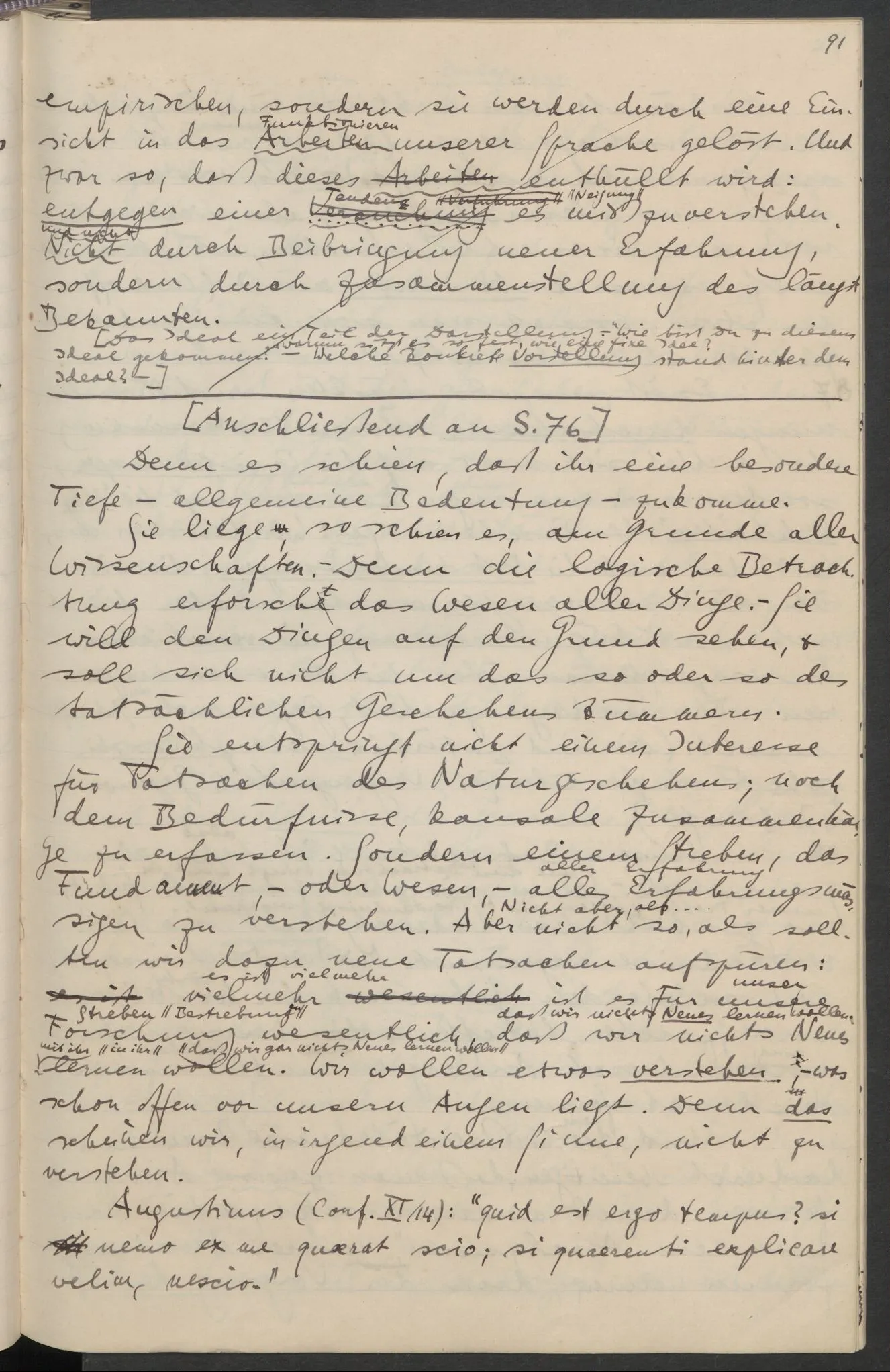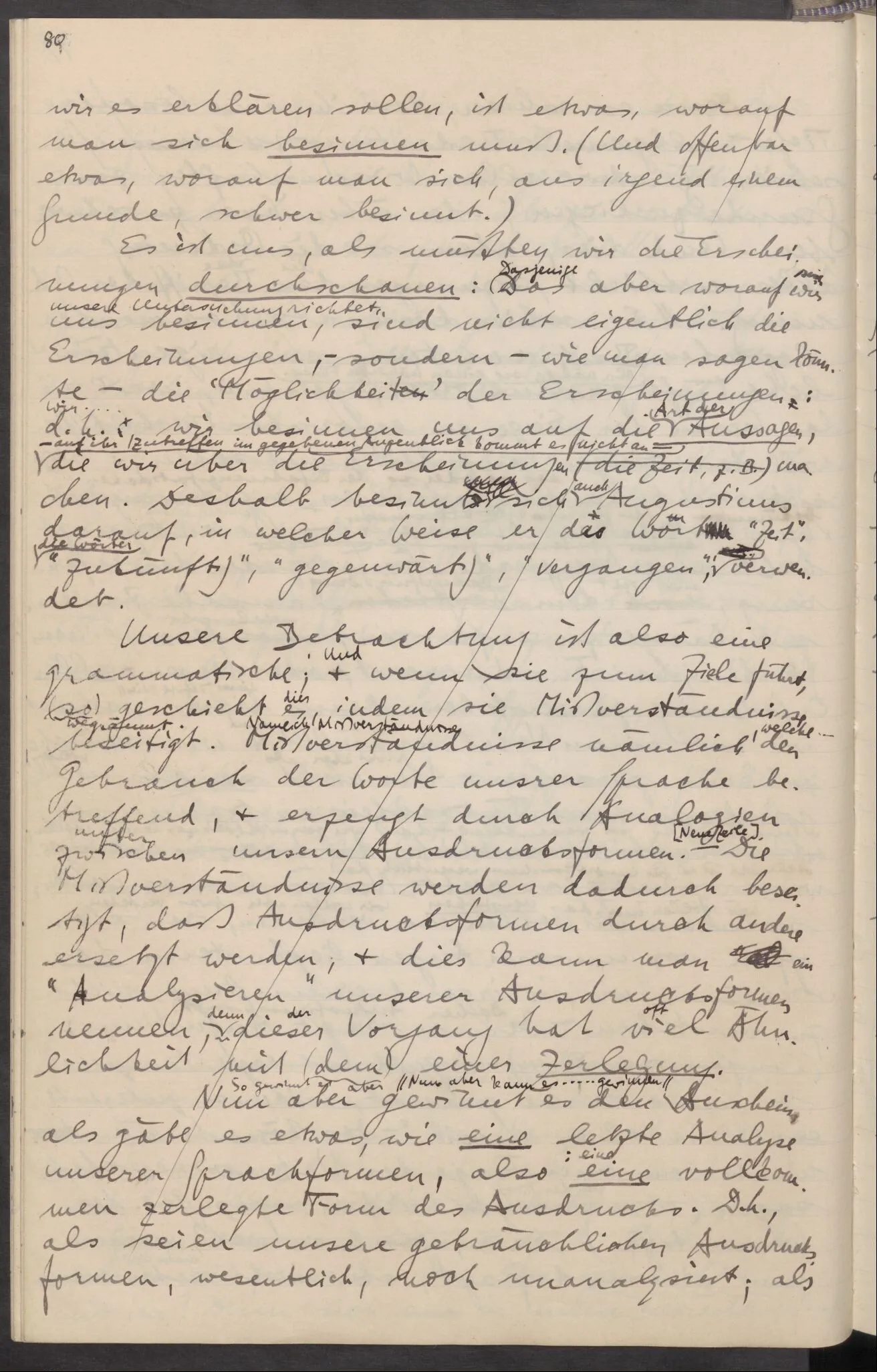 Von einem Unterschied der Wortarten spricht Augustinus nicht; bei seiner Beschreibung schweben uns zunächst Hauptwörter vor, wie ‘Tisch’, ‘Brot’, ‘Baum’ & (die) Namen von Personen; die andern Wortarten schließen sich, an, aber gleichsam, gegen den Hintergrund zu.