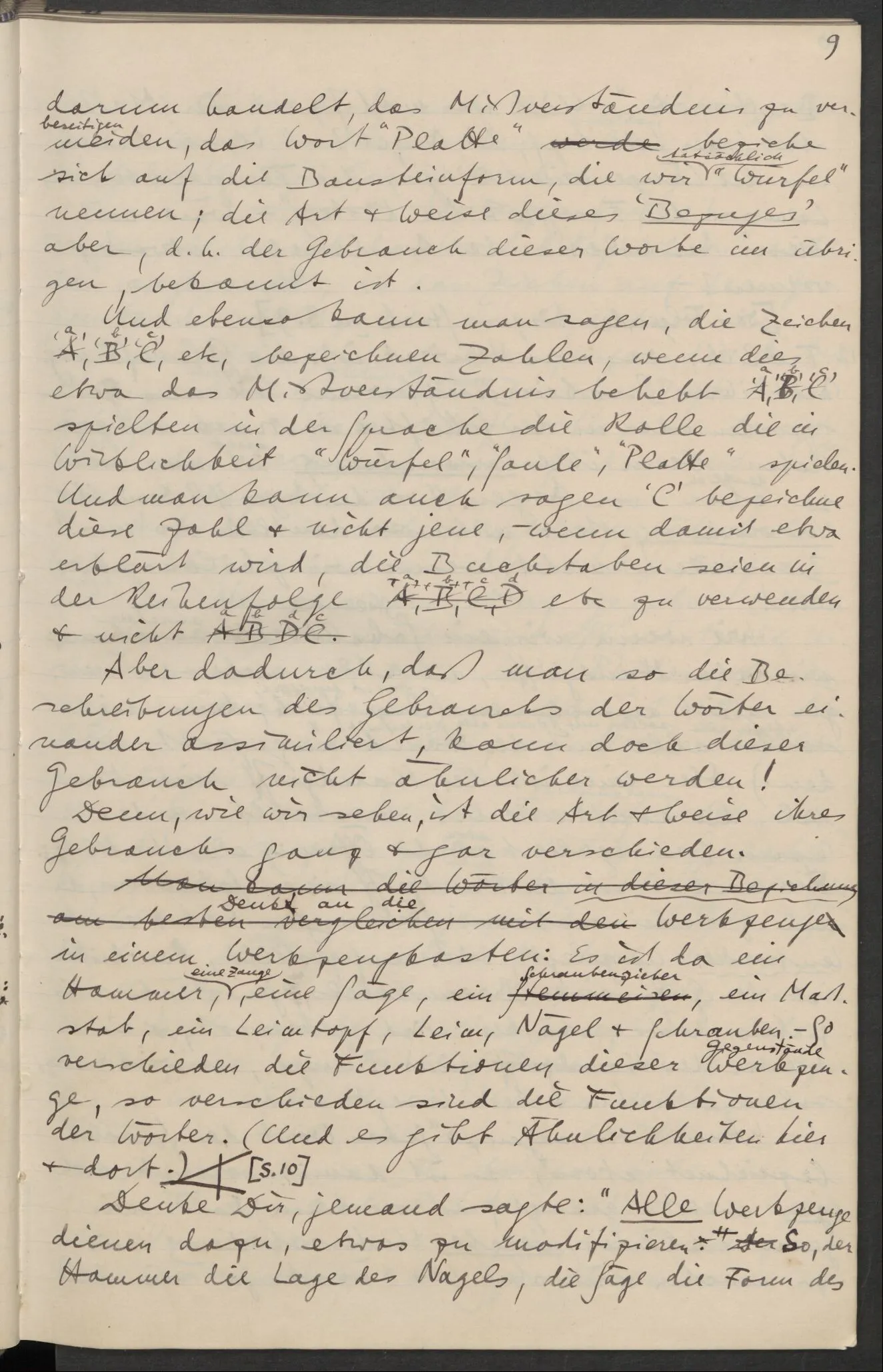 11 Was bezeichnen nun die Wörter dieser Sprache? – Was sie bezeichnen, – wie soll sich das zeigen, – es sei denn in der Art ihres Gebrauchs? Und den haben wir ja beschrieben. Der Ausdruck “dieses Wort bezeichnet das” müßte also ein Teil dieser Beschreibung werden. Oder: die Beschreibung soll auf die Form gebracht werden: “Das Wort … bezeichnet …”. Nun, man kann ja die Beschreibung der Verwendung des Wortes “Platte” dahin abkürzen, daß man sagt, dieses Wort bezeichne diesen Gegenstand. Das wird man tun, wenn es sich z.B. nur mehr darum handelt, das Mißverständnis zu vermeiden, das Wort “Platte” beziehe sich auf die Bausteinform, die wir tatsächlich “Würfel” nennen; die Art & Weise dieses ‘Bezuges’ aber, d.h. der Gebrauch dieser Worte im übrigen, bekannt ist. Und ebenso kann man sagen, die Zeichen a, b, c, etc. bezeichnen Zahlen, wenn dies etwa das Mißverständnis behebt a, b, c spielten in der Sprache die Rolle, die in Wirklichkeit “Würfel”, “Säule”, “Platte” spielen. Und man kann auch sagen ‘C’ bezeichne diese Zahl & nicht jene, – wenn damit etwa erklärt wird, die Buchstaben seien in der Reihenfolge a b c d etc. zu verwenden & nicht a b d c. Aber dadurch, daß man so die Beschreibungen des Gebrauchs der Wörter einander assimiliert, kann doch dieser Gebrauch nicht ähnlicher werden! Denn, wie wir sehen, ist die Art & Weise ihres Gebrauchs ganz & gar verschieden. Denk’ an die Werkzeuge in einem Werkzeugkasten: Es ist da ein Hammer, eine Zange, eine Säge, ein Schraubenzieher, ein Maßstab, ein Leimtopf, Leim, Nägel & Schrauben. – So verschieden die Funktionen dieser Werkzeuge, so verschieden sind die Funktionen der Wörter. (Und es gibt Ähnlichkeiten hier & dort.) 12