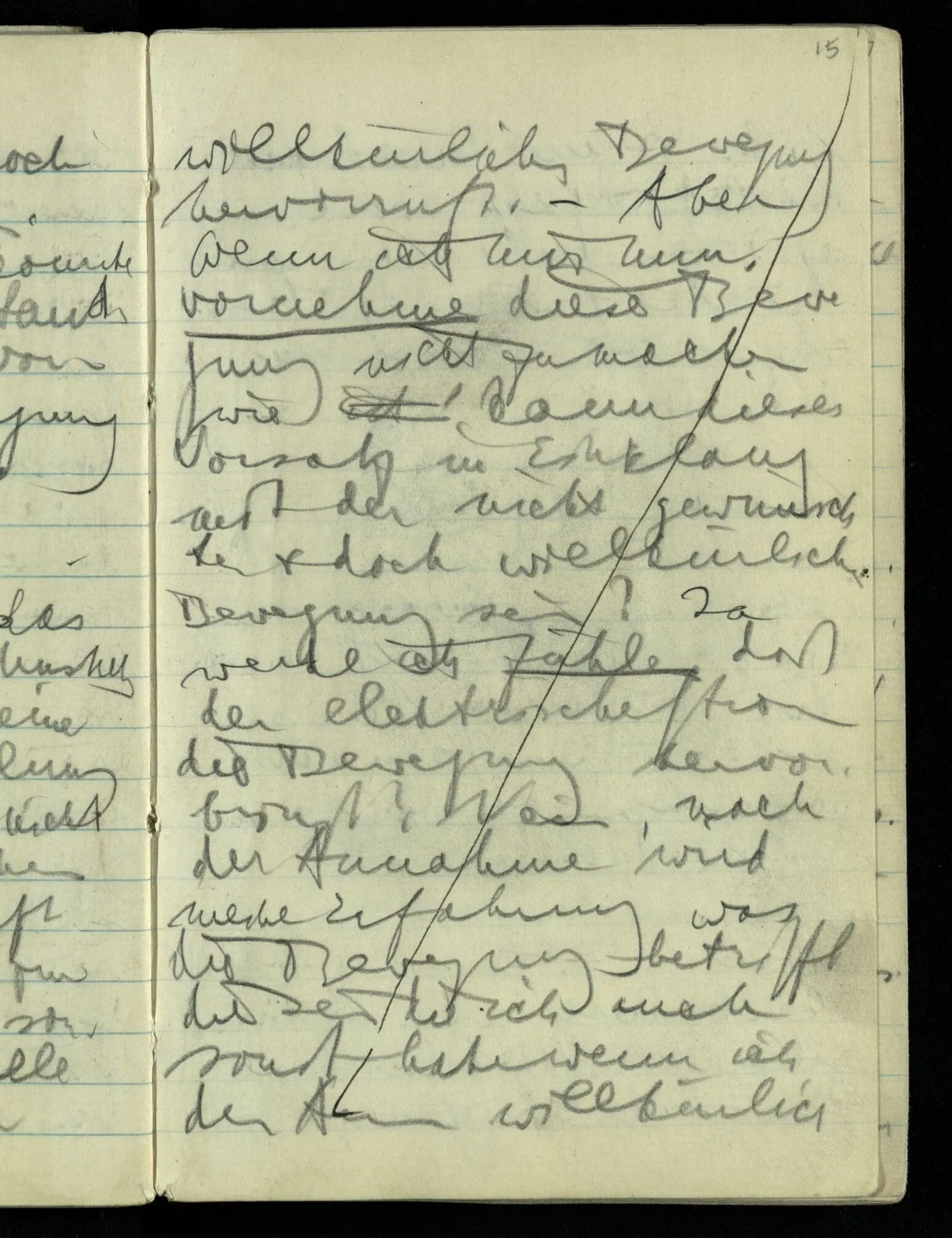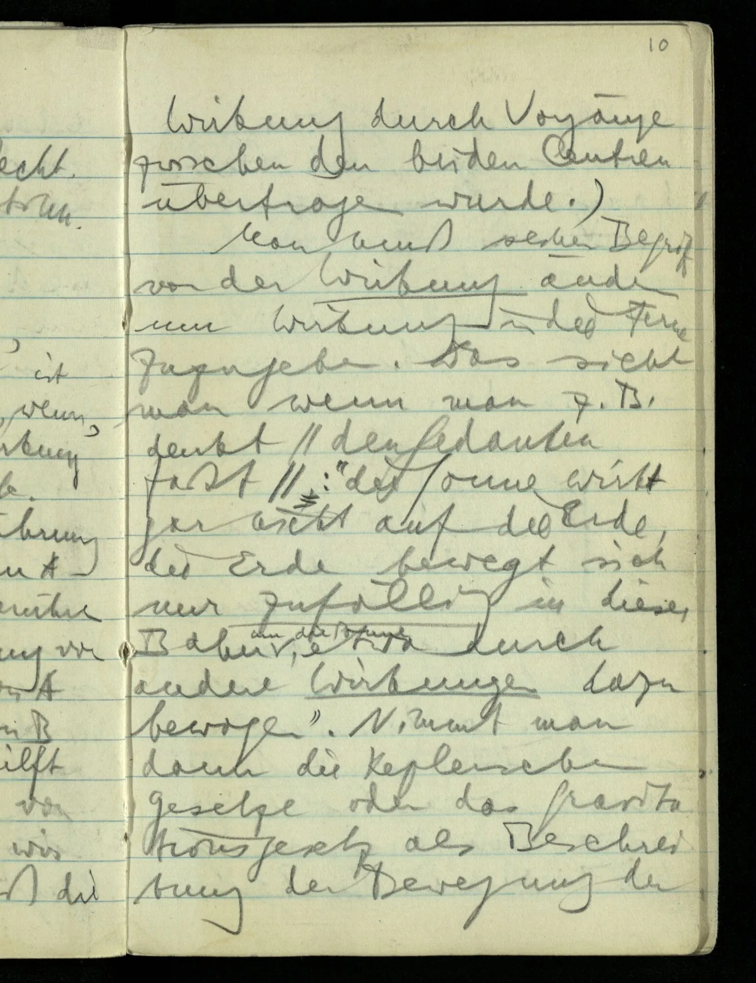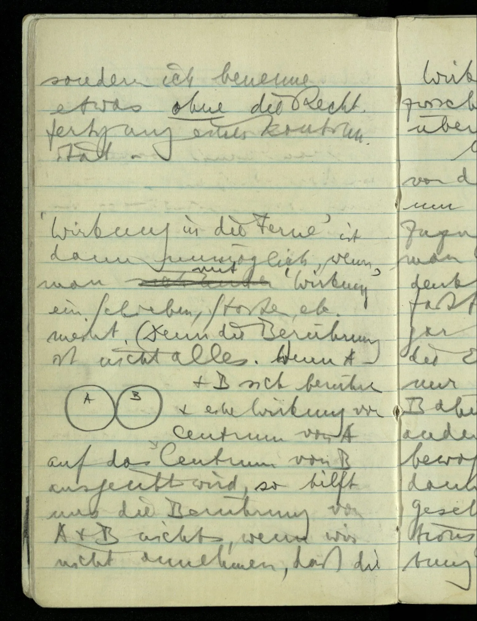 Wenn A & B sich berühren & eine Wirkung vom Zentrum von A auf das Zentrum von B ausgeübt wird, so hilft uns die Berührung von A & B nichts, wenn wir nicht annehmen, daß die Wirkung durch Vorgänge zwischen den beiden Zentren übertragen wurde.) Man muß seinen Begriff von der Wirkung ändern um Wirkung in die Ferne zuzugeben. Das sieht man wenn man z.B. denkt: “die Sonne wirkt gar nicht auf die Erde, die Erde bewegt sich nur zufällig in dieser Bahn um die Sonne, wird etwa durch andere Wirkungen dazu bewogen”. Nimmt man dann die Keplerschen Gesetze oder das Gravitationsgesetz als Beschreibung der Bewegung der Erde um die Sonne, was sie ja doch bleiben, dann ist die Schwierigkeit der Idee der Fernwirkung verschwunden.