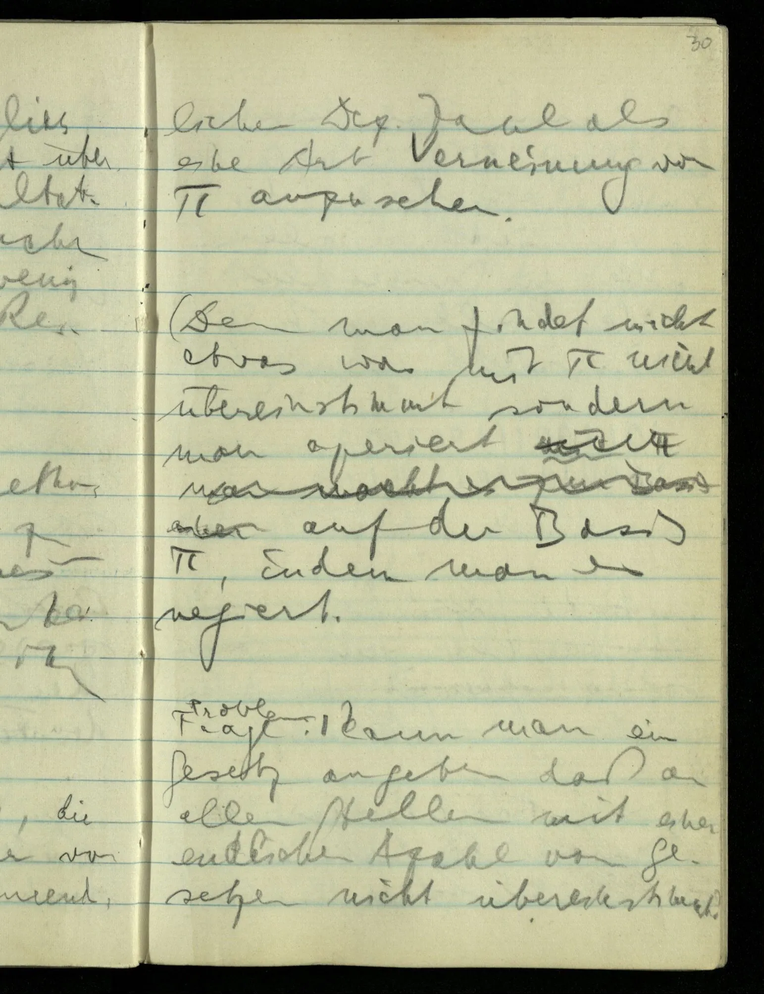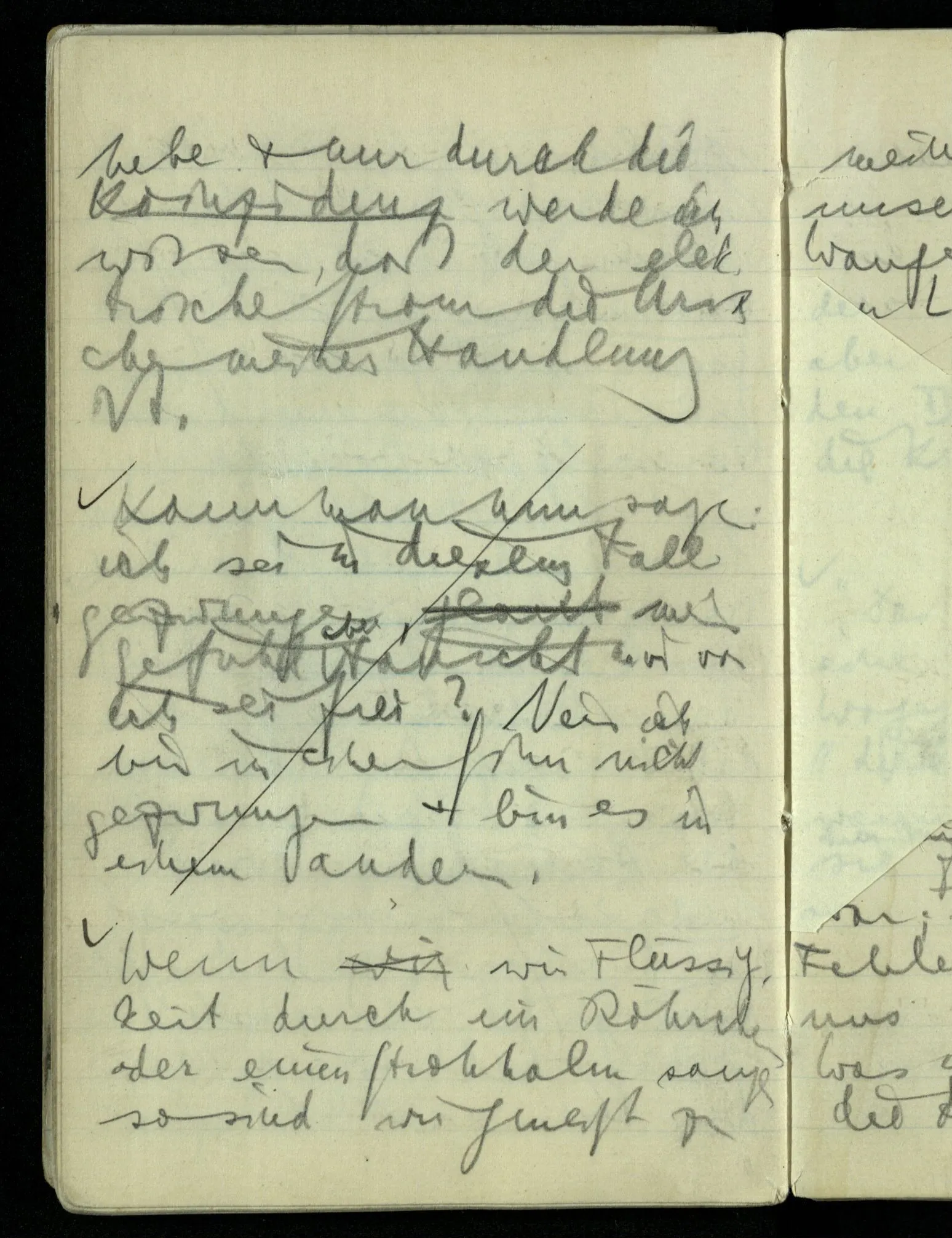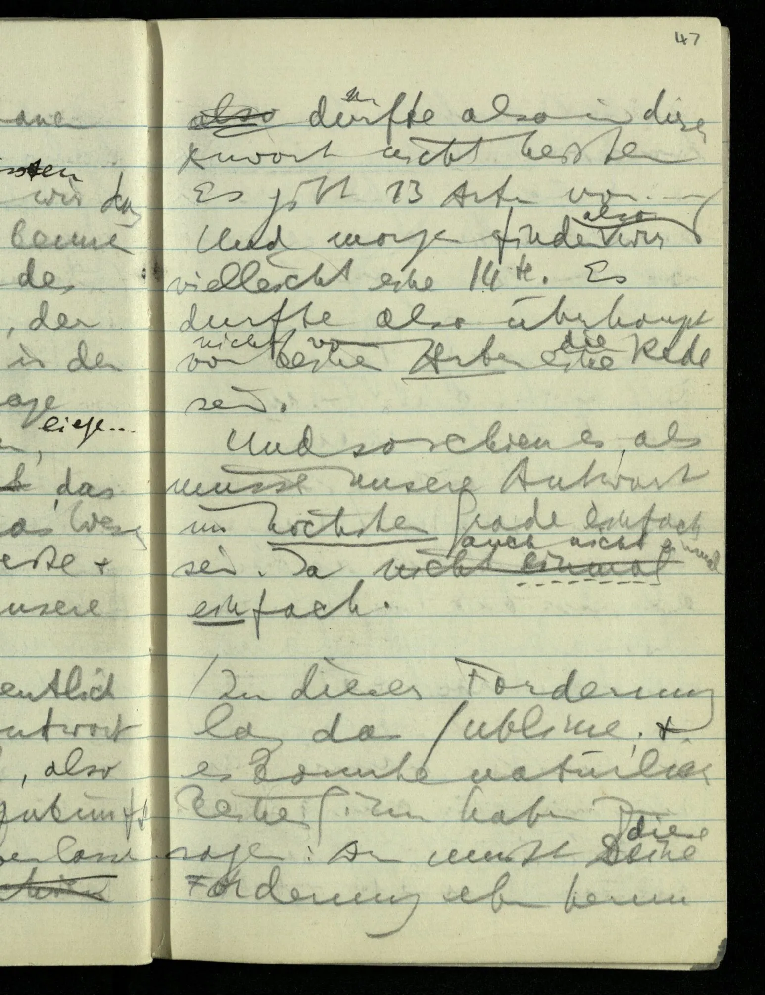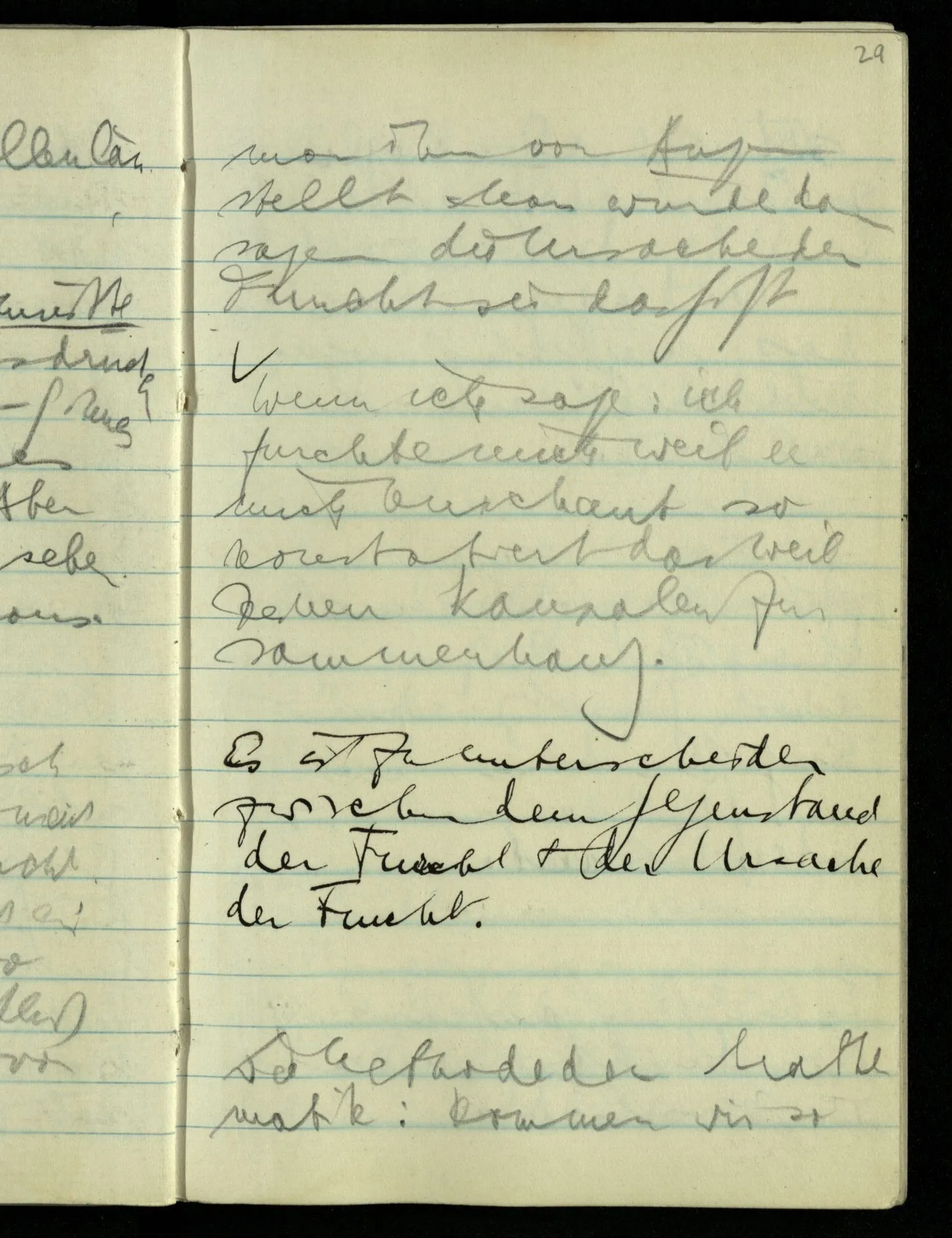 Wenn A & B sich berühren & eine Wirkung vom Zentrum von A auf das Zentrum von B ausgeübt wird, so hilft uns die Berührung von A & B nichts, wenn wir nicht annehmen, daß die Wirkung durch Vorgänge zwischen den beiden Zentren übertragen wurde.) Man muß seinen Begriff von der Wirkung ändern um Wirkung in die Ferne zuzugeben. Das sieht man wenn man z.B. denkt: “die Sonne wirkt gar nicht auf die Erde, die Erde bewegt sich nur zufällig in dieser Bahn um die Sonne, wird etwa durch andere Wirkungen dazu bewogen”. Nimmt man dann die Keplerschen Gesetze oder das Gravitationsgesetz als Beschreibung der Bewegung der Erde um die Sonne, was sie ja doch bleiben, dann ist die Schwierigkeit der Idee der Fernwirkung verschwunden.